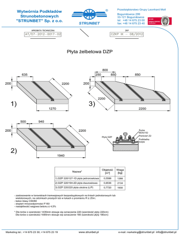 Przedsiębiorstwo Grupy Leonhard Moll Bogumiłowice 299 33-121 Bogumiłowice tel: +48 14 675 23 00 fax: +48 14 675 23 40 Strunobetonowych "STRUNBET" Sp. z o.o. APROBATA TECHNICZNA ZKP Płyta żelbetowa DZP 800 635 250 200 850 850 200 2200 2200 1) 3) 1270 500 2200 940 200 2200 Śruba M24x152 Pierścień Z2 Płyta DZP Podkładka ścięta 2) 1940 Nazwa* Objętość [m³] Waga [kg] 1) DZP 220/127-1D płyta jednorowkowa 0,5588 1398 2) DZP 220/194-2D płyta dwurowkowa 0,8536 2134 3) DZP 220/220 płyta ukośna (L/P) 0,7720 1930 - zastosowanie w torowiskach tramwajowych bezpodsypkowych na liniach jednotorowych lub wielotorowych, na odcinkach prostych lub w łukach o promieniu R ≥ 25m; - beton klasy C50/60 - stopień mrozoodporności F150 - nasiąkliwość wagowa betonu ≤ 4,5% * Dla torów o szerokości 1435mm stosuje się oznaczenie 220 (szerokość płyty 220cm) Dla torów o szerokości 1000mm stosuje się oznaczenie 180 (szerokość płyty 180cm) Marketing tel.: +14 675 23 30; +14 675 23 19 www.strunbet.pl e-mail: [email protected] [email protected]