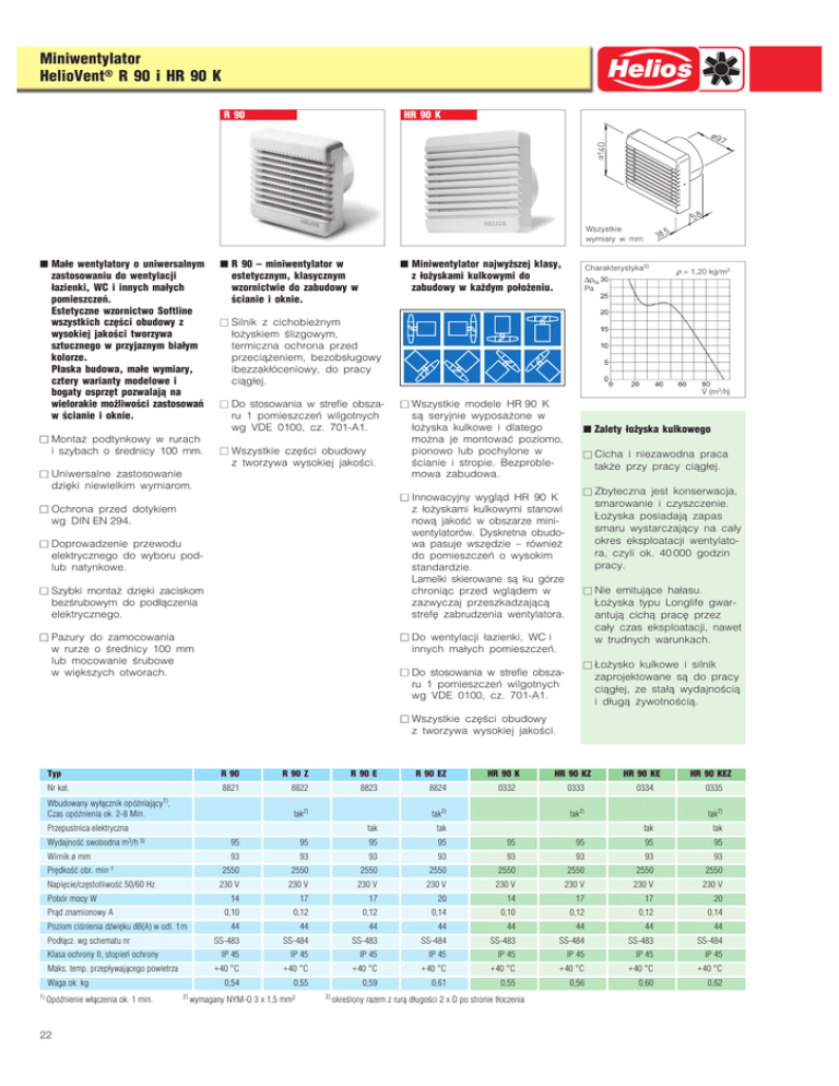 Miniwentylator HelioVent® R 90 i HR 90 K R 90 HR 90 K Wszystkie wymiary w mm ■ Małe wentylatory o uniwersalnym zastosowaniu do wentylacji łazienki, WC i innych małych pomieszczeń. Estetyczne wzornictwo Softline wszystkich części obudowy z wysokiej jakości tworzywa sztucznego w przyjaznym białym kolorze. Płaska budowa, małe wymiary, cztery warianty modelowe i bogaty osprzęt pozwalają na wielorakie możliwości zastosowań w ścianie i oknie. ■ Montaż podtynkowy w rurach i szybach o średnicy 100 mm. ■ R 90 – miniwentylator w estetycznym, klasycznym wzornictwie do zabudowy w ścianie i oknie. ■ Miniwentylator najwyższej klasy, z łożyskami kulkowymi do zabudowy w każdym położeniu. Charakterystyka3) ∆pfa Pa ■ Silnik z cichobieżnym łożyskiem ślizgowym, termiczna ochrona przed przeciążeniem, bezobsługowy ibezzakłóceniowy, do pracy ciągłej. ■ Do stosowania w strefie obsza− ru 1 pomieszczeń wilgotnych wg VDE 0100, cz. 701−A1. ■ Wszystkie części obudowy z tworzywa wysokiej jakości. ■ Uniwersalne zastosowanie dzięki niewielkim wymiarom. V· (m3/h) ■ Wszystkie modele HR 90 K są seryjnie wyposażone w łożyska kulkowe i dlatego można je montować poziomo, pionowo lub pochylone w ścianie i stropie. Bezproble− mowa zabudowa. ■ Zalety łożyska kulkowego ■ Innowacyjny wygląd HR 90 K z łożyskami kulkowymi stanowi nową jakość w obszarze mini− wentylatorów. Dyskretna obudo− wa pasuje wszędzie – również do pomieszczeń o wysokim standardzie. Lamelki skierowane są ku górze chroniąc przed wglądem w zazwyczaj przeszkadzającą strefę zabrudzenia wentylatora. ■ Ochrona przed dotykiem wg DIN EN 294. ■ Doprowadzenie przewodu elektrycznego do wyboru pod− lub natynkowe. ■ Szybki montaż dzięki zaciskom bezśrubowym do podłączenia elektrycznego. ■ Pazury do zamocowania w rurze o średnicy 100 mm lub mocowanie śrubowe w większych otworach. ρ = 1,20 kg/m3 ! Cicha i niezawodna praca także przy pracy ciągłej. ! Zbyteczna jest konserwacja, smarowanie i czyszczenie. Łożyska posiadają zapas smaru wystarczający na cały okres eksploatacji wentylato− ra, czyli ok. 40 000 godzin pracy. ! Nie emitujące hałasu. Łożyska typu Longlife gwar− antują cichą pracę przez cały czas eksploatacji, nawet w trudnych warunkach. ! Łożysko kulkowe i silnik zaprojektowane są do pracy ciągłej, ze stałą wydajnością i długą żywotnością. ■ Do wentylacji łazienki, WC i innych małych pomieszczeń. ■ Do stosowania w strefie obsza− ru 1 pomieszczeń wilgotnych wg VDE 0100, cz. 701−A1. ■ Wszystkie części obudowy z tworzywa wysokiej jakości. Typ R 90 R 90 Z R 90 E R 90 EZ Nr kat. 8821 8822 8823 8824 Wbudowany wyłącznik opóźniający1), Czas opóźnienia ok. 2−8 Min. tak2) 0332 HR 90 KZ 0333 HR 90 KE 0334 tak2) tak2) HR 90 KEZ 0335 tak2) tak tak tak tak Wydajność swobodna m3/h 3) 95 95 95 95 95 95 95 95 Wirnik ø mm 93 93 93 93 93 93 93 93 2550 2550 2550 2550 2550 2550 2550 2550 230 V 230 V 230 V 230 V 230 V 230 V 230 V 230 V 14 17 17 20 14 17 17 20 0,10 0,12 0,12 0,14 0,10 0,12 0,12 0,14 Przepustnica elektryczna Prędkość obr. min−1 Napięcie/częstotliwość 50/60 Hz Pobór mocy W Prąd znamionowy A Poziom ciśnienia dźwięku dB(A) w odl. 1 m Podłącz. wg schematu nr Klasa ochrony II, stopień ochrony Maks. temp. przepływającego powietrza Waga ok. kg 1) HR 90 K Opóźnienie włączenia ok. 1 min. 22 2) 44 44 44 44 44 44 44 44 SS−483 SS−484 SS−483 SS−484 SS−483 SS−484 SS−483 SS−484 IP 45 IP 45 IP 45 IP 45 IP 45 IP 45 IP 45 IP 45 +40 °C +40 °C +40 °C +40 °C +40 °C +40 °C +40 °C +40 °C 0,54 0,55 0,59 0,61 0,55 0,56 0,60 0,62 wymagany NYM−O 3 x 1,5 mm2 3) określony razem z rurą długości 2 x D po stronie tłoczenia Miniwentylator R 90 i HR 90 K Osprzęt Możliwy montaż w strefie 1 (wg DIN VDE 0100−cz. 701−A1). ■ Piękne i czyste Ponieważ każdy wentylator wcześniej czy później ulega zabrudzeniu, osłona HR 90 K została tak opracowana, aby zaoszczędzić użytkownikowi tego widoku. Wykonanie osłony całkowicie zasłania strefę zabrudzenia wentylato− ra. ■ Montaż bez śrub HR 90 K.. dysponują bezśru− bowymi zaciskami do podłączenia elektrycznego. Osłona zakładana jest szybko dzięki zatrzaskom. Pazury boczne upraszczają montaż w rurach ø 100 mm. ■ Znaki kontrolne Osłona montażowa MBR 90/160/300 Nr kat. 0281 Z białego tworzywa wysokiej jakości, odpornego na uderze− nia. Idealna do zastosowań przy remoncie starych mieszkań. Przy pomocy płyty można zamon− tować wszystkie modele HR 90 K.. w istniejące prostokątne otwory szybów. Po zamalowaniu lub zatapetowaniu staje się niewi− doczna. Kołnierz montażowy Typ MF 90 Nr kat. 0819 Zastosowanie: 1. Przy zabudowie w suficie wymagany. Zapobiega dosta− waniu się do wentylatora kon− densatu z pionowych szybów. 2. Do wygodnego montażu elektr. przewodów podłączeniowych przy niedogodnym wylocie ze ściany, gdyż wentylator odsu− wa się od ściany o 23 mm. 3. Do wygodnego montażu wen− tylatora w ciasnych szybach. Przy kolanie 90° z krótkim podłączeniem rurowym, MF skraca głębokość zabudowy wentylatora. 4. Do wbudowania w cienkie ściany można głębokość zabudowy zmniejszyć nastę− pująco: przy 1 kołnierzu do 35 mm. przy 2 kołnierzach do 70 mm. Kolor: biel alpejska ■ 140 0 38 Wymiary w mm ■ 140 Stre fa 2 Stre fa 3 15 – 12 38 Wymiary w mm 276 Stre fa 0 Zestaw do montażu w oknie Typ FES 90 Nr kat. 0462 Do montażu wszystkich modeli R 90 i HR 90 K.. (szczególnie z przepustnicą elektryczną) w oknach pojedynczych i podwójnych, cienkich ścianach i płytach. Możliwa grubość szyby / ściany od 1 do 40 mm. Osłona zewnętrzna w postaci płaskiej czerpni o grubości jedynie 29 mm. Obsługa za pomocą wyłącznika sznurowego. 0– 20 ø 103 Stre fa 1 ■9 1 ø 4,5 ± 0,1 ■ Do zastosowań w strefie 1 Wszystkie modele R 90 i HR 90 K.. posia