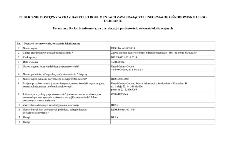 PUBLICZNIE DOSTĘPNY WYKAZ DANYCH O DOKUMENTACH ZAWIERAJĄCYCH INFORMACJE O ŚRODOWISKU I JEGO OCHRONIE Formularz B – karta informacyjna dla: decyzji i postanowień, wskazań lokalizacyjnych Lp. Decyzje i postanowienia, wskazania lokalizacyjne 1 Numer wpisu RIOS.FormB-0010/14 2 Zakres przedmiotowy decyzji/postanowienia * Zezwolenie na usunięcie drzew z działki o numerze 1486/145 obręb Skrzyszów 3 Znak sprawy BU.BS.6131.0010.2014 4 Data wydania 16.01.2014r. 5 Nazwa organu, który wydał decyzję/postanowienie* Urząd Gminy Godów 44-340 Godów, ul. 1 Maja 53 6 Nazwa podmiotu, którego decyzja/postanowienie * dotyczy 7 Numer wpisu wniosku dotyczącego decyzji/postanowienia* RIOS.0010.2014 8 Miejsce przechowywania ( nazwa instytucji, nazwa komórki organizacyjnej, numer pokoju, numer telefonu kontaktowego) Urząd Gminy Godów, Rejestr informacji o Środowisku – Formularz B ul. 1 Maja 53, 44-340 Godów pokój nr 23, 324765065 9 Informacja, czy decyzja/postanowienie* jest ostateczne oraz adnotacje o ewentualnym wstrzymaniu wykonania decyzji/postanowienia* lub o dokonanych w nich zmianach OSTATECZNA 10 Zastrzeżenia dotyczące nieudostępniania informacji BRAK 11 Numer innych kart dotyczących podmiotu, którego dotyczy decyzja/postanowienie* RIOS.FormA-0010/14 12 Uwagi BRAK 18 Uwagi