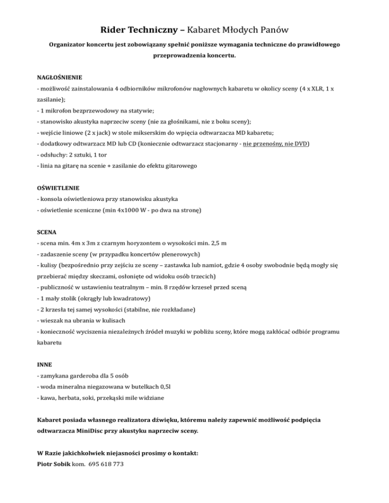 Rider Techniczny – Kabaret Młodych Panów Organizator koncertu jest zobowiązany spełnić poniższe wymagania techniczne do prawidłowego przeprowadzenia koncertu. NAGŁOŚNIENIE - możliwość zainstalowania 4 odbiorników mikrofonów nagłownych kabaretu w okolicy sceny (4 x XLR, 1 x zasilanie); - 1 mikrofon bezprzewodowy na statywie; - stanowisko akustyka naprzeciw sceny (nie za głośnikami, nie z boku sceny); - wejście liniowe (2 x jack) w stole mikserskim do wpięcia odtwarzacza MD kabaretu; - dodatkowy odtwarzacz MD lub CD (koniecznie odtwarzacz stacjonarny - nie przenośny, nie DVD) - odsłuchy: 2 sztuki, 1 tor - linia na gitarę na scenie + zasilanie do efektu gitarowego OŚWIETLENIE - konsola oświetleniowa przy stanowisku akustyka - oświetlenie sceniczne (min 4x1000 W - po dwa na stronę) SCENA - scena min. 4m x 3m z czarnym horyzontem o wysokości min. 2,5 m - zadaszenie sceny (w przypadku koncertów plenerowych) - kulisy (bezpośrednio przy zejściu ze sceny – zastawka lub namiot, gdzie 4 osoby swobodnie będą mogły się przebierać między skeczami, osłonięte od widoku osób trzecich) - publiczność w ustawieniu teatralnym – min. 8 rzędów krzeseł przed sceną - 1 mały stolik (okrągły lub kwadratowy) - 2 krzesła tej samej wysokości (stabilne, nie rozkładane) - wieszak na ubrania w kulisach - konieczność wyciszenia niezależnych źródeł muzyki w pobliżu sceny, które mogą zakłócać odbiór programu kabaretu INNE - zamykana garderoba dla 5 osób - woda mineralna niegazowana w butelkach 0,5l - kawa, herbata, soki, przekąski mile widziane Kabaret posiada własnego realizatora dźwięku, któremu należy zapewnić możliwość podpięcia odtwarzacza MiniDisc przy akustyku naprzeciw sceny. W Razie jakichkolwiek niejasności prosimy o kontakt: Piotr Sobik kom. 695 618 773