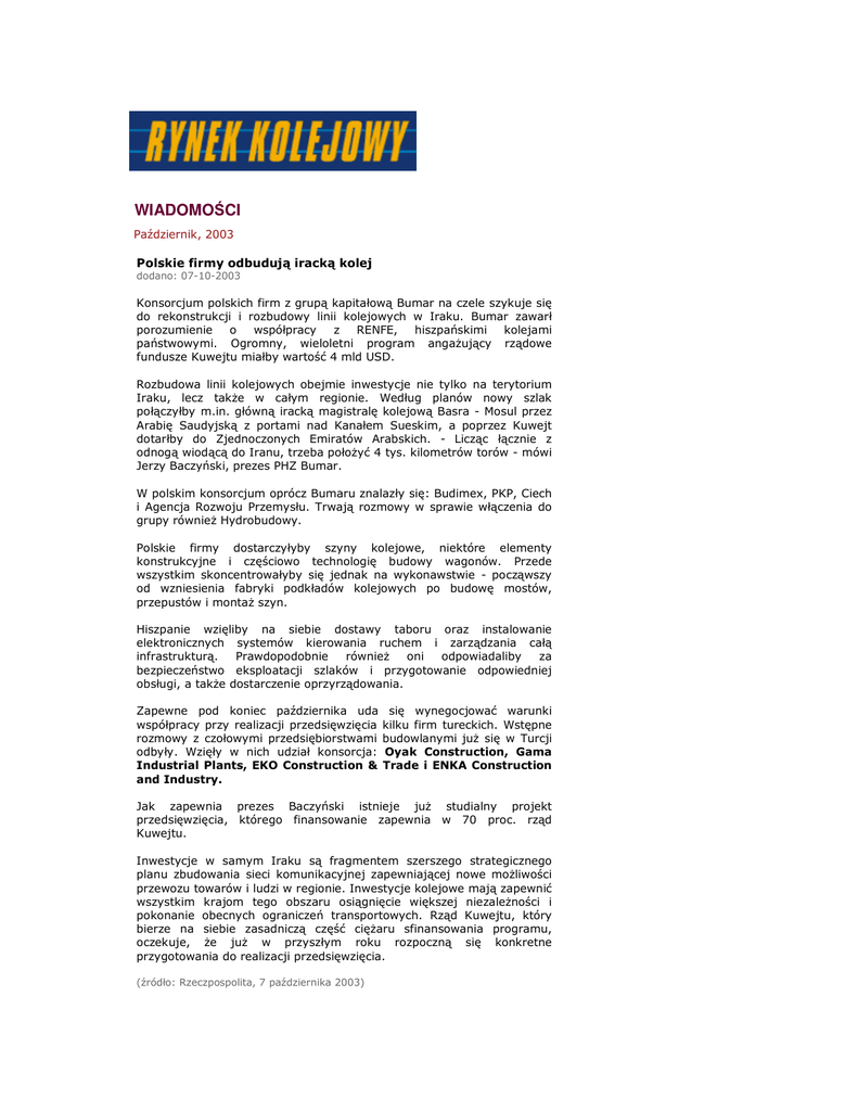 WIADOMOŚCI Październik, 2003 Polskie firmy odbudują iracką kolej dodano: 07-10-2003 Konsorcjum polskich firm z grupą kapitałową Bumar na czele szykuje się do rekonstrukcji i rozbudowy linii kolejowych w Iraku. Bumar zawarł porozumienie o współpracy z RENFE, hiszpańskimi kolejami państwowymi. Ogromny, wieloletni program angaŜujący rządowe fundusze Kuwejtu miałby wartość 4 mld USD. Rozbudowa linii kolejowych obejmie inwestycje nie tylko na terytorium Iraku, lecz takŜe w całym regionie. Według planów nowy szlak połączyłby m.in. główną iracką magistralę kolejową Basra - Mosul przez Arabię Saudyjską z portami nad Kanałem Sueskim, a poprzez Kuwejt dotarłby do Zjednoczonych Emiratów Arabskich. - Licząc łącznie z odnogą wiodącą do Iranu, trzeba połoŜyć 4 tys. kilometrów torów - mówi Jerzy Baczyński, prezes PHZ Bumar. W polskim konsorcjum oprócz Bumaru znalazły się: Budimex, PKP, Ciech i Agencja Rozwoju Przemysłu. Trwają rozmowy w sprawie włączenia do grupy równieŜ Hydrobudowy. Polskie firmy dostarczyłyby szyny kolejowe, niektóre elementy konstrukcyjne i częściowo technologię budowy wagonów. Przede wszystkim skoncentrowałyby się jednak na wykonawstwie - począwszy od wzniesienia fabryki podkładów kolejowych po budowę mostów, przepustów i montaŜ szyn. Hiszpanie wzięliby na siebie dostawy taboru oraz instalowanie elektronicznych systemów kierowania ruchem i zarządzania całą infrastrukturą. Prawdopodobnie równieŜ oni odpowiadaliby za bezpieczeństwo eksploatacji szlaków i przygotowanie odpowiedniej obsługi, a takŜe dostarczenie oprzyrządowania. Zapewne pod koniec października uda współpracy przy realizacji przedsięwzięcia rozmowy z czołowymi przedsiębiorstwami odbyły. Wzięły w nich udział konsorcja: Industrial Plants, EKO Construction & and Industry. się wynegocjować warunki kilku firm tureckich. Wstępne budowlanymi juŜ się w Turcji Oyak Construction, Gama Trade i ENKA Construction Jak zapewnia prezes Baczyński istnieje juŜ studialny projekt przedsięwzięcia, którego finansowanie zapewnia w 70 proc. rząd Kuwejtu. Inwestycje w samym Iraku są fragmentem szerszego strategicznego planu zbudowania sieci komunikacyjnej zapewniającej nowe moŜliwości przewozu towarów i ludzi w regionie. Inwestycje kolejowe mają zapewnić wszystkim krajom tego obszaru osiągnięcie większej niezaleŜności i pokonanie obecnych ograniczeń transportowych. Rząd Kuwejtu, który bierze na siebie zasadniczą część cięŜaru sfinansowania programu, oczekuje, Ŝe juŜ w przyszłym roku rozpoczną się konkretne przygotowania do realizacji przedsięwzięcia. (źródło: Rzeczpospolita, 7 października 2003)