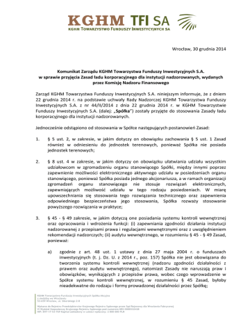 Wrocław, 30 grudnia 2014 Komunikat Zarządu KGHM Towarzystwa Funduszy Inwestycyjnych S.A. w sprawie przyjęcia Zasad ładu korporacyjnego dla instytucji nadzorowanych, wydanych przez Komisję Nadzoru Finansowego Zarząd KGHM Towarzystwa Funduszy Inwestycyjnych S.A. niniejszym informuje, że z dniem 22 grudnia 2014 r. na podstawie uchwały Rady Nadzorczej KGHM Towarzystwa Funduszy Inwestycyjnych S.A. z nr 44/II/2014 z dnia 22 grudnia 2014 r. w KGHM Towarzystwie Funduszy Inwestycyjnych S.A. (dalej: „Spółka”) zostały przyjęte do stosowania Zasady ładu korporacyjnego dla instytucji nadzorowanych. Jednocześnie odstąpiono od stosowania w Spółce następujących postanowień Zasad: 1. § 5 ust. 2, w zakresie, w jakim dotyczy on obowiązku zachowania § 5 ust. 1 Zasad również w odniesieniu do jednostek terenowych, ponieważ Spółka nie posiada jednostek terenowych; 2. § 8 ust. 4 w zakresie, w jakim dotyczy on obowiązku ułatwiania udziału wszystkim udziałowcom w zgromadzeniu organu stanowiącego Spółki, między innymi poprzez zapewnienie możliwości elektronicznego aktywnego udziału w posiedzeniach organu stanowiącego, ponieważ Spółka posiada jednego akcjonariusza, a w ramach organizacji zgromadzeń organu stanowiącego nie stosuje rozwiązań elektronicznych, zapewniających możliwość udziału w tego rodzaju posiedzeniach. W miarę upowszechniania się stosowania tego rozwiązania technicznego oraz zapewnienia odpowiedniego bezpieczeństwa jego stosowania, Spółka rozważy stosowanie powyższego rozwiązania w praktyce; 3. § 45 - § 49 zakresie, w jakim dotyczą one posiadania systemu kontroli wewnętrznej oraz opracowania i wdrożenia funkcji: (i) zapewniania zgodności działania instytucji nadzorowanej z przepisami prawa i regulacjami wewnętrznymi oraz z uwzględnieniem rekomendacji nadzorczych; (ii) audytu wewnętrznego, w rozumieniu § 45 - § 49 Zasad, ponieważ: a) zgodnie z art. 48 ust. 1 ustawy z dnia 27 maja 2004 r. o funduszach inwestycyjnych (t. j. Dz. U. z 2014 r., poz. 157) Spółka nie jest obowiązana do tworzenia systemu kontroli wewnętrznej (nadzoru zgodności działalności z prawem oraz audytu wewnętrznego), natomiast Zasady nie naruszają praw i obowiązków, wynikających z przepisów prawa, wobec czego wprowadzenie w Spółce systemu kontroli wewnętrznej, w rozumieniu § 45 Zasad, byłoby nieadekwatne do rodzaju i formy prowadzonej działalności przez Spółkę; KGHM Towarzystwo Funduszy Inwestycyjnych Spółka Akcyjna z siedzibą we Wrocławiu 53-659 Wrocław, ul. Sikorskiego 2-8 Wpisana do Rejestru Przedsiębiorców Krajowego Rejestru Sądowego przez Sąd Rejonowy dla Wrocławia Fabrycznej VI Wydział Gospodarczy Krajowego Rejestru Sądowego pod numerem KRS 0000332428 NIP: 897-17-53-769 Kapitał zakładowy w całości wpłacony: 2 800 000 PLN b) na podstawie § 45 Zasad system kontroli wewnętrznej powinien być adekwatny, efektywny i skuteczny, natomiast Spółka posiada adekwatny do skali prowadzonej działalności, efektywny i skuteczny system, realizowany w ramach funkcji Inspektora Nadzoru, nadzorowanego w tym zakresie przez Prezesa Zarządu. Należy podkreślić, że opracowany i wdrożony w Spółce system, polegający na kontroli zgodności działalności Spółki z aktami prawnymi oraz regulacjami i procedurami obowiązującymi w Spółce, został dostosowany do rodzaju i zakresu działalności prowadzonej przez Spółkę, którą stanowi zarządzanie wyłącznie funduszami inwestycyjnym zamkniętymi aktywów niepublicznych. Zadania i obowiązki, które są w tym zakresie realizowane odpowiadają przepisom rozporządzenia Ministra Finansów z dnia 30 kwietnia 2013 r. w sprawie sposobu, trybu oraz warunków prowadzenia działalności przez towarzystwa funduszy inwestycyjnych (Dz. U. poz. 538) w szczególności, w zakresie zapewnienia prawidłowości procedur, rzetelnego raportowania zewnętrznego i wewnętrznego, a także zgodności działania z przepisami prawa i regulacjami wewnętrznymi oraz z uwzględnieniem rekomendacji nadzorczych. W związku z powyższym, Spółka uznaje, że stosowane podejście, w zakresie systemu kontroli wewnętrznej, całkowicie realizuje wymogi, wynikające z art. 48 ust. 1 ustawy o funduszach inwestycyjnych, a w konsekwencji dyspozycje przewidziane w § 45 – § 49 Zasad; Do kompletnego wdrożenia (z ww. odstępstwami) Zasad do stosowania w KGHM TFI konieczne jest zatwierdzenie przez organ stanowiący Spółki niezbędnych zmian w Statucie oraz Regulaminie Rady Nadzorczej Spółki. Zarząd Spółki dnia 23 grudnia 2014 złożył wniosek do akcjonariusza o zmianę tych dokumentów. Zatwierdzenie zmian przez Walne Zgromadzenie Akcjonariuszy Spółki spodziewane jest do końca I kwartału 2015 r. Równocześnie Zarząd oczekuje na zatwierdzenie przez Radę Nadzorczą nowego Regulaminu Organizacyjnego Spółki, co spodziewane jest do końca stycznia 2015 r. Na akceptację RN i WZA Spółki oczekują zmiany w regulacjach odnoszących się do: § 1 ust. 3, § 5 ust. 1, § 6, § 27 oraz § 52 ust. 1 Zasad. Z poważaniem, Łukasz Chojnacki Prezes Zarządu KGHM TFI S.A. Robert Rozmus Wiceprezes Zarządu KGHM TFI S.A.