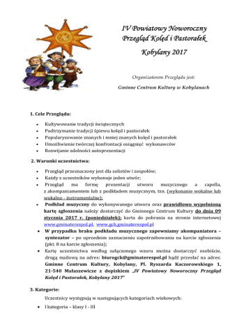 IV Powiatowy Noworoczny Przegląd Kolęd i Pastorałek Kobylany 2017 Organizatorem Przeglądu jest: Gminne Centrum Kultury w Kobylanach 1. Cele Przeglądu: Kultywowanie tradycji świątecznych Podtrzymanie tradycji śpiewu kolęd i pastorałek Popularyzowanie znanych i mniej znanych kolęd i pastorałek Umożliwienie twórczej konfrontacji osiągnięć wykonawców Rozwijanie zdolności autoprezentacji 2. Warunki uczestnictwa: Przegląd przeznaczony jest dla solistów i zespołów; Każdy z uczestników wykonuje jeden utwór; Przegląd ma formę prezentacji utworu muzycznego a capella, z akompaniamentem lub z podkładem muzycznym, tzn. (wykonanie wokalne lub wokalno - instrumentalne); Podkład muzyczny do wykonywanego utworu oraz prawidłowo wypełnioną kartę zgłoszenia należy dostarczyć do Gminnego Centrum Kultury do dnia 09 stycznia 2017 r. (poniedziałek); karta do pobrania na stronie internetowej www.gminaterespol.pl, www.gck.gminaterespol.pl W przypadku braku podkładu muzycznego zapewniamy akompaniatora – syntezator – po uprzednim zaznaczeniu zapotrzebowania na karcie zgłoszenia (pkt. 8 na karcie zgłoszenia); Kartę uczestnictwa według załączonego wzoru można dostarczyć osobiście, drogą mailową na adres: [email protected] bądź przesłać na adres: Gminne Centrum Kultury, Kobylany, Pl. Ryszarda Kaczorowskiego 1, 21-540 Małaszewicze z dopiskiem „IV Powiatowy Noworoczny Przegląd Kolęd i Pastorałek, Kobylany 2017” 3. Kategorie: Uczestnicy występują w następujących kategoriach wiekowych: I kategoria – klasy I - III II kategoria – IV – VI III kategoria – gimnazjum IV kategoria – ponadgimnazjalne i starsze V kategoria - Zespoły 4. Termin: Przegląd odbędzie się 15.01.2017r. o godzinie 12.00 w Sali konferencyjnej Urzędu Gminy Terespol, piętro II 5. Kryteria oceny Wykonawców będzie oceniać komisja powołana przez Dyrektora Gminnego Centrum Kultury według następujących kryteriów: walory głosowe własną interpretację kolęd i pastorałek muzykalność poczucie rytmu dobór repertuaru ogólny wyraz artystyczny (osobowość sceniczna i muzykalność) 6. Nagrody i wyróżnienia: W poszczególnych kategoriach zostaną przyznane nagrody za zajęcie miejsca I, II oraz III, Dodatkowo Organizator przewiduje wyróżnienia w każdej kategorii. Wszyscy uczestnicy Przeglądu otrzymają pamiątkowe dyplomy. 7. Postanowienia końcowe: Indywidualne występy osób nie zgłoszonych do Przeglądu w terminie lub osób nie klasyfikujących się do poszczególnych kategorii wymienionych w pkt. 3 Regulaminu, nie będą oceniane przez Komisję Konkursową. Organizatorzy zapewniają nagłośnienie i sprzęt odtwarzający, ewentualnie akompaniament (po wcześniejszym ustaleniu z Organizatorem). Występ z akompaniamentem na żywo; Uczestnicy Przeglądu występują wg kolejności zgłoszeń do poszczególnej kategorii; Regulamin Przeglądu znajduje się na stronie internetowej www.gminaterespol.pl, www.gck.gminaterespol.pl; O wszelkich zmianach dotyczących czasu, miejsca i przebiegu Przeglądu zainteresowani zostaną wcześniej powiadomieni; Wszelkich wyjaśnień oraz kwestii indywidualnych ocen każdego występu udziela Komisja Konkursowa przez 30 minut po zakończeniu Przeglądu i ogłoszeniu wyników. Wszystkie osoby biorące udział w IV Przeglądzie Kolęd i Pastorałek wyrażają zgodę na fotografowanie, rejestrowanie wizerunku, a tym samym publikowanie go podczas organizowanych przez Gminne Centrum Kultury imprez oraz wykorzystanie tego wizerunku poprzez umieszczanie zdjęć na stronach internetowych UG Terespol, GCK w Kobylanach oraz lokalnych portalach czy czasopismach informacyjnych, w celu informacji i promocji działalności Gminnego Centrum Kultury. Wszelkich informacji dotyczących konkursu udzielają: Pani Magdalena Jaszczuk – tel. 83-411-20-63 oraz Pan Mariusz Siwagow – tel. 83-411-20-66, od poniedziałku do piątku, w godzinach 8.00 – 15.00. Organizator zastrzega sobie prawo do zmian w Regulaminie.