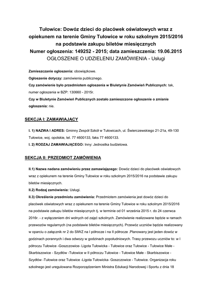 Tułowice: Dowóz dzieci do placówek oświatowych wraz z opiekunem na terenie Gminy Tułowice w roku szkolnym 2015/2016 na podstawie zakupu biletów miesięcznych Numer ogłoszenia: 149252 - 2015; data zamieszczenia: 19.06.2015 OGŁOSZENIE O UDZIELENIU ZAMÓWIENIA - Usługi Zamieszczanie ogłoszenia: obowiązkowe. Ogłoszenie dotyczy: zamówienia publicznego. Czy zamówienie było przedmiotem ogłoszenia w Biuletynie Zamówień Publicznych: tak, numer ogłoszenia w BZP: 130660 - 2015r. Czy w Biuletynie Zamówień Publicznych zostało zamieszczone ogłoszenie o zmianie ogłoszenia: nie. SEKCJA I: ZAMAWIAJĄCY I. 1) NAZWA I ADRES: Gminny Zespół Szkół w Tułowicach, ul. Świerczewskiego 21-21a, 49-130 Tułowice, woj. opolskie, tel. 77 4600133, faks 77 4600133. I. 2) RODZAJ ZAMAWIAJĄCEGO: Inny: Jednostka budżetowa. SEKCJA II: PRZEDMIOT ZAMÓWIENIA II.1) Nazwa nadana zamówieniu przez zamawiającego: Dowóz dzieci do placówek oświatowych wraz z opiekunem na terenie Gminy Tułowice w roku szkolnym 2015/2016 na podstawie zakupu biletów miesięcznych. II.2) Rodzaj zamówienia: Usługi. II.3) Określenie przedmiotu zamówienia: Przedmiotem zamówienia jest dowóz dzieci do placówek oświatowych wraz z opiekunem na terenie Gminy Tułowice w roku szkolnym 2015/2016 na podstawie zakupu biletów miesięcznych tj. w terminie od 01 września 2015 r. do 24 czerwca 2016r. - z wyłączeniem dni wolnych od zajęć szkolnych. Zamówienie realizowane będzie w ramach przewozów regularnych (na podstawie biletów miesięcznych). Przewóz uczniów będzie realizowany w oparciu o załącznik nr 2 do SIWZ na I półrocze i na II półrocze .Planowany jest jeden dowóz w godzinach porannych i dwa odwozy w godzinach popołudniowych. Trasy przewozu uczniów to: w I półroczu Tułowice -Goszczowice- Ligota Tułowicka - Tułowice oraz Tułowice - Tułowice Małe Skarbiszowice - Szydłów -Tułowice w II półroczu Tułowice - Tułowice Małe - Skarbiszowice Szydłów -Tułowice oraz Tułowice -Ligota Tułowicka- Goszczowice - Tułowice. Organizacja roku szkolnego jest uregulowana Rozporządzeniem Ministra Edukacji Narodowej i Sportu z dnia 18 kwietnia 2002 roku w sprawie organizacji roku szkolnego (Dz.U. z 2002 r. Nr 46, poz. 432 z późn.zm.).i tak: MIEJSCOWOŚĆ - ILOŚĆ UCZNIÓW Skarbiszowice - 13 Szydłów - 28 Goszczowie - 23 OGÓŁEM 64 uczniów MIEJSCOWOŚĆ - ILOŚĆ UCZNIÓW Skarbiszowice - 1 Szydłów - 1 Goszczowice - 1 OGÓŁEM 3 uczniów Razem 67 uczniów dojeżdżających. Podane liczby uczniów są liczbami aktualnymi na dzień ogłoszenia o zamówieniu publicznym i w trakcie roku szkolnego mogą ulec zmianie. Wykonawca zapewnia opiekę nad uczniami w czasie dowozu/odwozu do szkoły. Z przewozów będą korzystać dzieci przedszkolne, uczniowie szkoły podstawowej oraz gimnazjalnej na podstawie biletów miesięcznych wydanych przez Wykonawcę na podstawie otrzymanych od dyrektorów placówek imiennych list uczniów uprawnionych do dowozu. Kontrolę uprawnień przejazdu osób korzystających z przewozów umownych wykonuje opiekun. Dopuszcza się przejazdy uczniów , którzy nie są uprawnieni do korzystania z bezpłatnego dowozu oraz sprzedaż im biletów. Osoby zatrudnione do sprawowania opieki muszą posiadać odpowiednie kwalifikacje. Opiekunem uczniów nie może być kierowca autobusu. Opiekun autobusu szkolnego ponosi odpowiedzialność za uczniów dowożonych od chwili wejścia uczniów do autobusu do chwili przekazania ich szkole oraz od chwili odebrania ich ze szkoły do chwili opuszczenia przez uczniów autobusu na przystanku w swojej miejscowości. Za bezpieczeństwo uczniów dochodzących do autobusu oraz powracających do domu po przywozie do swojej miejscowości odpowiedzialność ponoszą ich rodzice / prawni opiekunowie/. Podczas dowozu opiekun odprowadza uczniów dowożonych pod drzwi wejściowe do szkoły i przekazuje ich wyznaczonemu przez dyrektora szkoły nauczycielowi dyżurnemu. Podczas odwozów opiekun szkolnego autobusu odbiera uczniów spod drzwi szkoły i wprowadza do autobusu szkolnego zgodnie z ustalonym porządkiem. Szczegółowe rozkłady godzin odwozu i dowozu uczniów na poszczególnych trasach będą ustalone przez Dyrektora Gminnego Zespołu Szkół w Tułowicach na trzy dni przed rozpoczęciem roku szkolnego. Zamawiający dopuszcza możliwość zmiany godziny dowozu i odwozu uczniów. Wykonawca do dowozu uczniów do szkół ma wykorzystywać pojazdy dopuszczone do ruchu w zakresie przewozów pasażerskich i odpowiednio oznakowane. Podmiot, który będzie realizował przedmiot zamówienia będzie zobowiązany zabezpieczyć odpowiednią liczbę środków transportu z odpowiednią ilością miejsc siedzących dostosowaną do ilości dowożonych osób. Pojazdy służące do przewozu uczniów muszą być oznakowane, ubezpieczone oraz spełniać wymogi niezbędne do dopuszczenia do ruchu drogowego. Wykonawca będzie przestrzegał regularności i punktualności kursowania zgodnie z ustalonym harmonogramem przewozów. Cena za usługę dowozu to: uśredniona cena brutto biletu miesięcznego dwustronnego (dowód i odwóz) dla jednego ucznia , która zawiera wszystkie koszty Wykonawcy łącznie z opłatą za opiekuna - ucznia z miejscowości: Goszczowice, Skarbiszowice oraz Szydłów .. II.4) Wspólny Słownik Zamówień (CPV): 60.10.00.00-9. SEKCJA III: PROCEDURA III.1) TRYB UDZIELENIA ZAMÓWIENIA: Przetarg nieograniczony III.2) INFORMACJE ADMINISTRACYJNE Zamówienie dotyczy projektu/programu finansowanego ze środków Unii Europejskiej: nie SEKCJA IV: UDZIELENIE ZAMÓWIENIA IV.1) DATA UDZIELENIA ZAMÓWIENIA: 19.06.2015. IV.2) LICZBA OTRZYMANYCH OFERT: 3. IV.3) LICZBA ODRZUCONYCH OFERT: 0. IV.4) NAZWA I ADRES WYKONAWCY, KTÓREMU UDZIELONO ZAMÓWIENIA: Przedsiębiorstwo Usługowo-Handlowe EUROTAM Zbigniew Paradowski, ul. Opolska 1, 49-130 Tułowice, kraj/woj. opolskie. IV.5) Szacunkowa wartość zamówienia (bez VAT): 41564,81 PLN. IV.6) INFORMACJA O CENIE WYBRANEJ O