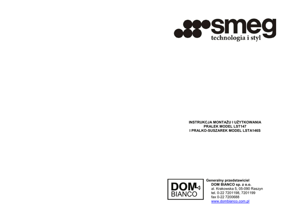INSTRUKCJA MONTAśU I UśYTKOWANIA PRALEK MODEL LST147 I PRALKO-SUSZAREK MODEL LSTA146S Generalny przedstawiciel DOM BIANCO sp. z o.o. al. Krakowska 5, 05-090 Raszyn tel. 0-22 7201198, 7201199 fax 0-22 7200688 www.dombianco.com.pl -1- - 48 Spis treści 1. Zasady bezpiecznego uŜytkowania 2. Instalacja 3. Opis panelu sterowania 4. UŜytkowanie urządzenia 5. Suszenie (tylko model LSTA146S) 6. Czyszczenie i obsługa bieŜąca 7. Gdy pojawią się kłopoty 8. Umiejscowienie i montaŜ panelu meblowego 2 7 13 15 28 33 36 38 Urządzenie jest oznakowane symbolem zgodnie z dyrektywą 2002/96 WG w sprawie zuŜytego sprzętu elektrycznego elektronicznego (ustawa z dnia 19 lipca 2005 r. w sprawie zuŜytego sprzętu elektrycznego elektronicznego wraz z późniejszymi zmianami i uzupełnieniami) – WEEE. Dyrektywa ta i ustawa zawierają zasady postępowania i recyklingu zuŜytego sprzętu na terenie całej Unii Europejskiej. Symbol ten umieszczony na wyrobie lub jego opakowaniu oznacza, Ŝe zuŜyte urządzenie nie moŜe być traktowane jako odpad komunalny. UŜytkownik jest zobligowany do odpowiedniej utylizacji urządzenia i przekazania go do odpowiedniej firmy mającej uprawnienia w tym zakresie lub zwrócenia go sprzedawcy nowego urządzenia na zasadzie „sztuka za sztukę”. Właściwa utylizacja i recykling zuŜytego urządzenia w wyspecjalizowanym zakładzie pozwoli zapobiec negatywnemu oddziaływaniu na środowisko oraz zdrowie Kudzi, a takŜe umoŜliwi ponowne wykorzystanie materiałów uŜytych do produkcji wyrobu. Niewłaściwe pozbywanie się zuŜytego sprzętu elektrycznego i elektronicznego jest karane na mocy prawa. -2Uwaga! Przed rozpoczęciem uŜytkowania urządzenia naleŜy dokładnie zapoznać się z niniejszą instrukcją, w której są zawarte informacje na temat prawidłowego i bezpiecznego uŜytkowania sprzętu. Instrukcję naleŜy przechowywać w pobliŜu urządzenia w celu zapewnienia sobie moŜliwości skorzystania z niej w razie takiej potrzeby. W przypadku sprzedaŜy urządzenia lub przeniesienia go w inne miejsce instrukcję zawsze naleŜy dołączyć do pralki. 1. ZASADY BEZPIECZNEGO UśYTKOWANIA Uwaga! PoniŜsze zasady są bardzo szczegółowe ze względu na konieczność zapewnienia właściwego bezpieczeństwa uŜytkowania. Przed zainstalowaniem i rozpoczęciem uŜytkowania pralki naleŜy dokładnie zapoznać się z niniejszym rozdziałem. Postępowanie z opakowaniem • Pozostałości opakowania nie wolno pozostawiać w domu bez odpowiedniego nadzoru. NaleŜy je posegregować według uŜytych surowców i przekazać do najbliŜszego punktu skupu surowców wtórnych. • Pewne elementy opakowania, takie jak plastikowe torby, styropian itp., nie mogą znajdować się w zasięgu dzieci. Postępowanie ze zuŜytym sprzętem Z chwilą zaprzestania korzystania z pralki ze względu na jej zuŜycie naleŜy uczynić ją nieprzydatną do uŜycia – zdemontować lub zniszczyć zamek w drzwiczkach (aby zapobiec moŜliwości zamknięcia się dzieci w środku) oraz odciąć przewód podłączeniowy po uprzednim wyjęciu wtyczki z gniazdka. ZuŜyte urządzenie musi być przekazane do firmy wyspecjalizowanej w utylizacji i recyklingu zuŜytego sprzętu elektrycznego i elektronicznego. Ochrona środowiska • NaleŜy wykorzystywać maksymalną zdolność pralki do prania. Nie wolno przekraczać maksymalnego dopuszczalnego ładunku. - 47 - płyn do płukania pranie wstępne intensywn e Opcje łatwe prasowani e dodatkowe płukanie zmienny czas Pranie 30oC, płukanie i wirowanie Pranie 40oC, płukanie i wirowanie --- Pranie zimne, płukanie i wirowanie --- --- --- --- Pranie 30 lub 40 C, płukanie i wirowanie Pranie 60oC, płukanie i wirowanie --- --- --- Pranie zimne, płukanie i wirowanie --- --- --- --- --- --- Pranie 30 lub 40oC, płukanie i wirowanie Pranie zimne, płukanie i wirowanie --- --- --- --- ---- --- --- --- --- --- --- --- --- --- --- --- ---- --- --- --- --- --- --- --- --- --- --- --- --- --- --- --- --- --- Opis programu o Pranie 60 C, płukanie i wirowanie (cykl standardowy tylko przy opcji intensywne Pranie 75 lub 90oC, płukanie i wirowanie Pranie 30oC, płukanie i wirowanie o Pranie 40 C, płukanie i wirowanie Pranie 60oC, płukanie i wirowanie o Pranie 30 lub 40oC, płukanie i wirowanie Płukanie i odpompowanie lub odpompowanie i końc. wirowanie Odpompowanie lub odpompowanie i końc. wirowanie Pranie 30oC, płukanie i wirowanie Pranie 30oC, płukanie i wirowanie (bez sygnału dźwiękowego) o Pranie 40 C, płukanie i wirowanie (bez sygnału dźwiękowego) Pranie 60oC, płukanie i wirowanie (bez sygnału dźwiękowego) Pranie zimne, płukanie i wirowanie Pranie 30 lub 40oC, płukanie i wirowanie Pranie zimne, płukanie i wirowanie Pranie 30 lub 40oC, płukanie i wirowanie Pranie zimne, płukanie i wirowanie Pranie 30 lub 40oC, płukanie i wirowanie Bawełna i kolory Syntetyczne /30 40 Maks. 7 Maks. 7 Odporne kolorowe normalnie zabrudzone 60 Maks. 7 75/90 Maks. 7 /30 40 Maks. 7 Delikatne kolorowe normalnie zabrudzone Maks. 7 Odporne kolorowe normalnie zabrudzone 60 Maks. 7 800 3,5 Delikatne kolorowe lekko zabrudzone OdświeŜanie Lekko zabrudzone Normalnie zabrudzone Delikatne/jedwab 30/40 800 3,5 60 800 3,5 600 2 --- 600 2 --- 800 2 --- 800 2 --- 7 --- --- OdświeŜanie Lekko zabrudzone Wełna 30/40 OdświeŜanie Lekko zabrudzone Płukanie i wirowanie Odpompowanie i wirowanie końc. Szybkie Pranie nocne Przegródka na pranie pranie wstęp zasadni ne cze Delikatne kolorowe normalnie zabrudzone Delikatne kolorowe lekko zabrudzone Odporne kolorowe mocno zabrudzone Bawełna Eco Temp. [oC] Maks. ładunek prania [kg] Program Wirowanie[ 1/min] - 46 OPISY PROGRAMÓW – LST147 Lekka bawełna i delikatnego odświeŜenia Bardzo delikatne tkaniny lekko zabrudzone 30/40 --- Maks. 7 --- --- --- Maks. 800 2 -- 800 4 /30 /30 Lekko zabrudzone rzeczy 40 800 4 Normalnie zabrudzone rzeczy 60 800 4 Płyn do płukania 800 3,5 --- Pranie ręczne 800 2 --- 800 2 --- 30/40 800 2 --- 12