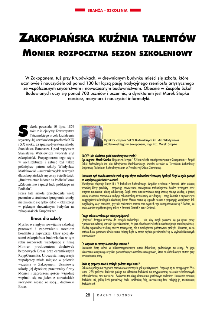 BRANŻA – SZKOLENIA Zakopiańska Monier kuźnia talentów rozpoczyna sezon szkoleniowy W Zakopanem, tuż przy Krupówkach, w drewnianym budynku mieści się szkoła, której uczniowie i nauczyciele od ponad 130 lat łączą pasję tradycyjnego rzemiosła artystycznego ze współczesnym snycerstwem i nowoczesnym budownictwem. Obecnie w Zespole Szkół Budowlanych uczy się ponad 700 uczniów i uczennic, a dyrektorem jest Marek Stopka – narciarz, marynarz i nauczyciel informatyki. S zkoła powstała 10 lipca 1876 roku z inicjatywy Towarzystwa Tatrzańskiego w celu kształcenia snycerzy. Jej uczniowie na przełomie XIX i XX wieku, za sprawą dyrektora szkoły, Stanisława Barabasza i pod wpływem Stanisława Witkiewicza tworzyli styl zakopiański. Propagatorem tego stylu w architekturze i sztuce był także późniejszy patron szkoły Władysław Matlakowski – autor niezwykle ważnych dla zakopiańskich snycerzy i cieśli dzieł: „Budownictwo ludowe na Podhalu” oraz „Zdobnictwo i sprzęt ludu polskiego na Podhalu”. Przez lata szkoła przechodziła wiele przemian w strukturze i programie szkoły, nie zmieniło się tylko jedno – lokalizacja w pięknym drewnianym budynku na zakopiańskich Krupówkach. Braas dla szkoły Myśląc o ciągłym rozwijaniu szkolnej pracowni i zapewnieniu uczniom kontaktu z najwyższej klasy specjalistami zakopiańska budowlanka w tym roku rozpoczęła współpracę z firmą Monier, producentem dachówek betonowych Braas oraz ceramicznych RuppCeramika. Uroczysta inauguracja współpracy miała miejsce w połowie września w Zakopanem. Uczniowie szkoły, jej dyrektor, pracownicy firmy Monier i zaproszeni goście wspólnie wspinali się na jeden z tatrzańskich szczytów, niosąc ze sobą... dachówki Braas. Dyrektor Zespołu Szkół Budowlanych im. dra Władysława Matlakowskiego w Zakopanem, mgr inż. Marek Stopka DACHY: Jaki dokładnie profil zawodowy ma szkoła? Dyr. mgr inż. Marek Stopka: Najstarsza, licząca 132 lata szkoła ponadgimnazjalna w Zakopanem – Zespół Szkół Budowlanych im. dra Władysława Matlakowskiego kształci uczniów w Technikum Architektury Krajobrazu, Technikum Budowlanym oraz w Zasadniczej Szkole Zawodowej. Uczniowie tych dwóch ostatnich szkół są więc chyba zadowoleni z koncepcji dyrekcji? Skąd w ogóle pomysł na współpracę placówki z Monier? Współpraca obejmuje klasy III i IV Technikum Budowlanego. Wspólne działanie z firmami, które oferują wysokiej klasy produkty i proponują nowoczesne rozwiązania technologiczne bardzo wzbogaca nasz program nauczania i ofertę edukacyjną. Dzięki temu nasi uczniowie mają szansę zdobyć wiedzę, z jednej strony w oparciu zarówno o tradycje zakopiańskiej architektury, a z drugiej – mają kontakt z najnowszymi osiągnięciami technologii budowlanej. Firma Monier sama się zgłosiła do nas z propozycją współpracy. Jak moglibyśmy więc odmówić, gdy tak znakomity partner sam wyraził chęć zaangażowania się? Dodam, że poza Monier współpracujemy także z firmami Dietrich’s oraz Schiedel. Czego szkoła oczekuje po takiej współpracy? „Jedynie” dostępu uczniów do nowych technologii – tak, aby mogli poruszać się po rynku pracy z poczuciem własnej wartości i przekonaniem, że jako absolwenci szkoły budowlanej mają rzetelną wiedzę. Wiedzę wprawdzie w dużej mierze teoretyczną, ale z niezbędnymi podstawami praktyki. Uważam, że to bardzo dużo, ponieważ dzięki temu chłopcy będą w stanie szybko przekształcić się w wykwalifikowanych pracowników. Co wsparcie ze strony Monier daje uczniom? Uczniowie biorą udział w kilkunastogodzinnym kursie dekarskim, podzielonym na etapy. Po jego ukończeniu otrzymują certyfikat potwierdzający określone umiejętności, które są dodatkowym atutem przy poszukiwaniu pracy. Jakie są proporcje teorii i praktyki podczas tego kursu? Szkolenie polega na zajęciach zarówno teoretycznych, jak i praktycznych. Proporcje są tu następujące: 75% teorii i 25% praktyki. Praktyka polega na układaniu dachówek na przygotowanej do celów szkoleniowych połaci dachowej oraz na stożku. Zwłaszcza ten drugi element nie jest łatwym zadaniem. Uczniowie montują dachówki tak, jakby kryli prawdziwy dach: rozkładają folię, rozmierzają łaty, nabijają je, rozmierzają dachówki itd. 28 DACHY 10/2009 fot. Monier BRANŻA – SZKOLENIA Kto przekazuje uczniom fachową wiedzę dekarską? Wiedzę przekazuje szkoleniowiec firmy Monier – pan mgr inż. Przemysław Spych, przy okazji szkoląc nauczycieli. Z czasem prawdopodobnie nauczyciele sami „wyszkolą się” na tyle, aby samodzielnie przekazywać wiedzę uczniom, na razie jednak będziemy polegać na doświdczeniu fachowców. Jakie są konkretne świadczenia Monier w ramach współpracy, a do czego zobowiązała się szkoła? Uczniowie Budowlanki oraz produkty firmy Braas – ekspozycja w trakcie IX Majówki Tatrzańskiej Współpraca z firmami, które oferują wysokiej klasy produkty i proponują nowoczesne rozwiązania technologiczne bardzo wzbogaca nasz program nauczania. Dzięki temu nasi uczniowie mają szansę budować wiedzę w oparciu zarówno o tradycje zakopiańskiej architektury, jak i najnowsze osiągnięcia technologii budowlanej– mówił dyrektor szkoły, Marek Stopka na spotkaniu z dziennikarzami w trakcie inauguracji sezonu szkoleniowego firmy Monier. – Dzięki współpracy z firmą Monier możemy korzystać z wiedzy i doświadczenia najwyższej klasy specjalisty, doradcy technicznego Braas RuppCeramika Przemysława Spycha. Monier przekazał szkole tablice edukacyjne (poglądowe), okno dachowe do celów szkoleniowych oraz materiały dydaktyczne w postaci dachówek oraz akcesoriów dachowych. Firma zobowiązała się także do bezpłatnego przeprowadzenia w ciągu roku szkolnego prelekcji i pokazów dla uczniów nowinek technologicznych znajdujących się w ofercie firmy. Ponadto będziemy współpracować na innej płaszczyźnie, w ram