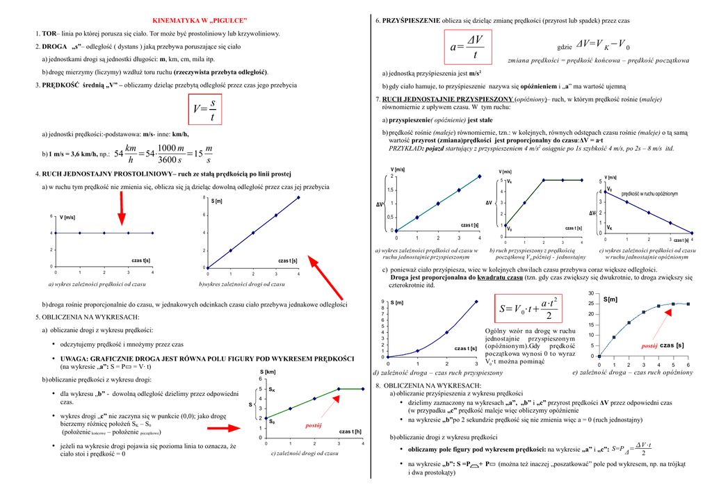 KINEMATYKA W „PIGUŁCE” 6. PRZYŚPIESZENIE oblicza się dzieląc zmianę prędkości (przyrost lub spadek) przez czas 1. TOR– linia po której porusza się ciało. Tor może być prostoliniowy lub krzywoliniowy. a= 2. DROGA „s”– odległość ( dystans ) jaką przebywa poruszające się ciało a) jednostkami drogi są jednostki długości: m, km, cm, mila itp. b) drogę mierzymy (liczymy) wzdłuż toru ruchu (rzeczywista przebyta odległość). a) jednostką przyśpieszenia jest m/s 3. PRĘDKOŚĆ średnią „V” – obliczamy dzieląc przebytą odległość przez czas jego przebycia V= 54 a) przyspieszenie( opóźnienie) jest stałe b) prędkość rośnie (maleje) równomiernie, tzn.: w kolejnych, równych odstępach czasu rośnie (maleje) o tą samą wartość przyrost (zmiana)prędkości jest proporcjonalny do czasu:ΔV = a∙t PRZYKŁAD: pojazd startujący z przyspieszeniem 4 m/s2 osiągnie po 1s szybkość 4 m/s, po 2s – 8 m/s itd. V [m/s] 2 4. RUCH JEDNOSTAJNY PROSTOLINIOWY– ruch ze stałą prędkością po linii prostej a) w ruchu tym prędkość nie zmienia się, oblicza się ją dzieląc dowolną odległość przez czas jej przebycia S [m] ΔV 1 ΔV 0,5 4 4 0 2 2 V [m/s] czas t [s] 0 0 0 1 2 3 4 a) wykres zależności prędkości od czasu 0 1 2 3 9 8 7 6 5 4 3 2 1 0 b) droga rośnie proporcjonalnie do czasu, w jednakowych odcinkach czasu ciało przebywa jednakowe odległości 5. OBLICZENIA NA WYKRESACH: a) obliczanie drogi z wykresu prędkości: • odczytujemy prędkość i mnożymy przez czas • UWAGA: GRAFICZNIE DROGA JEST RÓWNA POLU FIGURY POD WYKRESEM PRĘDKOŚCI 5 • dla wykresu „b” - dowolną odległość dzielimy przez odpowiedni czas. • wykres drogi „c” nie zaczyna się w punkcie (0,0); jako drogę bierzemy różnicę położeń SK – S0 (położenie końcowe – położenie początkowe) • jeżeli na wykresie drogi pojawia się pozioma linia to oznacza, że ciało stoi i prędkość = 0 3 S0 postój 1 czas t [h] 3 3 2 ΔV 2 1 1 czas t [s] V0 0 1 2 3 prędkość w ruchu opóźnionym VK 0 0 4 V0 0 4 b) ruch przyspieszony z prędkością początkową V0 później - jednostajny 1 2 3 czas t [s] 4 c) wykres zależności prędkości od czasu w ruchu jednostajnie opóźnionym 2 30 a⋅t 2 S=V 0⋅t 2 czas t [s] 1 2 3 S[m] 25 20 Ogólny wzór na drogę w ruchu jednostajnie przyspieszonym (opóźnionym).Gdy prędkość początkowa wynosi 0 to wyraz V0·t można pominąć 15 10 postój czas [s] 5 0 0 1 2 3 4 5 3 c) zależność drogi od czasu 4 V⋅t • obliczamy pole figury pod wykresem prędkości: na wykresie „a” i „c”: S=P Δ = 2 • na wykresie „b”: S =P i dwa prostokąty) 6 e) zależność droga – czas ruch opóźniony b) obliczanie drogi z wykresu prędkości 0 0 4 V [m/s] 8. OBLICZENIA NA WYKRESACH: a) obliczanie przyśpieszenia z wykresu prędkości • dzielimy zaznaczony na wykresach „a”, „b” i „c” przyrost prędkości ΔV przez odpowiedni czas (w przypadku „c” prędkość maleje więc obliczymy opóźnienie • na wykresie „b”po 2 sekundzie prędkość się nie zmienia więc a = 0 (ruch jednostajny) SK 2 4 1 S [m] 0 4 S 3 5 d) zależność droga – czas ruch przyspieszony S [km] 6 b) obliczanie prędkości z wykresu drogi: 2 5 Vk c) ponieważ ciało przyśpiesza, wiec w kolejnych chwilach czasu przebywa coraz większe odległości. Droga jest proporcjonalna do kwadratu czasu (tzn. gdy czas zwiększy się dwukrotnie, to droga zwiększy się czterokrotnie itd. 4 b)wykres zależności drogi od czasu (na wykresie „a”: S = P▭ = V∙ t) 1 a) wykres zależności prędkości od czasu w ruchu jednostajnie przyspieszonym czas t [s] czas t[s] 0 V [m/s] 1,5 6 6 zm iana prędkości = prędkość końcowa – prędkość początkowa 2 7. RUCH JEDNOSTAJNIE PRZYSPIESZONY (opóźniony)– ruch, w którym prędkość rośnie (maleje) równomiernie z upływem czasu. W tym ruchu: s t km 1000 m m =54⋅ =15 h 3600 s s 8 ΔV=V K −V 0 gdzie b) gdy ciało hamuje, to przyśpieszenie nazywa się opóźnieniem i „a” ma wartość ujemną a) jednostki prędkości:-podstawowa: m/s- inne: km/h, b) 1 m/s = 3,6 km/h, np.: ΔV t + P▭ (można też inaczej „poszatkować” pole pod wykresem, np. na trójkąt
