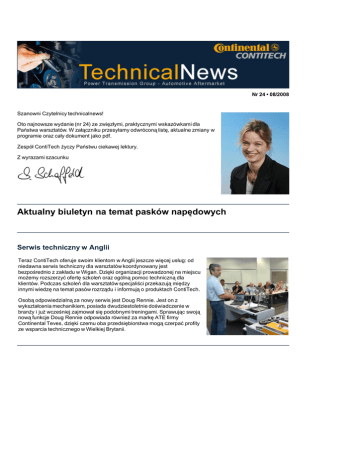 Nr 24 • 08/2008 Szanowni Czytelnicy technicalnews! Oto najnowsze wydanie (nr 24) ze zwięzłymi, praktycznymi wskazówkami dla Państwa warsztatów. W załączniku przesyłamy odwróconą listę, aktualne zmiany w programie oraz cały dokument jako pdf. Zespół ContiTech życzy Państwu ciekawej lektury. Z wyrazami szacunku Aktualny biuletyn na temat pasków napędowych Serwis techniczny w Anglii Teraz ContiTech oferuje swoim klientom w Anglii jeszcze więcej usług: od niedawna serwis techniczny dla warsztatów koordynowany jest bezpośrednio z zakładu w Wigan. Dzięki organizacji prowadzonej na miejscu możemy rozszerzyć ofertę szkoleń oraz ogólną pomoc techniczną dla klientów. Podczas szkoleń dla warsztatów specjaliści przekazują między innymi wiedzę na temat pasów rozrządu i informują o produktach ContiTech. Osobą odpowiedzialną za nowy serwis jest Doug Rennie. Jest on z wykształcenia mechanikiem, posiada dwudziestoletnie doświadczenie w branży i już wcześniej zajmował się podobnymi treningami. Sprawując swoją nową funkcje Doug Rennie odpowiada również za markę ATE firmy Continental Teves, dzięki czemu oba przedsiębiorstwa mogą czerpać profity ze wsparcia technicznego w Wielkiej Brytanii. Zdjęcia i funkcja wyszukiwania stanowią uzupełnienie katalogu online Katalog online ContiTech Power Transmission Group został uzupełniony o zdjęcia mechanizmu pasków zębatych. Bazujący na stronach internetowych katalog porządkowy dla branży motoryzacyjnych części zamiennych informuje o tym, jakie paski rozrządu montowane są w jakich pojazdach. W przypadku pasów zębatych oraz odpowiednich zestawów użytkownik może kliknięciem myszki wywołać zdjęcia mechanizmów, aby sprawdzić, jakie agregaty napędzane są danym pasem. Poza tym znacznie ulepszono przystępność listy porządkowej. Została ona rozszerzona o komfortową matrycę wyszukiwania, która umożliwia klientowi szybkie i proste wyszukanie pojazdu podając bezpośrednio numer artykułu. Stan danych w katalogu opracowywany jest kwartalnie i jest o trzy miesiące aktualniejszy od danych w systemie informacyjnym TecDoc . Aktualizacja do BTT Hz dostępna w Internecie Bezpłatna aktualizacja instrukcji obsługi użytkownika do miernika napięcia CONTI® BTT Hz dostępna jest teraz w Internecie. Zawiera prawie 500 nowych wartości nastawczych do pasków rozrządu zębatych i żeberkowych w silnikach wiodących producentów branży motoryzacyjnej oraz uzupełnia bazę danych załączoną przy zakupie do BTT Hz. Wersja PDF przygotowana jest do pobrania na stronie: www.contitech.de/ aftermarket, paski rozrządu, serwis, BTT Hz, dalsze informacje. Aktualizacja dostępna jest w kilku językach, min. w angielskim i francuskim. Nowy zestaw pomp wodnych ContiTech ContiTech Power Transmission Group rozszerzyła swój asortyment zestawów pomp wodnych (WaPuKits) o nowe pakiety pasów. W przeciwieństwie do dotychczasowych zestawów oprócz pasów zębatych CONTI SYNCHROBELT® i pompy wodnej nie zawierają one żadnych krążków napinających ani wałków prowadzących. Nowe komplety pomyślane są dla silników, w których pas zębaty napięty jest na pompie wodnej. Aby system funkcjonował bezawaryjne, przy wymianie pasa należy zawsze wymieniać wszystkie elementy mechanizmu pasa zębatego, w tym przypadku zatem również pompę wodną. Aktualnie dostępne są pakiety dla 15 silników wiodących producentów. Tak jak wszystkie produkty ContiTech, również i elementy zestawu pompy wodnej dostarczane są na motoryzacyjny rynek wtórny w jakości wyposażenia fabrycznego. Pasy typu Elast: Nowa linia produktu do specjalnego zastosowania Pasy typu Elast CONTI-V MULTIRIB® ELAST przodują w nowoczesnych silnikach. Wszędzie tam, gdzie w napędach niskiej i średniej mocy istnieją stałe odległości międzyosiowe, świetnie nadają się elastyczne pasy żeberkowe stanowiące rozwiązanie dla napędów zamkniętych siłowo. Montuje się je przy stałej odległości międzyosiowej i wytrzymują one naprężenie wstępne bez dodatkowego urządzenia napinającego, co pozwala znacznie zmniejszyć koszty napędu. ContiTech oferuje na motoryzacyjnym rynku wtórnym najszerszy asortyment do opisanego wyżej zastosowania specjalnego: Aby montaż przebiegł prawidłowo, dostarczamy w jednym opakowaniu kompletny zestaw narzędzi, tj. jedenaście pasów CONTI-V MULTIRIB® ELAST wraz z odpowiednim narzędziem oraz instrukcją montażu. Daje to pewność, że pasy zostaną zamontowane zgodnie z zaleceniami producenta i bez uszkodzeń. Oprócz zestawu narzędzi ContiTech oferuje 27 pasów CONTI-V MULTIRIB® ELAST. Ich montaż albo nie wymaga żadnych specjalnych narzędzi, bo np. agregaty są odchylne, albo też używa się specjalnego narzędzia wielofunkcyjnego. Ważne jest, że w takich przypadkach nie można używać standardowych pasów żeberkowych nawet, jeśli dostępna jest odpowiednia długość. Zestawy pasów z tłumikami drgań skrętnych Zestawy pasów żeberkowych z tłumikami drgań skrętnych (TSD) oraz odsprzężonymi tłumikami drgań skrętnych (eTSD) uzupełniają ofertę zestawów ContiTech Power Transmission Group. Zadaniem TSD jest amortyzowanie wibracji wału korbowego. W przypadku eTSD odsprzężony jest dodatkowo napęd pasowy agregatów dodatkowych, co pozwala chronić pasy i napędzane agregaty. Nowe pakiety kompletów dostępne są przeważnie dla nowoczesnych silników diesla, których nie da się użytkować bez koła pasowego. Oprócz koła pasowego i pasa zawierają one również potrzebne śruby do mocowania i uszczelki. W przypadku śrub są to specjalne śruby OE, które wraz z wymianą TSD muszą być również obowiązkowo wymienione. Oprócz tego ContiTech wydał do nowych zestawów bezpłatny plakat informujący o najczęstszych awariach kół pasowych i ich przyczynach (zamówienia pod adresem: [email protected]). Proces obciążenia prowadzi w tłumikach drgań skrętnyc