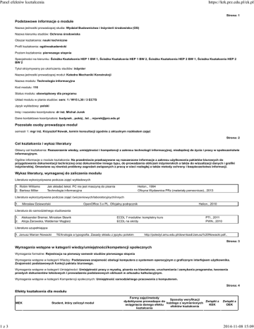 Panel efektów kształcenia 1z3 https://krk.prz.edu.pl/ek.pl Strona: 1 Podstawowe informacje o module Nazwa jednostki prowadzącej studia: Wydział Budownictwa i Inżynierii środowiska (OS) Nazwa kierunku studiów: Ochrona środowiska Obszar kształcenia: nauki techniczne Profil kształcenia: ogólnoakademicki Poziom kształcenia: pierwszego stopnia Specjalności na kierunku: Ścieżka Kształcenia HEP 1 BW 1, Ścieżka Kształcenia HEP 1 BW 2, Ścieżka Kształcenia HEP 2 BW 1, Ścieżka Kształcenia HEP 2 BW 2 Tytuł otrzymywany po ukończeniu studiów: inżynier Nazwa jednostki prowadzącej moduł: Katedra Mechaniki Konstrukcji Nazwa modułu: Technologia informacyjna Kod modułu: 116 Status modułu: obowiązkowy dla programu Układ modułu w planie studiów: sem: 1 / W15 L30 / 3 ECTS Język wykładowy: polski Imię i nazwisko koordynatora: dr inż. Michał Jurek Dane kontaktowe koordynatora: budynek , pokój , tel. , [email protected] Pozostałe osoby prowadzące moduł semestr 1: mgr inż. Krzysztof Nowak, termin konsultacji zgodnie z aktualnym rozkładem zajęć Strona: 2 Cel kształcenia i wykaz literatury Główny cel kształcenia: Rozszerzenie wiedzy, umiejętności i kompetencji z zakresu technologii informacyjnej, niezbędnej do życia i pracy w społeczeństwie informacyjnym. Ogólne informacje o module kształcenia: Na przedmiocie przekazywane są rozszerzone informacje z zakresu użytkowania pakietów biurowych do przygotowania dokumentacji technicznej oraz dokumentów innego typu, do prowadzenia obliczeń inżynierskich a także do wizualizacji danych i grafiki inżynierskiej. Omawiane są również problemy zagrożeń związanych z pracą w sieci rozległej a także metody ochrony i bezpieczeństwa informacji. Wykaz literatury, wymaganej do zaliczenia modułu Literatura wykorzystywana podczas zajęć wykładowych 1. Robin Williams 2. Bartosz Miller Jak składać tekst. PC nie jest maszyną do pisania Technologia informacyjna Helion., 1994 Oficyna Wydawnica PRz (materiały pomocnicze)., 2013 Literatura wykorzystywana podczas zajęć ćwiczeniowych/laboratoryjnych/innych 1. Mirosław Dziewoński OpenOffice 3.x PL. Oficjalny podręcznik Helion., 2010 Literatura do samodzielnego studiowania 1. 2. Aleksander Bremer, Mirosław Sławik Alicja Żarowska, Waldemar Węglarz ECDL 7 modułów: kompletny kurs ECDL na skróty PTI., 2011 PWN., 2010 Literatura uzupełniająca 1. Janusz Marian Nowacki TEXnologia a typografia. Zasady składu z języku polskim http://poledyt.amu.edu.pl/download/Janusz%20Nowacki.pdf., Strona: 3 Wymagania wstępne w kategorii wiedzy/umiejętności/kompetencji społecznych Wymagania formalne: Rejestracja na pierwszy semestr studiów pierwszego stopnia Wymagania wstępne w kategorii Wiedzy: Podstawowa znajomość obsługi komputera z systemem operacyjnym z graficznym interfejsem użytkownika. Znajomość podstawowych funkcji pakietu biurowego. Wymagania wstępne w kategorii Umiejętności: Umiejętność pracy z myszką, pisania na klawiaturze, uruchamiania i zamykania programów, tworzenia prostych dokumentów tekstowych i prowadzenia podstawowych obliczeń w arkuszku kalkulacyjnym. Wymagania wstępne w kategorii Kompetencji społecznych: Umiejętność samodzielnego pracowania z komputerem. Strona: 4 Efekty kształcenia dla modułu MEK Student, który zaliczył moduł Formy zajęć/metody Sposoby weryfikacji dydaktyczne prowadzące do Związki z każdego z wymienionych osiągnięcia danego efektu KEK efektów kształcenia kształcenia Związki z OEK 2014-11-08 15:09 Panel efektów kształcenia 2z3 01. 02. 03. https://krk.prz.edu.pl/ek.pl Zna podstawowe zasady prawidłowego i bezpiecznego korzystania z Internetu. Posiada wiedzę z zakresu zastosowania pakietów biurowych wykład w zagadnieniach inżynierskich. Ma podstawową wiedzę dotyczącą zagadnień społeczeństwa informacyjnego. potrafi efektywnie wykorzystywać pocztę elektroniczną, potrafi posługiwać się pakietem biurowym na poziome średniozaawansowanym, laboratorium potrafi wygłosić przygotowaną prezentację na forum publicznym Rozumie konieczność stałego dokształcania się i pogłębiania wiedzy wykład, laboratorium związanej z korzystaniem z Internetu i pakietów biurowych obserwacja wykonawstwa K_W015++ T1A_W07+ kolokwium, obserwacja wykonawstwa K_U008++ T1A_U07+ K_U011++ obserwacja wykonawstwa K_K001++ T1A_K01+ K_K002++ Strona: 5 Treści kształcenia dla modułu Sem. TK Realizowane na Treści kształcenia 1 TK01 Zasady pracy w środowisku sieciowym W01-W02 1 TK02 1 TK03 Bazy danych, zasady tworzenia i wykorzystywania baz danych W12-13 1 TK04 Zasady bezpiecznego wykorzystania sieci rozległej W14-W15 1 TK05 Praca w sieci i korzystanie z poczty elektronicznej L01-L04 1 TK06 Edytor tekstu (zasady tworzenia czytelnych i eleganckich dokumentów), arkusz kalkulacyjny (zasady wykonywania obliczeń W03-W11 inżynierskich), grafika prezentacyjna i program do prezentacji (zasady tworzenia i wygłaszania prezentacji publicznych) 1 Praca z edytorem tekstu, przygotowywanie dużych dokumentów, zastosowanie styli do formatowania i automatyzacji pracy, L05-L12 tworzenie i wykorzystanie indeksów i spisów TK07 Wykonywanie obliczeń inżynierskich w arkuszu kalkulacyjnym, tworzenie i edytowanie wykresów L13-L22 1 TK08 Tworzenie grafiki prezentacyjnej, przygotowanie i wygłaszanie publicznej prezentacji L23-L30 MEK MEK01 MEK03 MEK01 MEK03 MEK01 MEK03 MEK01 MEK03 MEK02 MEK03 MEK02 MEK02 MEK02 MEK03 Strona: 6 Nakład pracy studenta Forma zajęć Praca przed zajęciami Wykład (sem. 1) Laboratorium (sem. 1) Praca po zajęciach Godziny kontaktowe: 15.00 godz./sem. Przygotowanie do kolokwium: 10.00 godz./sem. Konsultacje (sem. 1) Zaliczenie (sem. 1) Udział w zajęciach Godziny kontaktowe: 30.00 godz./sem. Inne: 15.00 godz./sem. Udział w konsultacjach: 1.00 godz./sem. Przygotowanie do zaliczenia: 10.00 godz./sem. Zaliczenie pisemne: 2.00 godz./sem. Strona: 7 Warunki zaliczenia modułu Student, który