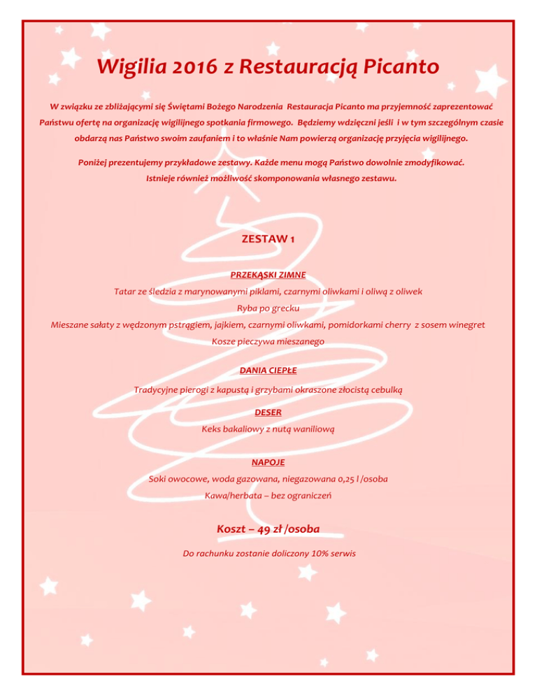 Wigilia 2016 z Restauracją Picanto W związku ze zbliżającymi się Świętami Bożego Narodzenia Restauracja Picanto ma przyjemność zaprezentować Państwu ofertę na organizację wigilijnego spotkania firmowego. Będziemy wdzięczni jeśli i w tym szczególnym czasie obdarzą nas Państwo swoim zaufaniem i to właśnie Nam powierzą organizację przyjęcia wigilijnego. Poniżej prezentujemy przykładowe zestawy. Każde menu mogą Państwo dowolnie zmodyfikować. Istnieje również możliwość skomponowania własnego zestawu. ZESTAW 1 PRZEKĄSKI ZIMNE Tatar ze śledzia z marynowanymi piklami, czarnymi oliwkami i oliwą z oliwek Ryba po grecku Mieszane sałaty z wędzonym pstrągiem, jajkiem, czarnymi oliwkami, pomidorkami cherry z sosem winegret Kosze pieczywa mieszanego DANIA CIEPŁE Tradycyjne pierogi z kapustą i grzybami okraszone złocistą cebulką DESER Keks bakaliowy z nutą waniliową NAPOJE Soki owocowe, woda gazowana, niegazowana 0,25 l /osoba Kawa/herbata – bez ograniczeń Koszt – 49 zł /osoba Do rachunku zostanie doliczony 10% serwis ZESTAW 2 PRZEKĄSKI ZIMNE Śledź podany na dwa sposoby (tradycyjny z cebulką w oleju i na ostro z suszonymi pomidorami, musztardą francuską i chilli) Ryba po grecku Pstrąg w galarecie Półmisek pieczonych mięs i pasztetów z tradycyjną ćwikłą Mieszane sałaty z wędzonym łososiem, ze świeżymi warzywami i dressingiem musztardowym Kosze pieczywa mieszanego DANIA CIEPŁE Karp panierowany smażony na klarowanym maśle serwowany z puree ziemniaczanym i gazurowanymi buraczkami DESER Makowiec świąteczny NAPOJE Soki owocowe, woda gazowana, niegazowana 0,25 l /osoba Kawa/herbata – bez ograniczeń Koszt – 69 zł /osoba Do rachunku zostanie doliczony 10% serwis ZESTAW 3 PRZEKĄSKI ZIMNE Tymbaliki rybne z krewetkami, avokado i koperkiem Sałatka śledziowa Półmisek pieczonych mięs i pasztetów z tradycyjną ćwikłą Ryba po grecku Mieszane sałaty z wędzonym łososiem, ze świeżymi warzywami i dressingiem musztardowym Krucha tarta z kiszoną kapustą, grzybami i żurawiną ZUPY Czerwony barszcz wigilijny z uszkami DANIE GŁÓWNE Grillowany pstrąg łososiowy w sosie maślano-kaparowym serwowany z talarkami ziemniaczanymi i sałatką ze świeżego szpinaku DESER Sernik miodowo-cynamonowy na piernikowym spodzie NAPOJE Soki owocowe, woda gazowana, niegazowana 0,25 l /osoba Kawa/herbata – bez ograniczeń Koszt – 99 zł /osoba Do rachunku zostanie doliczony 10% serwis