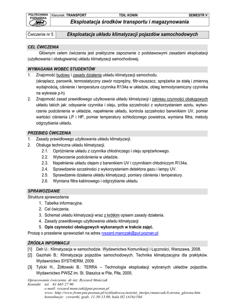 POLITECHNIKA POZNAŃSKA Kierunek: TRANSPORT Ćwiczenie nr 5 TDIL KONIN SEMESTR V Eksploatacja środków transportu i magazynowania Eksploatacja układu klimatyzacji pojazdów samochodowych CEL ĆWICZENIA Głównym celem ćwiczenia jest praktyczne zapoznanie z podstawowymi zasadami eksploatacji (użytkowania i obsługiwania) układu klimatyzacji samochodowej. WYMAGANIA WOBEC STUDENTÓW 1. Znajomość budowy i zasady działania układu klimatyzacji samochodu. (skraplacz, parownik, termostatyczny zawór rozprężny, filtr-osuszacz, sprężarka ze stałą i zmienną wydajnością, ciśnienie i temperatura czynnika R134a w układzie, obieg termodynamiczny czynnika na wykresie p-h) 2. Znajomość zasad prawidłowego użytkowania układu klimatyzacji i zakresu czynności obsługowych układu takich jak: odsysanie czynnika i oleju, próba szczelności z wykorzystaniem azotu, wytworzenie podciśnienia w układzie, napełnienie układu, kontrola szczelności barwnikiem UV, pomiar wartości ciśnienia LP i HP, pomiar temperatury schłodzonego powietrza, wymiana filtra, metody odgrzybiania układu. PRZEBIEG ĆWICZENIA 1. Zasady prawidłowego użytkowania układu klimatyzacji. 2. Obsługa techniczna układu klimatyzacji. 2.1. Opróżnienie układu z czynnika chłodniczego i oleju sprężarkowego. 2.2. Wytworzenie podciśnienia w układzie. 2.3. Napełnienie układu olejem z barwnikiem UV i czynnikiem chłodniczym R134a. 2.4. Sprawdzenie szczelności z wykorzystaniem detektora gazu i lampy UV. 2.5. Sprawdzenie działania układu klimatyzacji, pomiary ciśnienia i temperatury. 2.6. Wymiana filtra kabinowego i odgrzybianie układu. SPRAWOZDANIE Struktura sprawozdania 1. Tabelka informacyjna. 2. Cel ćwiczenia. 3. Schemat układu klimatyzacji wraz z krótkim opisem zasady działania. 4. Zasady prawidłowego użytkowania układu klimatyzacji 5. Opis czynności obsługowych wykonanych w trakcie zajęć. Proszę o przesłanie sprawozdań na adres [email protected] ŹRÓDŁA INFORMACJI [1] Deh U.: Klimatyzacja w samochodzie. Wydawnictwa Komunikacji i Łączności, Warszawa, 2008. [2] Gaziński B.: Klimatyzacja pojazdów samochodowych. Technika klimatyzacyjna dla praktyków. Wydawnictwo SYSTHERM, 2009. [3] Tylicki H., Żółtowski B.: TERRA – Technologia eksploatacji wybranych układów pojazdów. Wydawnictwo PWSZ im. St. Staszica w Pile, Piła, 2005. Opracowanie ćwiczenia: dr inż. Ryszard Mańczak Kontakt: tel. 61 665 27 90 e-mail: [email protected] www: http://www.fwmt.put.poznan.pl/wykladowca,instytut_imrips,rmanczak,0,strona_glowna.htm konsultacje: czwartki, godz. 11.30-13.00, hala H2 (A16)/10d