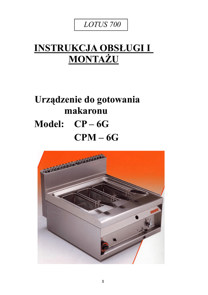 LOTUS 700 INSTRUKCJA OBSŁUGI I MONTAŻU Urządzenie do gotowania makaronu Model: CP – 6G CPM – 6G 1 SPIS TREŚCI: Oświadczenie zgodności norm 4 Montaż 4 Rurka do podłączenia gazu 5 Kontrola ustawienia urządzenia 5 Informacje o przebudowie i instal.na inny rodzaj.gazu 6 Wymiana dyszy palnika głównego 6 Wymiana dyszy palnika pilotującego 6 Kontrola prawidłowej pracy urządzenia 6 Konserwacja 6 Instrukcja obsługi 6 Zapalenie palnika głównego 7 Zapalenie palnika pilotującego 7 Zapalenie palnika głównego i regulacja temperatury 7 Wyłączenie palnika głównego 7 Wyłączenie urządzenia 7 Wypuszczenie wanny 7 Instrukcja na odprowadzenie spalin gazu 7 Uwagi i zalecenia 7 Czyszczenie i konserwacja 8 Postępowanie w razie awarii urządzenia 8 Rysunki 9 – 10 2 Oświadczenie zgodności norm Producent oświadcza, że urządzenia są zgodne z normami. Montaż musi być przeprowadzony zgodnie z obowiązującymi normami, a zwłaszcza; odpowiednie wietrzenie pomieszczeń i system odprowadzenia spalin. Uwaga, Producent nie odpowiada za szkody wynikłe pośrednio lub bezpośrednio przez: złą instalację, niewłaściwą obsługę lub przeróbki, niedostateczną konserwację lub inne przyczyny niezgodne z punktami warunków sprzedaży. Urządzenie to przeznaczone jest do profesjonalnego używania i musi być obsługiwane osobami o odpowiedniej kwalifikacji. Części, które były po nastawieniu i zabezpieczone przez producenta lub pracownika serwisu nie mogą być zmieniane. ROZMIAR POJ. WANNY ROZMIAR KOSZA ( cm ) MOC CIĘŻAR (l) ROZMIAR WANNY ( cm ) MODEL ( cm ) ( kW ) (,kg ) CP – 6G 60x70x29h 27 46x35x25h 3/13,5x32,5x11h 14 40 CPM – 6G 60x70x87h 40 51x31x30h 3/16x29x20h 13,5 74 h – wysokość 3 Montaż urządzenia Montaż, demontaż oraz wszelkie przeróbki powinny być przeprowadzone na podst. pisemnej umowy z autoryzowaną firmą serwisową z zachowaniem przepisów zgodnych z obowiązującymi normami w sprawie montażu i podłączenia urządzenia. . Pomieszczenie w którym będzie montowany piec typu “A”, tj. piec, który nie jest przeznaczony do podłączenia. z kominem, lub innymi urządzeniami do odprowadzenia spalin, musi być dobrze i często wietrzone, aby zapobiec gromadzeniu się w nadmiernej koncentracji szkodliwych dla zdrowia oparów. Powietrze potrzebne do prawidłowej pracy urządzenia to 2m3/h/kW. Urządzenie może być montowane samodzielnie lub w zestawie z urządzeniami naszej produkcji. Należy bezwzględnie utrzymać odległość minimum 10 cm. od materiałów łatwopalnych. Dla dodatkowego zabezpieczenia, materiały łatwopalne należy przegrodzić płytą azbestową. Przepisy P.POŻ : - do obsługi urządzenia gazowego może być wyznaczona wyłącznie osoba dorosła - W okolicznościach, które mogą spowodować jakiekolwiek niebezpieczeństwo powstania pożaru ( np. lepienie gumolitu, płytek PVC itp. ) urządzenie musi być odpowiednio w czas wyłączone - przed montażem urządzenia, użytkownik powinien posiadać wszystkie niezbędne do tego dokumenty - podłączenie urządzenia do komina, gazu lub sieci el. musi przeprowadzić wyłącznie osoba do tego uprawniona - urządzenie powinno być umieszczone tak, aby stało lub pewnie wisiało na niepalnym podkładzie, gdzie powinna być zachowana bezpieczna odległość od innych urządzeń najmniej o 10cm. Na urządzenie lub nie bezpiecznie blisko, nie wolno kłaść przedmiotów łatwopalnych. ( odległość bezpieczna to co najmniej 10 cm) 4 Urządzenie jest wyposażone w nóżki pozwalające na regulację nierówności (poziomowanie). Przy montażu powinny być zachowane mormy bezpieczeństwa : - zachowanie norm p.poż — bezpieczna lokalizacja - pomieszczenia dla urządzeń elektrycznych - profesjonalne podłączenia gazowe na gaz świetlny lub ziemny - zaopatrzenie gazem – przewody gazowe - nejwiększe dopuszczalne ciśnienie do 5 bar Podłączenie wody Wodę podłączamy wężem opancerzonym, przez łatwo dostępny kran zabezpieczający. Odpad musi być umieszczony poniżej spustu z wanny i musi być podłączony do odpływu popoprzez syfon. Średnica do podłączenia wody 3/4” a średnica węża odpadu to 20 mm. Rury do podłączenia gazu: Gaz powinien być podłączony rurką stalową, miedzianą lub giętkim stalowym wężem— zgodnym z normami. Każde urządzenie musi posiadać zawór zabezpieczający, aby można łatwo odłączyć dopływ gazu. Po instalacji urządzenia należy sprawdzć szczelność instalacji gazowej. Urządzenia zostały dokładnie sprawdzone przez producenta, dane o rodzaju gazu, ciśnieniu, i typie urządzenia są podane na tabliczce znamionowej. Kontrola ustawienia urządzenia na rodzaj gazu. Należy sprawdzić czy urządzenie jest przeznaczone na dany rodzaj gazu. Na tabliczce znam. każdego urządzenia jest zaznaczony rodzaj gazu przeznaczony dla danego urządzenia. Informacje o przebudowie i instalacji na inny rodzaj gazu Urządzenia są przystosowane do pracy na gaz.( patrz: tabl.znam.) Przebudowa na inny rodzaj gazu powinna być przeprowadzona przez uprzawniony serwis, dysze na inny rodzaj gazu są dołożone wraz z instrukcją.. 5 Wymiana dyszy palnika głównego rys. A wypuścić wodę z wanny urządzenia usunąć dźwignię blokującą ozn. literką A, poprzez wykręcenie odkręcić śruby górne, które trzymają zasłonę przednią (20) wyciągnąć kabel piezoel. zaplniczki odkręcić nakrętkę (23) ściągnąć zasłonę (24) odkręcić dyszę (22) i nakręcić nową na żądany rodzaj gazu patrz tabl.znam wrócić zasłony (24) do pozycji pierwotnej Wymiana dyszy palnika pilotującego Płomień palnika pilotującego ma stały dopływ powietrza. Jedyna przeróbka to wymiana dyszy palnika (4) w/g rodzaju gazu. Postępowanie jak w poprzednim punkcie, ale odkręcić ścianę (5), zastąpić dyszę nową odpowiadającą rodzajowi gazu. Montując prawidłową dyszę, płomień będzie b. delikatny. Ważne Po przebudowie urządzenia na inny rodzaj 