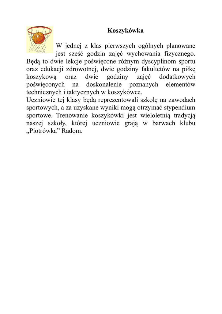 Koszykówka W jednej z klas pierwszych ogólnych planowane jest sześć godzin zajęć wychowania fizycznego. Będą to dwie lekcje poświęcone różnym dyscyplinom sportu oraz edukacji zdrowotnej, dwie godziny fakultetów na piłkę koszykową oraz dwie godziny zajęć dodatkowych poświęconych na doskonalenie poznanych elementów technicznych i taktycznych w koszykówce. Uczniowie tej klasy będą reprezentowali szkołę na zawodach sportowych, a za uzyskane wyniki mogą otrzymać stypendium sportowe. Trenowanie koszykówki jest wieloletnią tradycją naszej szkoły, której uczniowie grają w barwach klubu „Piotrówka” Radom.