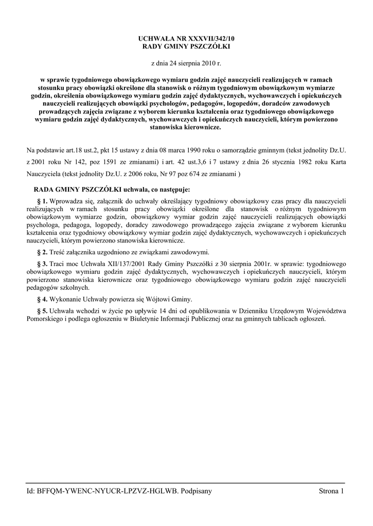 UCHWAŁA NR XXXVII/342/10 RADY GMINY PSZCZÓŁKI z dnia 24 sierpnia 2010 r. w sprawie tygodniowego obowiązkowego wymiaru godzin zajęć nauczycieli realizujących w ramach stosunku pracy obowiązki określone dla stanowisk o różnym tygodniowym obowiązkowym wymiarze godzin, określenia obowiązkowego wymiaru godzin zajęć dydaktycznych, wychowawczych i opiekuńczych nauczycieli realizujących obowiązki psychologów, pedagogów, logopedów, doradców zawodowych prowadzących zajęcia związane z wyborem kierunku kształcenia oraz tygodniowego obowiązkowego wymiaru godzin zajęć dydaktycznych, wychowawczych i opiekuńczych nauczycieli, którym powierzono stanowiska kierownicze. Na podstawie art.18 ust.2, pkt 15 ustawy z dnia 08 marca 1990 roku o samorządzie gminnym (tekst jednolity Dz.U. z 2001 roku Nr 142, poz 1591 ze zmianami) i art. 42 ust.3,6 i 7 ustawy z dnia 26 stycznia 1982 roku Karta Nauczyciela (tekst jednolity Dz.U. z 2006 roku, Nr 97 poz 674 ze zmianami ) RADA GMINY PSZCZÓŁKI uchwala, co następuje: § 1. Wprowadza się, załącznik do uchwały określający tygodniowy obowiązkowy czas pracy dla nauczycieli realizujących w ramach stosunku pracy obowiązki określone dla stanowisk o różnym tygodniowym obowiązkowym wymiarze godzin, obowiązkowy wymiar godzin zajęć nauczycieli realizujących obowiązki psychologa, pedagoga, logopedy, doradcy zawodowego prowadzącego zajęcia związane z wyborem kierunku kształcenia oraz tygodniowy obowiązkowy wymiar godzin zajęć dydaktycznych, wychowawczych i opiekuńczych nauczycieli, którym powierzono stanowiska kierownicze. § 2. Treść załącznika uzgodniono ze związkami zawodowymi. § 3. Traci moc Uchwała XII/137/2001 Rady Gminy Pszczółki z 30 sierpnia 2001r. w sprawie: tygodniowego obowiązkowego wymiaru godzin zajęć dydaktycznych, wychowawczych i opiekuńczych nauczycieli, którym powierzono stanowiska kierownicze oraz tygodniowego obowiązkowego wymiaru godzin zajęć nauczycieli pedagogów szkolnych. § 4. Wykonanie Uchwały powierza się Wójtowi Gminy. § 5. Uchwała wchodzi w życie po upływie 14 dni od opublikowania w Dzienniku Urzędowym Województwa Pomorskiego i podlega ogłoszeniu w Biuletynie Informacji Publicznej oraz na gminnych tablicach ogłoszeń. Id: BFFQM-YWENC-NYUCR-LPZVZ-HGLWB. Podpisany Strona 1 Załącznik do Uchwały Nr XXXVII/342/10 Rady Gminy Pszczółki z dnia 24 sierpnia 2010 r. określający: tygodniowy obowiązkowy wymiar godzin zajęć nauczycieli realizujących w ramach stosunku pracy obowiązki określone dla stanowisk o różnym tygodniowym obowiązkowym wymiarze godzin, określający: obowiązkowy wymiar godzin zajęć dydaktycznych, wychowawczych i opiekuńczych nauczycieli realizujących obowiązki psychologów, pedagogów, logopedów, doradców zawodowych prowadzących zajęcia związane z wyborem kierunku kształcenia oraz określający tygodniowy obowiązkowy wymiar godzin zajęć dydaktycznych, wychowawczych i opiekuńczych nauczycieli, którym powierzono stanowiska kierownicze. § 1. W celu ustalenia tygodniowego obowiązkowego czasu pracy dla nauczyciela realizującego w ramach stosunku pracy obowiązki określone dla stanowisk o różnym tygodniowym obowiązkowm wymiarze godzin należy, korzystać z następującego wzoru: 1)tygodniowy obowiązkowy czas pracy = liczba godzin przydzielonych w arkuszu organizacyjnym szkoły podzielona przez współczynnik X. współczynnik X = ilość godzin przydzielonych nauczycielowi w arkuszu organizacyjnym szkoły w danym wymiarze czasu pracy podzielona przez wymiar czasu pracy nauczyciela zgodniez art. 42 ust. 3 Karty Nauczyciela + ilość godzin przydzielonych nauczycielowi w arkuszu organizacyjnym szkoły w danym wymiarze czasu pracy podzielona przez wymiar czasu pracy nauczyciela zgodnie z art. 42 ust. 3 Karty Nauczyciela + n. gdzie n- kolejne, inne wymiary czasu pracy przydzielone nauczycielowi w arkuszu organizacyjnym . Sposób przeliczenia przedstawia przykład: Nauczyciel realizuje etap połączony 12/18 15/30 X=(12/18)+(15/30)=0,67+0,50=1,17 Liczba godzin przydzielonych nauczycielowi w arkuszu organizacyjnym szkoły: 12+15=27 Tygodniowy obowiązkowy czas pracy = 27/1,17 = 23,08 = 23 2)Obliczony tygodniowy obowiązkowy czas pracy w ułamku dziesiętnym zaokrągla się do godziny w ten sposób, że wielkości wynoszące mniej niż 0,5 pomija się, 0,5 i więcej podwyższa się do pełnej liczby Tygodniowy obowiązkowy czas pracy dla nauczyciela wg przykładu wynosi 23 godziny tygodniowo. 3)Jeżeli ilość godzin przydzielona nauczycielowi w arkuszu organizacyjnym szkoły jest większa niż ustalony zgodnie z treścią ppkt 1 obowiązkowy tygodniowy wymiar godzin, należy od liczby godzin przydzielonych nauczycielowi odjąć liczbę godzin ustaloną zgodnie z wzorem określonym w ppkt 1 . Tak ustalone godziny stanowią pracę w godzinach ponadwymiarowych. 4)Wartość godzin ponadwymiarowych oblicza się według stawki osobistego zaszeregowania i ustalonego tygodniowego obowiązkowego czasu pracy nauczyciela. 5)Tygodniowy obowiązkowy czas pracy dla nauczycieli ustala się dla każdego nauczyciela i na jeden rok szkolny. 6)Odpowiedzialnym za prawidłowe ustalenie tygodniowego obowiązkowego czasu pracy jest Dyrektor szkoły lub przedszkola, który zatrudnia nauczyciela. Id: BFFQM-YWENC-NYUCR-LPZVZ-HGLWB. Podpisany Strona 1 § 2. Określa się tygodniowy, obowiązkowy, wymiar godzin zajęć nauczyciela zatrudnionego na stanowisku pedagoga szkolnego psychologa szkolnego , logopedy, doradcy zawodowego prowadzącego zajęcia związane z wyborem kierunku kształcenia w wymiarze 20 godzin . § 3. Nauczycielom, którym powierzono stanowiska kierownicze w przedszkolach i szkołach, obniża się tygodniowy obowiązkowy wymiar godzin zajęć dydaktycznych, wychowawczych i opiekuńczych, określony w art.42 ust.3 ustawy z dnia 26 stycznia 1982 roku-Karta Nauczyciela (Dz. U. z 2006 roku Nr 97, poz 674 ze zmianami) do następującego wymiaru