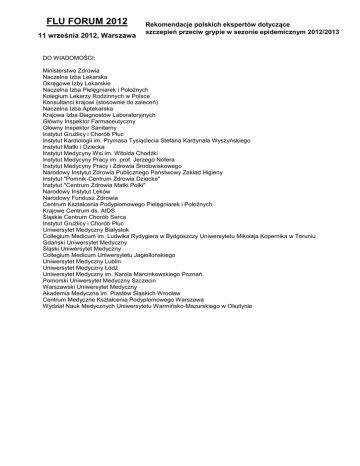 FLU FORUM 2012 11 września 2012, Warszawa Rekomendacje polskich ekspertów dotyczące szczepień przeciw grypie w sezonie epidemicznym 2012/2013 DO WIADOMOŚCI: Ministerstwo Zdrowia Naczelna Izba Lekarska Okręgowe Izby Lekarskie Naczelna Izba Pielęgniarek i Położnych Kolegium Lekarzy Rodzinnych w Polsce Konsultanci krajowi (stosownie do zaleceń) Naczelna Izba Aptekarska Krajowa Izba Diagnostów Laboratoryjnych Główny Inspektor Farmaceutyczny Główny Inspektor Sanitarny Instytut Gruźlicy i Chorób Płuc Instytut Kardiologii im. Prymasa Tysiąclecia Stefana Kardynała Wyszyńskiego Instytut Matki i Dziecka Instytut Medycyny Wsi im. Witolda Chodźki Instytut Medycyny Pracy im. prof. Jerzego Nofera Instytut Medycyny Pracy i Zdrowia Środowiskowego Narodowy Instytut Zdrowia Publicznego Państwowy Zakład Higieny Instytut "Pomnik-Centrum Zdrowia Dziecka" Instytut "Centrum Zdrowia Matki Polki" Narodowy Instytut Leków Narodowy Fundusz Zdrowia Centrum Kształcenia Podyplomowego Pielęgniarek i Położnych Krajowe Centrum ds. AIDS Śląskie Centrum Chorób Serca Instytut Gruźlicy i Chorób Płuc Uniwersytet Medyczny Białystok Collegium Medicum im. Ludwika Rydygiera w Bydgoszczy Uniwersytetu Mikołaja Kopernika w Toruniu Gdański Uniwersytet Medyczny Śląski Uniwersytet Medyczny Collegium Medicum Uniwersytetu Jagiellońskiego Uniwersytet Medyczny Lublin Uniwersytet Medyczny Łódź Uniwersytet Medyczny im. Karola Marcinkowskiego Poznań Pomorski Uniwersytet Medyczny Szczecin Warszawski Uniwersytet Medyczny Akademia Medyczna im. Piastów Śląskich Wrocław Centrum Medyczne Kształcenia Podyplomowego Warszawa Wydział Nauk Medycznych Uniwersytetu Warmińsko-Mazurskiego w Olsztynie FLU FORUM 2012 11 września 2012, Warszawa Rekomendacje polskich ekspertów dotyczące szczepień przeciw grypie w sezonie epidemicznym 2012/2013 LIST OTWARTY DO POLSKICH LEKARZY Szanowna Pani Doktor! Szanowny Panie Doktorze! W ostatnim sezonie epidemicznym 2011/2012, Narodowy Instytut Zdrowia Publicznego już po raz kolejny odnotował w Polsce ponad 1 milion zachorowań lub podejrzeń zachorowania na grypę. Spowodowała ona, co najmniej 3 289 hospitalizacji, Były to jedynie przypadki zarejestrowane, które stanowią zaledwie część wszystkich zachorowań i hospitalizacji z tego powodu. Szczepienia są powszechnie uznaną metodą profilaktyki i kontroli grypy. Potwierdzają to zarówno wyniki wieloletnich, odpowiednio skonstruowanych badań naukowych, jak również powszechne rekomendacje szczepień populacyjnych, w szczególności pacjentów z grup ryzyka powikłań pogrypowych, takich instytucji zdrowia publicznego jak WHO, Komitet Doradczy ds. Szczepień (ACIP) USA, Europejska Naukowa Grupa Robocza ds. Grypy (ESWI), Główny Inspektorat Sanitarny, Zakład Badania Wirusów Grypy - Krajowy Ośrodek ds. Grypy w NIZP – PZH w Polsce. W tym sezonie szczepienie będzie szczególnie istotne ze względu na fakt, że w szczepionkach przeciw grypie pojawiły się dwa nowe szczepy, które będą dominowały w tym sezonie w populacji. Światowa Organizacja Zdrowia i Rada Unii Europejskiej zalecają osiągnięcie poziomu zaszczepienia na poziomie 75% w populacji osób powyżej 65 r.ż. i z grup ryzyka. Niepokojący jest wobec tego fakt, że w ostatnim sezonie epidemicznym w Polsce odsetek szczepień wśród osób starszych wyniósł poniżej 15% natomiast w całej populacji przeciwko grypie w naszym kraju zaszczepiło się ok. 4,5%, co jest jednym z najniższych wskaźników w Europie. Dodatkowo, jeśli chodzi o poziom zaszczepienia, już od kilku lat obserwowana jest tendencja spadkowa. Osiągnięcie celów stawianych przez WHO umożliwiłoby ograniczenie szerzenia się grypy, zmniejszenie liczby zgonów spowodowanych tą chorobą, a także obniżenie kosztów pośrednich i bezpośrednich ponoszonych w okresie epidemii. Oszacowano, że same tylko koszty pośrednie związane z grypą to co roku powyżej 600 mln zł. Wiele jest przyczyn tak słabej realizacji powszechnie uznanych zaleceń dotyczących szczepień. Oprócz rozwiązań systemowych i konieczności poniesienia odpowiednich nakładów finansowych, równie ważna jest świadomość, zarówno całego społeczeństwa, jak również środowisk medycznych. Badania wskazują, że rekomendacja lekarza odgrywa kluczową rolę w procesie decyzyjnym pacjenta dotyczącym skorzystania ze szczepienia przeciw grypie. Dlatego w każdym kolejnym sezonie epidemicznym tak ważne jest poświęcenie czasu i zwrócenie uwagi na profilaktykę przeciwgrypową, szczególnie osób w podeszłym wieku i chorych na przewlekłe choroby. Jest to ważne także z tego powodu, że pacjenci na podstawie zasłyszanych lub przeczytanych, wielokrotnie niewiarygodnych informacji, podejmują często nieracjonalne decyzje o rezygnacji ze szczepienia, w obawie przed działaniami niepożądanymi lub nieświadomi potrzebnej im profilaktyki. Wielka jest zatem rola lekarzy, którzy powinni być niekwestionowanymi autorytetami w sprawach zdrowia. Lekarze i cały personel medyczny z powodów epidemiologicznych są zobowiązani do poddawania się co roku szczepieniu przeciw grypie. Czynić tak powinni dla bezpieczeństwa swojego a także bezpieczeństwa chorych, którymi się opiekują. Zachęcając pacjentów do regularnych szczepień, a przy tym stanowiąc dla nich pozytywny przykład, macie Państwo realny wpływ na to, jak wielu z nich uniknie zakażenia grypą i jej groźnych następstw. W załączeniu informacje dotyczące omawianego problemu. I. Polskie dane epidemiologiczne a. Grypa – zachorowania, hospitalizacje, zgony b. Szczepienia przeciw grypie II. Wskazania do szczepień a. Wskazania kliniczne b. Wskazania epidemiologiczne III. Przeciwwskazania do szczepień IV. Szczepionki przeciw grypie a. Szczepy zatwierdzone przez WHO b. Szczepionki dostępne w sezonie 2012/2013 c. Dawkowanie V. Szczepienia przeciw grypie osób z grupy podwyższonego ryzyka Opracowano na podstawie: 1. Prevention an