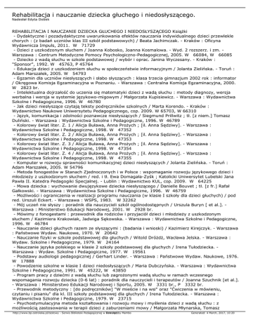 Rehabilitacja i nauczanie dziecka głuchego i niedosłyszącego. Nadesłał Edyta Dobek REHABILITACJA I NAUCZANIE DZIECKA GŁUCHEGO I NIEDOSŁYSZĄCEGO Książki - Dydaktyczne i pozadydaktyczne uwarunkowania efektów nauczania indywidualnego dzieci przewlekle chorych : (z badań uczniów klas III szkół podstawowych) / Beata Jachimczak. - Kraków : Oficyna Wydawnicza Impuls, 2011. W 71729 - Dzieci z uszkodzonym słuchem / Joanna Kobosko, Joanna Kosmalowa. - Wyd. 2 rozszerz. i zm. Warszawa : Centrum Metodyczne Pomocy Psychologiczno-Pedagogicznej, 2005. W 66084, W 66085 - Dziecko z wadą słuchu w szkole podstawowej / wybór i oprac. Janina Wyczesany. - Kraków : "Sponsor", 1992. W 45763, P 45764 - Edukacja dzieci z uszkodzeniem słuchu w społeczeństwie informacyjnym / Jolanta Zielińska. - Toruń : Adam Marszałek, 2005. W 54793 - Egzamin dla uczniów niesłyszących i słabo słyszących : klasa trzecia gimnazjum 2002 rok : informator / Okręgowa Komisja Egzaminacyjna w Poznaniu. - Warszawa : Centralna Komisja Egzaminacyjna, 2000. W 2823 br. - Intelektualna dojrzałość do uczenia się matematyki dzieci z wadą słuchu : metody diagnozy, wersja werbalna i wersja w systemie językowo-migowym / Małgorzata Kupisiewicz. - Warszawa : Wydawnictwa Szkolne i Pedagogiczne, 1996. W 46780 - Jak dzieci niesłyszące czytają teksty podręczników szkolnych / Marta Korendo. - Kraków : Wydawnictwo Naukowe Uniwersytetu Pedagogicznego, cop. 2009. W 65703, W 66310 - Język, komunikacja i zdolności poznawcze niesłyszących / Siegmund Prillwitz ; tł. [z niem.] Tomasz Duliński. - Warszawa : Wydawnictwa Szkolne i Pedagogiczne, 1996. W 46789 - Kolorowy świat liter. Z. 1 / Alicja Buława, Anna Prożych ; [il. Anna Sędziwy]. - Warszawa : Wydawnictwa Szkolne i Pedagogiczne, 1998. W 47352 - Kolorowy świat liter. Z. 2 / Alicja Buława, Anna Prożych ; [il. Anna Sędziwy]. - Warszawa : Wydawnictwa Szkolne i Pedagogiczne, 1998. W 47353 - Kolorowy świat liter. Z. 3 / Alicja Buława, Anna Prożych ; [il. Anna Sędziwy]. - Warszawa : Wydawnictwa Szkolne i Pedagogiczne, 1998. W 47354 - Kolorowy świat liter. Z. 4 / Alicja Buława, Anna Prożych ; [il. Anna Sędziwy]. - Warszawa : Wydawnictwa Szkolne i Pedagogiczne, 1998. W 47355 - Komputer w rozwoju sprawności komunikacyjnej dzieci niesłyszących / Jolanta Zielińska. - Toruń : Adam Marszałek, 2005. W 54796 - Metoda fonogestów w Stanach Zjednoczonych i w Polsce : wspomaganie rozwoju językowego dzieci i młodzieży z uszkodzonym słuchem / red. i tł. Ewa Domagała-Zyśk ; Katolicki Uniwersytet Lubelski Jana Pawła II. Katedra Pedagogiki Specjalnej. - Lublin : Wydawnictwo KUL, cop. 2009. W 64225 - Mowa dziecka : wychowanie dwujęzykowe dziecka niesłyszącego / Danielle Bouvet ; tł. [z fr.] Rafał Gałkowski. - Warszawa : Wydawnictwa Szkolne i Pedagogiczne, 1996. W 46759 - Możliwości i ograniczenia w realizacji programu nauczania (w klasie I szkoły dla dzieci głuchych) / pod red. Urszuli Eckert. - Warszawa : WSPS, 1983. W 32262 - Mój uczeń nie słyszy : poradnik dla nauczycieli szkół ogólnodostępnych / Urszula Buryn [ et al.]. Warszawa : Ministerstwo Edukacji Narodowej, 2001. W 2928 br. - Mówimy z fonogestami : przewodnik dla rodziców i przyjaciół dzieci i młodzieży z uszkodzonym słuchem / Kazimiera Krakowiak, Jadwiga Sękowska. - Warszawa : Wydawnictwa Szkolne i Pedagogiczne, 1996. W 46784 - Nauczanie dzieci głuchych razem ze słyszącymi : (badania i wnioski) / Kazimierz Kirejczyk. - Warszawa : Państwowe Wydaw. Naukowe, 1970. W 20642 - Nauczanie fizyki w szkole podstawowej dla głuchych / Witold Dróżdż, Wacława Jelska. - Warszawa : Wydaw. Szkolne i Pedagogiczne, 1979. W 24164 - Nauczanie języka polskiego w klasie 2 szkoły podstawowej dla głuchych / Irena Tułodziecka. Warszawa : Wydaw. Szkolne i Pedagogiczne, 1977. W 19561 - Podstawy audiologii pedagogicznej / Gerhart Linder. - Warszawa : Państwowe Wydaw. Naukowe, 1976. W 17888 - Powodzenie szkolne w klasie I dzieci niedosłyszących / Maria Dubczyńska. - Warszawa : Wydawnictwa Szkolne i Pedagogiczne, 1991. W 45222, W 43850 - Program pracy z dziećmi z wadą słuchu lub zagrożonymi wadą słuchu w ramach wczesnego wspomagania rozwoju dziecka (0-6 lat) : poradnik dla nauczycieli i terapeutów / Joanna Szuchnik [et al.]. - Warszawa : Ministerstwo Edukacji Narodowej i Sportu, 2005. W 3331 br., P 3332 br. - Przewodnik metodyczny : [do podręczników] "W mieście i na wsi" oraz "Ćwiczenia w mówieniu, czytaniu i pisaniu" dla kl. III szkoły podstawowej dla głuchych / Irena Tułodziecka. - Warszawa : Wydawnictwa Szkolne i Pedagogiczne, 1979. W 23715 - Psychostymulacyjna metoda kształtowania i rozwoju mowy i myślenia dzieci z wadą słuchu : z możliwością zastosowania w terapii dzieci z zaburzeniami mowy / Małgorzata Młynarska, Tomasz http://www.bp.ostroleka.pl/testowy - Serwis Biblioteki Pedagogicznej w Ostrołęce Powered by Mambo Generated: 4 March, 2017, 10:20 Smereka. - Warszawa : Wydaw. Szkol. i Pedagog, 2000. W 48949 - Rehabilitacja małych dzieci z wadą słuchu / Maria Góralówna, Bożena Hołyńska. - Warszawa : Państ. Zakład Wydawnictw Lekarskich, 1984. W 33717, W 33718 - Relacje dziecka z wadą słuchu w szkole / Aneta Jegier, Magdalena Kosowska. - Warszawa : Difin, 2011. W 68080, W 68079 - Rozwijanie mowy dzieci głuchych w nauczaniu początkowym / Irena Stawowy-Wojnarowska. Warszawa : Wydaw. Szkolne i Pedagogiczne, 1978. W 25529, W 20549, W 20980 - Rozwój językowy dziecka z uszkodzonym słuchem a integracja edukacyjna : model kształcenia integracyjnego / Grażyna Dryżałowska. - Wyd. 2 zm. i rozszerz. - Warszawa : Wydawnictwa Uniwersytetu Warszawskiego, 2007. W 59275, W 59276 - Rozwój językowy dziecka z uszkodzonym słuchem a integracja edukacyjna : model kształcenia integracyjnego / Grażyna Dryżałowska. - Warszawa : Wydawnictwa Uniwersytetu Warszawskiego, 1997. W 62845 - Słuchowo-werbalne wychowanie dzieci z uszkodzonym narządem słuchu :