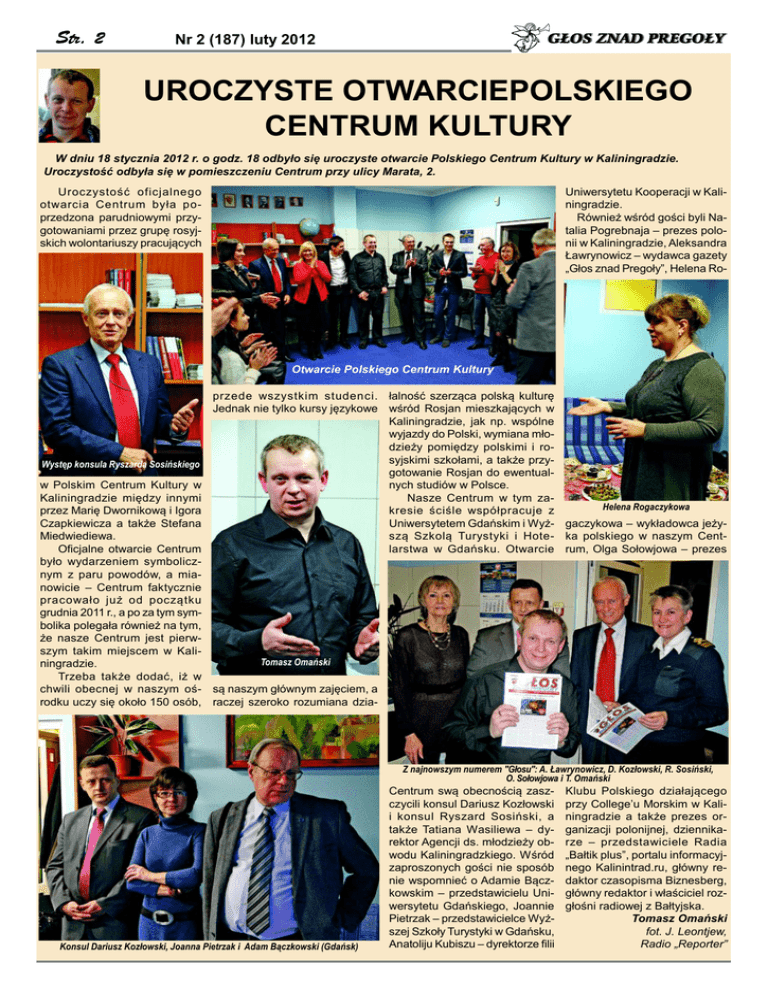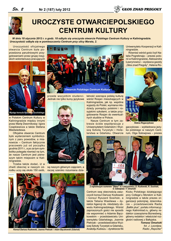 Str. 2 Nr 2 (187) luty 2012 UROCZYSTE OTWARCIEPOLSKIEGO CENTRUM KULTURY W dniu 18 stycznia 2012 r. o godz. 18 odbyło się uroczyste otwarcie Polskiego Centrum Kultury w Kaliningradzie. Uroczystość odbyła się w pomieszczeniu Centrum przy ulicy Marata, 2. Uroczystość oficjalnego otwarcia Centrum była poprzedzona parudniowymi przygotowaniami przez grupę rosyjskich wolontariuszy pracujących Uniwersytetu Kooperacji w Kaliningradzie. Również wśród gości byli Natalia Pogrebnaja – prezes polonii w Kaliningradzie, Aleksandra Ławrynowicz – wydawca gazety „Głos znad Pregoły”, Helena Ro- Otwarcie Polskiego Centrum Kultury Występ konsula Ryszarda Sosińskiego przede wszystkim studenci. łalność szerząca polską kulturę Jednak nie tylko kursy językowe wśród Rosjan mieszkających w Kaliningradzie, jak np. wspólne wyjazdy do Polski, wymiana młodzieży pomiędzy polskimi i rosyjskimi szkołami, a także przygotowanie Rosjan do ewentualnych studiów w Polsce. Nasze Centrum w tym zaHelena Rogaczykowa kresie ściśle współpracuje z Uniwersytetem Gdańskim i Wyż- gaczykowa – wykładowca jeżyszą Szkolą Turystyki i Hote- ka polskiego w naszym Centlarstwa w Gdańsku. Otwarcie rum, Olga Sołowjowa – prezes w Polskim Centrum Kultury w Kaliningradzie między innymi przez Marię Dwornikową i Igora Czapkiewicza a także Stefana Miedwiediewa. Oficjalne otwarcie Centrum było wydarzeniem symbolicznym z paru powodów, a mianowicie – Centrum faktycznie pracowało już od początku grudnia 2011 r., a po za tym symbolika polegała również na tym, że nasze Centrum jest pierwszym takim miejscem w KaliTomasz Omański ningradzie. Trzeba także dodać, iż w chwili obecnej w naszym oś- są naszym głównym zajęciem, a rodku uczy się około 150 osób, raczej szeroko rozumiana dzia- Z najnowszym numerem "Głosu": A. Ławrynowicz, D. Kozłowski, R. Sosiński, O. Sołowjowa i T. Omański Konsul Dariusz Kozłowski, Joanna Pietrzak i Adam Bączkowski (Gdańsk) Centrum swą obecnością zaszczycili konsul Dariusz Kozłowski i konsul Ryszard Sosiński, a także Tatiana Wasiliewa – dyrektor Agencji ds. młodzieży obwodu Kaliningradzkiego. Wśród zaproszonych gości nie sposób nie wspomnieć o Adamie Bączkowskim – przedstawicielu Uniwersytetu Gdańskiego, Joannie Pietrzak – przedstawicielce Wyższej Szkoły Turystyki w Gdańsku, Anatoliju Kubiszu – dyrektorze filii Klubu Polskiego działającego przy College’u Morskim w Kaliningradzie a także prezes organizacji polonijnej, dziennikarze – przedstawiciele Radia „Bałtik plus”, portalu informacyjnego Kalinintrad.ru, główny redaktor czasopisma Biznesberg, główny redaktor i właściciel rozgłośni radiowej z Bałtyjska. Tomasz Omański fot. J. Leontjew, Radio „Reporter”