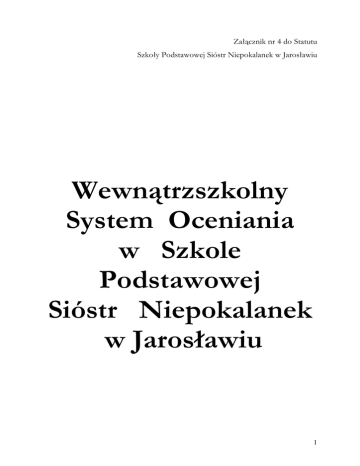 Załącznik nr 4 do Statutu Szkoły Podstawowej Sióstr Niepokalanek w Jarosławiu Wewnątrzszkolny System Oceniania w Szkole Podstawowej Sióstr Niepokalanek w Jarosławiu 1 I. Uwagi wstępne 1. Szkolny System Oceniania został opracowany w oparciu o rozporządzenia MENiS z dnia 7 września 2004 r. w sprawie warunków i sposobu oceniania, klasyfikowania i promowania uczniów i słuchaczy oraz przeprowadzania egzaminów i sprawdzianów w szkołach publicznych, a także z uwzględnieniem Rozporządzenia MEN z dnia 22 lutego 2002 r. w sprawie podstawy programowej kształcenia ogólnego i Szkolnego Zestawu Programów Nauczania oraz Rozporządzenia Ministra Edukacji Narodowej z dn. 8 września 2006 r. zmieniające rozporządzenie w sprawie warunków i sposobu oceniania, klasyfikowania i promowania uczniów i słuchaczy oraz przeprowadzania sprawdzianów i egzaminów w szkołach publicznych. (Dz.U. z 2006r. Nr 164, poz. 1154). 2. W sprawach nieujętych w Szkolnym Systemie Oceniania obowiązują przepisy Rozporządzenia MENiS z dnia 7 września 2004 r. (z późniejszymi zmianami). II. Cele systemu 1. Ocenianiu podlegają: a. osiągnięcia edukacyjne ucznia; b. zachowanie ucznia. 2. Ocenianie osiągnięć edukacyjnych ucznia polega na rozpoznawaniu przez nauczycieli poziomu i postępów w opanowaniu przez ucznia wiadomości i umiejętności w stosunku do wymagań edukacyjnych wynikających z podstawy programowej, określonej w odrębnych przepisach, i realizowanych w szkole programów nauczania, uwzględniających tę podstawę. 3. Ocenianie zachowania ucznia polega na rozpoznawaniu przez wychowawcę klasy, nauczycieli oraz uczniów danej klasy stopnia respektowania przez ucznia zasad współżycia społecznego i norm etycznych. 4. Ocenianie wewnątrzszkolne ma na celu: a. informowanie ucznia o poziomie jego osiągnięć edukacyjnych i jego zachowaniu oraz o postępach w tym zakresie; b. udzielanie uczniowi pomocy w samodzielnym planowaniu swojego rozwoju; c. motywowanie ucznia do dalszych postępów w nauce i zachowaniu; d. dostarczenie rodzicom (prawnym opiekunom) i nauczycielom informacji o postępach, trudnościach w nauce, zachowaniu oraz specjalnych uzdolnieniach ucznia; e. umożliwienie nauczycielom doskonalenia organizacji i metod pracy dydaktyczno - wychowawczej. 2 III. Sposoby sprawdzania osiągnięć uczniów 1. Pierwszy etap edukacyjny : 1) nauczyciel w klasach I-III prowadzi : a) kontrolę ciągłą, bezpośrednią i bieżącą w toku codziennych zajęć, badaną następującymi metodami : obserwację pracy poszczególnych uczniów, wywiady, ankiety przeprowadzone z rodzicami i z dziećmi, badania socjometryczne. b) kontrolę doraźną, pozwalającą wyrywkowo rozpoznać osiągnięcia uczniów, obejmującą : kontrolne karty pracy ucznia, wypracowania, rozwiązywanie zadań, prace domowe, konkursy, samoocena (próby samooceny w klasach). 2) Kontrola doraźna ma charakter diagnostyczno - informacyjny. 2. Drugi etap edukacyjny : 1) W klasach IV - VI nauczyciele stosują następujące formy i narzędzia pomiarowe w zakresie sprawdzania stopnia opanowania wiadomości i umiejętności : a) odpowiedzi ustne, b) kartkówki, c) klasówki ( sprawdziany ), d) testy, e) obserwacje (aktywność na lekcji, umiejętność pracy w grupie), f) prace domowe, g) prace kontrolne krótkoterminowe i długoterminowe uczniów ewaluacja na początku i na końcu roku szkolnego. 2) Wprowadzenie ankiet ewaluacyjnych pozwala nauczycielowi zdiagnozowanie skuteczności zorganizowanego procesu nauczania. 3. na Szczegółowe sposoby i formy sprawdzania poziomu osiągnięć uczniów: a. Sprawdziany i prace klasowe przeznaczone są na jedną godzinę lekcyjną (wyjątek stanowią zadania klasowe z języka polskiego przewidziane na dwie godziny lekcyjne), obejmują tematykę pewnej partii materiału np. dział (moduł); o przewidywanym terminie ich odbycia uczniowie zostają poinformowani co najmniej tydzień wcześniej; w ciągu dnia może się odbyć tylko jeden sprawdzian; w ciągu tygodnia nie więcej niż trzy sprawdziany; 3 o wynikach sprawdzianu (pracy pisemnej) nauczyciel informuje uczniów w terminie nie przekraczającym trzech tygodni. b. Odpowiedzi ustne, kartkówki i inne wymienione w punkcie 3 b obejmują swym zasięgiem zagadnienia realizowane na 3-5 (w zależności od specyfiki przedmiotu) ostatnich jednostkach tematycznych; uczeń nie musi być informowany o terminie ich odbycia; ilość i częstotliwość tej formy sprawdzania osiągnięć uczniów ustalają nauczyciele danego przedmiotu. c. Prace domowe zadawane z dnia na dzień mogą mieć charakter krótkich zadań, związanych z przygotowaniem do kolejnych lekcji lub utrwaleniem świeżo nabytej wiedzy; odrobienie każdej pracy domowej powinno być skontrolowane przez nauczyciela, nie każdą musi on sprawdzać i ocenić konkretnym stopniem; częstotliwość zadawania i termin sprawdzania pracy domowej określają nauczyciele uczący danego przedmiotu w zależności od specyfiki tego przedmiotu. Każdorazowe nieodrobienie zdania domowego powinno być odnotowane w dzienniku; poszczególni nauczyciele w przedmiotowych systemach oceniania ustalają w jakich okolicznościach brak zadania skutkuje oceną niedostateczną. d. Przejawy aktywności i zaangażowania ucznia podlegające ocenie to: zaangażowanie i praca na lekcji, wytwory działalności ucznia, np.: modele, przyrządy, pomoce dydaktyczne, długoterminowe prace, referaty, ciekawostki, własna praca doświadczalna, laboratoryjna, udział w konkursach i zawodach, sprawowanie opieki nad eksponatami w pracowniach przedmiotowych, uzupełnianie ich zawartości itp. Jako przejaw zaangażowania i aktywności nauczyciel może również uznać systematyczne sporządzanie własnych notatek z lekcji. e. Uczeń ma prawo poprawić ocenę niedostateczną ze sprawdzianu i pracy klasowej w terminie do dwóch tygodni po uzyskaniu informacji o uzyskanej ocenie. Poszczególni nauczyciele w przedmiotowych syste