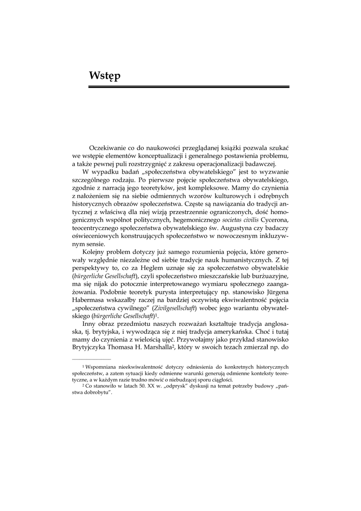 Wstęp Oczekiwanie co do naukowości przeglądanej książki pozwala szukać we wstępie elementów konceptualizacji i generalnego postawienia problemu, a także pewnej puli rozstrzygnięć z zakresu operacjonalizacji badawczej. W wypadku badań „społeczeństwa obywatelskiego” jest to wyzwanie szczególnego rodzaju. Po pierwsze pojęcie społeczeństwa obywatelskiego, zgodnie z narracją jego teoretyków, jest kompleksowe. Mamy do czynienia z nałożeniem się na siebie odmiennych wzorów kulturowych i odrębnych historycznych obrazów społeczeństwa. Częste są nawiązania do tradycji antycznej z właściwą dla niej wizją przestrzennie ograniczonych, dość homogenicznych wspólnot politycznych, hegemonicznego societas civilis Cycerona, teocentrycznego społeczeństwa obywatelskiego św. Augustyna czy badaczy oświeceniowych konstruujących społeczeństwo w nowoczesnym inkluzywnym sensie. Kolejny problem dotyczy już samego rozumienia pojęcia, które generowały względnie niezależne od siebie tradycje nauk humanistycznych. Z tej perspektywy to, co za Heglem uznaje się za społeczeństwo obywatelskie (bürgerliche Gesellschaft), czyli społeczeństwo mieszczańskie lub burżuazyjne, ma się nijak do potocznie interpretowanego wymiaru społecznego zaangażowania. Podobnie teoretyk purysta interpretujący np. stanowisko Jürgena Habermasa wskazałby raczej na bardziej oczywistą ekwiwalentność pojęcia „społeczeństwa cywilnego” (Zivilgesellschaft) wobec jego wariantu obywatelskiego (bürgerliche Gesellschaft)1. Inny obraz przedmiotu naszych rozważań kształtuje tradycja anglosaska, tj. brytyjska, i wywodząca się z niej tradycja amerykańska. Choć i tutaj mamy do czynienia z wielością ujęć. Przywołajmy jako przykład stanowisko Brytyjczyka Thomasa H. Marshalla2, który w swoich tezach zmierzał np. do ________________ 1 Wspomniana nieekwiwalentność dotyczy odniesienia do konkretnych historycznych społeczeństw, a zatem sytuacji kiedy odmienne warunki generują odmienne konteksty teoretyczne, a w każdym razie trudno mówić o niebudzącej sporu ciągłości. 2 Co stanowiło w latach 50. XX w. „odprysk” dyskusji na temat potrzeby budowy „państwa dobrobytu”. 8 WSTĘP dostrzeżenia związku pomiędzy rozwojem sfery socjalnej a poziomem zaangażowania obywatelskiego. Okazuje się zatem, że zależnie od przyjętej orientacji teoretyczno-badawczej i przyjmowanej wizji społeczeństwo przedmiot refleksji może się znacznie różnić, nawet jeżeli jest podobnie nazywany i odwołuje się do podobnego dziedzictwa cywilizacyjnego. To, co znajdzie czytelnik na kartach książki Jak badać społeczeństwo obywatelskie? Doświadczenia praktyków, bliższe jest zapewne tradycji anglosaskiej z jej warstwą badawczą i interpretacyjną, choć i tu pojawia się szereg problemów. Dotyczą one przede wszystkim dość fundamentalnego pytania, czy społeczeństwo obywatelskie da się w ogóle wyodrębnić z całości, którą określa się mianem społeczeństwa per se. Odpowiedź nie jest niestety oczywista. Mamy do czynienia z dyskusją o sposobie identyfikowania agregatów społecznych, które nie do końca poddają się metodologii ilościowej. Wymagają użycia narzędzi mniej wystandaryzowanych, pozbawionych „skłonności” do precyzyjnego wydzielania części z całości oraz przywiązania do zadawania (przeciętnym respondentom) prostych pytań i poszukiwania niebanalnych odpowiedzi. Z drugiej strony, można też zapewne dowodzić pewnego typu kryzysu obywatelskości spychającego na margines konwencjonalne formy angażowania się obywateli. Na potrzeby naszych badań ów stan określiliśmy jako „bezruch społeczny”. Warto w tym miejscu wspomnieć o stosunkowo nielicznych na polskim gruncie próbach całościowego mierzenia poziomu rozwoju i kondycji społeczeństwa obywatelskiego. Szczególne miejsce zajmuje tutaj Stowarzyszenie Klon/Jawor konsekwentnie agregujące dane na temat zmian i kondycji organizacji non profit w naszym kraju. Nieco odmienne podejście do problematyki tzw. III sektora jest w analizach Instytutu Spraw Publicznych, wydającego od kilku lat kwartalnik „III Sektor” (zbierający opracowania na temat szczegółowych zagadnień oraz prezentujący bieżące wyniki badań). Nie są to rzecz jasna wszystkie tego typu próby, nie są to też jedyne projekty realizowane przez przedstawione tu z nazwy instytucje3. Podejmując problem: jak badać społeczeństwo obywatelskie, postanowiliśmy spojrzeć na owo społeczeństwo w taki sposób, by dyskursywnie ________________ 3 Wskażmy tylko na dwa projekty, które ogniskują zainteresowania i dyskusję przynajmniej części środowiska zaangażowanego w badania społeczeństwa obywatelskiego. Po pierwsze będzie to Indeks Społeczeństwa Obywatelskiego (projekt o zasięgu międzynarodowym prowadzony przez organizację CIVICUS) realizowany w Polsce przez Stowarzyszenie Klon/Jawor. Po drugie wprowadzany obecnie w życie projekt Civipedii, skupiającej dokonania polskich badaczy społeczeństwa obywatelskiego. WSTĘP 9 uchwycić, jakiej refleksji na temat społeczeństwa obywatelskiego brakuje. Stawiając (po raz wtóry) kwestę diagnozy społeczeństwa obywatelskiego, okazało się, że dla części zaproszonych przez nas autorów bardziej atrakcyjne było skoncentrowanie na jakościowo interpretowanym „działaniu społecznym” i poprzez to działanie (które da się mniej lub bardziej intuicyjnie zidentyfikować) rozpatrywać tytułowy problem. Takie ujmowanie zagadnienia, z jednej strony zawraca refleksję badawczą ku zhumanizowanym wariantom socjologii działania, z drugiej rozwija wątki za korzenione w modnej współcześnie analizie dyskursu. Zmiana ta jest dosyć widoczna, warto w związku z tym pokusić się o rekapitulację dotychczasowego modelu refleksji badawczej nad społeczeństwem obywatelskim. W artykułach Jak badać społeczeństwo obywatelskie i aktywność społecz
