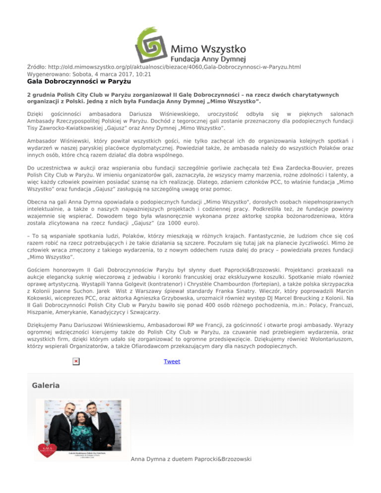 Źródło: http://old.mimowszystko.org/pl/aktualnosci/biezace/4060,Gala-Dobroczynnosci-w-Paryzu.html Wygenerowano: Sobota, 4 marca 2017, 10:21 Gala Dobroczynności w Paryżu 2 grudnia Polish City Club w Paryżu zorganizował II Galę Dobroczynności – na rzecz dwóch charytatywnych organizacji z Polski. Jedną z nich była Fundacja Anny Dymnej „Mimo Wszystko”. Dzięki gościnności ambasadora Dariusza Wiśniewskiego, uroczystość odbyła się̨ w pięknych salonach Ambasady Rzeczypospolitej Polskiej w Paryżu. Dochód z tegorocznej gali zostanie przeznaczony dla podopiecznych fundacji Tisy Zawrocko-Kwiatkowskiej „Gajusz” oraz Anny Dymnej „Mimo Wszystko”. Ambasador Wiśniewski, który powitał wszystkich gości, nie tylko zachęcał ich do organizowania kolejnych spotkań i wydarzeń w naszej paryskiej placówce dyplomatycznej. Powiedział także, że ambasada należy do wszystkich Polaków oraz innych osób, które chcą razem działać dla dobra wspólnego. Do uczestnictwa w aukcji oraz wspierania obu fundacji szczególnie gorliwie zachęcała też Ewa Zardecka-Bouvier, prezes Polish City Club w Paryżu. W imieniu organizatorów gali, zaznaczyła, że wszyscy mamy marzenia, rożne zdolności i talenty, a więc każdy człowiek powinien posiadać szansę na ich realizację. Dlatego, zdaniem członków PCC, to właśnie fundacja „Mimo Wszystko” oraz fundacja „Gajusz” zasługują̨ na szczególną̨ uwagę̨ oraz pomoc. Obecna na gali Anna Dymna opowiadała o podopiecznych fundacji „Mimo Wszystko", dorosłych osobach niepełnosprawnych intelektualnie, a także o naszych najważniejszych projektach i codziennej pracy. Podkreśliła też, że fundacje powinny wzajemnie się wspierać. Dowodem tego była własnoręcznie wykonana przez aktorkę szopka bożonarodzeniowa, która została zlicytowana na rzecz fundacji „Gajusz” (za 1000 euro). – To są wspaniałe spotkania ludzi, Polaków, którzy mieszkają w różnych krajach. Fantastycznie, że ludziom chce się coś razem robić na rzecz potrzebujących i że takie działania są szczere. Poczułam się tutaj jak na planecie życzliwości. Mimo że człowiek wraca zmęczony z takiego wydarzenia, to z nowym oddechem rusza dalej do pracy – powiedziała prezes fundacji „Mimo Wszystko”. Gościem honorowym II Gali Dobroczynnościw Paryżu był słynny duet Paprocki&Brzozowski. Projektanci przekazali na aukcje elegancką suknię wieczorową z jedwabiu i koronki francuskiej oraz ekskluzywne koszulki. Spotkanie miało również oprawę artystyczną. Wystąpili Yanna Golgevit (kontratenor) i Chrystèle Chambourdon (fortepian), a także polska skrzypaczka z Kolonii Joanne Suchon. Jarek Wist z Warszawy śpiewał standardy Franka Sinatry. Wieczór, który poprowadzili Marcin Kokowski, wiceprezes PCC, oraz aktorka Agnieszka Grzybowska, urozmaicił również występ DJ Marcel Breucking z Kolonii. Na II Gali Dobroczynności Polish City Club w Paryżu bawiło się ponad 400 osób różnego pochodzenia, m.in.: Polacy, Francuzi, Hiszpanie, Amerykanie, Kanadyjczycy i Szwajcarzy. Dziękujemy Panu Dariuszowi Wiśniewskiemu, Ambasadorowi RP we Francji, za gościnność i otwarte progi ambasady. Wyrazy ogromnej wdzięczności kierujemy także do Polish City Club w Paryżu, za czuwanie nad przebiegiem wydarzenia, oraz wszystkich firm, dzięki którym udało się zorganizować to ogromne przedsięwzięcie. Dziękujemy również Wolontariuszom, którzy wspierali Organizatorów, a także Ofiarodawcom przekazującym dary dla naszych podopiecznych. Tweet Galeria Anna Dymna z duetem Paprocki&Brzozowski Marcin Kokowski i ambasador Dariusz Wiśniewski Agnieszka Grzybowska i Marcin Kokowski Marta Stachowiak, I attache ambasady Jarek Wist Bawili się goście różnych narodowości Podziel się: