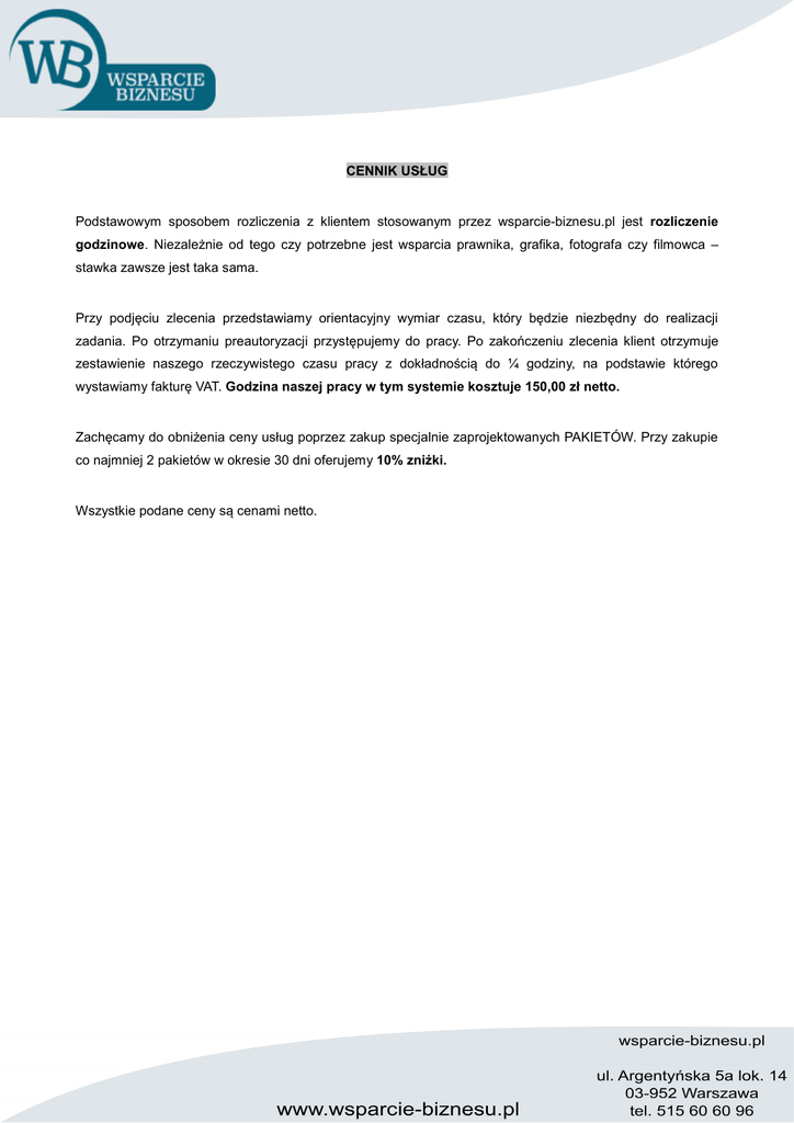 CENNIK USŁUG Podstawowym sposobem rozliczenia z klientem stosowanym przez wsparcie-biznesu.pl jest rozliczenie godzinowe. Niezależnie od tego czy potrzebne jest wsparcia prawnika, grafika, fotografa czy filmowca – stawka zawsze jest taka sama. Przy podjęciu zlecenia przedstawiamy orientacyjny wymiar czasu, który będzie niezbędny do realizacji zadania. Po otrzymaniu preautoryzacji przystępujemy do pracy. Po zakończeniu zlecenia klient otrzymuje zestawienie naszego rzeczywistego czasu pracy z dokładnością do ¼ godziny, na podstawie którego wystawiamy fakturę VAT. Godzina naszej pracy w tym systemie kosztuje 150,00 zł netto. Zachęcamy do obniżenia ceny usług poprzez zakup specjalnie zaprojektowanych PAKIETÓW. Przy zakupie co najmniej 2 pakietów w okresie 30 dni oferujemy 10% zniżki. Wszystkie podane ceny są cenami netto. PAKIETY DLA AKTYWNYCH PRZEDSIĘBIORCÓW 1. PAKIETY STAŁA OBSŁUGA W ramach pakietu STAŁA OBSŁUGA jesteśmy do dyspozycji klienta przez określoną liczbę godzin w • miesiącu. To klient decyduje na co przeznaczyć wykupione godziny. Pakiet STAŁA OBSŁUGA to zobowiązanie na minimum 3 miesiące. ◦ ◦ ◦ 3h naszego czasu do wyboru/miesiąc – 400,00 zł 5h naszego czasu do wyboru/miesiąc - 550,00 zł 10h naszego czasu do wyboru/miesiąc - 900,00 zł 2. PAKIET WIZERUNEK - 2500,00 zł W ramach pakietu WIZERUNEK oferujemy zestaw usług, który pozwoli na szybką i efektywną • poprawę marketingowego wizerunku firmy. W ramach ceny oferujemy: ◦ projekt logo1 ◦ ◦ ◦ ◦ projekt papieru firmowego2 projekt wizytówki internetowej3. zainstalowanie strony na serwerze (jednorazowe), doradztwo w zakresie wyboru domeny, serwera (1h). 3. PAKIET WIZERUNEK PREMIUM – 3800,00 zł ◦ projekt logo, ◦ projekt papieru firmowego, ◦ projekt strony internetowej, ◦ projekt profesjonalnej oferty marketingowej4, ◦ zainstalowanie strony na serwerze (jednorazowe), ◦ doradztwo w zakresie wyboru domeny, serwera (1h), ◦ stworzenie profilów firmy w mediach społecznościowych, ◦ 3h naszego czasu do wyboru. 4. PAKIET FIRMA ROŚNIE- 1700,00 zł • Pakiet FIRMA ROŚNIE to wsparcie w chwili przekroczenia progu zatrudnienia 20 pracowników: ◦ projekt regulaminu pracy, ◦ projekt regulaminu wynagrodzeń, ◦ doradztwo prawne (3h). PAKIETY DLA NOWYCH PRZEDSIĘBIORCÓW Pakiety dla nowych przedsiębiorców to oferta dla tych, którzy chcą otworzyć własny biznes i potrzebują wsparcia, aby postawić pierwszy krok. W ramach każdego pakietu oferujemy pomoc w formalnym rozpoczęciu działalności (przygotowanie wszystkich dokumentów do podpisu) oraz wybrane usługi graficzne. Na tym etapie może pojawić się wiele trudnych do przewidzenia, drobnych problemów i dlatego każdy pakiet zawiera dodatkowe godziny naszego czasu do wykorzystania według uznania klienta. A. PAKIET START – 800,00 zł • założenie działalności gospodarczej (wpis do CEIDG, VAT-R, NIP, REGON), • projekt papieru firmowego, • 2h naszego czasu do wyboru (doradztwo prawne, praca grafika, praca fotografa). B. PAKIET START PREMIUM – 3200,00 zł • założenie działalności gospodarczej (wpis do CEIDG, VAT-R, NIP, REGON), • projekt papieru firmowego, • projekt logo, • projekt wizytówki internetowej, • 5h naszego czasu do wyboru (doradztwo prawne, praca grafika, praca fotografa). C. PAKIET SPÓŁKA – 1300,00 zł • projekt umowy spółki cywilnej lub jawnej, • założenie spółki (wpis do CEIDG/KRS, VAT-R, NIP, REGON) • projekt papieru firmowego, • 2h naszego czasu do wyboru (doradztwo prawne, praca grafika, praca fotografa). D. PAKIET SPÓŁKA PREMIUM – 3700,00 zł • projekt umowy spółki cywilnej lub jawnej, • założenie spółki (wpis do CEIDG/KRS, VAT-R, NIP, REGON) • projekt papieru firmowego, • projekt logo, • projekt wizytówki internetowej, • 5h naszego czasu do wyboru (doradztwo prawne, praca grafika, praca fotografa). 1 Projekt graficzny obejmujący symbol i podpis lub projekt literowy, do 3 kolorów, w formacie PNG, wektor. Grafik uwzględnia wytyczne klienta. Cena obejmuje jednokrotne wprowadzenie uwag klienta. 2 Projekt graficzny dokumentu w formacie .doc i .pdf obejmujący stopkę i nagłówek dokumentu. Grafik uwzględnia wytyczne klienta. Cena obejmuje jednokrotne wprowadzenie uwag klienta. 3 Projekt wizytówki internetowej – w pełni responsywny projekt html typu „one page”. Grafik uwzględnia wytyczne klienta. Cena obejmuje jednokrotne wprowadzenie uwag klienta odnośnie projektu. 4 Projekt graficzny dokumentu w formacie .doc w oparciu o przygotowany papier firmowy oraz materiały od klienta. Cena obejmuje jednokrotne wprowadzenie uwag klienta.