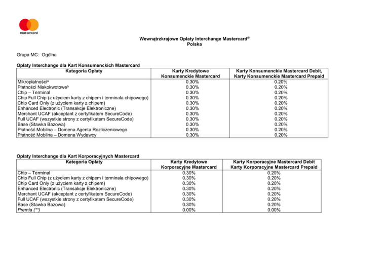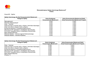 Wewnątrzkrajowe Opłaty Interchange Mastercard® Polska Grupa MC: Ogólna Opłaty Interchange dla Kart Konsumenckich Mastercard Kategoria Opłaty Mikropłatnościa Płatności Niskokwotoweb Chip – Terminal Chip Full Chip (z użyciem karty z chipem i terminala chipowego) Chip Card Only (z użyciem karty z chipem) Enhanced Electronic (Transakcje Elektroniczne) Merchant UCAF (akceptant z certyfikatem SecureCode) Full UCAF (wszystkie strony z certyfikatem SecureCode) Base (Stawka Bazowa) Płatność Mobilna – Domena Agenta Rozliczeniowego Płatność Mobilna – Domena Wydawcy Opłaty Interchange dla Kart Korporacyjnych Mastercard Kategoria Opłaty Chip – Terminal Chip Full Chip (z użyciem karty z chipem i terminala chipowego) Chip Card Only (z użyciem karty z chipem) Enhanced Electronic (Transakcje Elektroniczne) Merchant UCAF (akceptant z certyfikatem SecureCode) Full UCAF (wszystkie strony z certyfikatem SecureCode) Base (Stawka Bazowa) Premia (**) Karty Kredytowe Konsumenckie Mastercard 0.30% 0.30% 0.30% 0.30% 0.30% 0.30% 0.30% 0.30% 0.30% 0.30% 0.30% Karty Kredytowe Korporacyjne Mastercard 0.30% 0.30% 0.30% 0.30% 0.30% 0.30% 0.30% 0.00% Karty Konsumenckie Mastercard Debit, Karty Konsumenckie Mastercard Prepaid 0.20% 0.20% 0.20% 0.20% 0.20% 0.20% 0.20% 0.20% 0.20% 0.20% 0.20% Karty Korporacyjne Mastercard Debit Karty Korporacyjne Mastercard Prepaid 0.20% 0.20% 0.20% 0.20% 0.20% 0.20% 0.20% 0.00% Wewnątrzkrajowe Opłaty Interchange Mastercard Polska Grupa MCC: Płatności rachunkówe, transportf i usługi administracji państwowejg > Wymaga uprzedniego zatwierdzenia przez Mastercard i zastosowania identyfikatora nadanego przez Mastercard1 Opłaty Interchange dla Kart Konsumenckich Mastercard Kategoria Opłaty Mikropłatnościa Płatności Niskokwotoweb Chip – Terminal Chip Full Chip (z użyciem karty z chipem i terminala chipowego) Chip Card Only (z użyciem karty z chipem) Enhanced Electronic (Transakcje Elektroniczne) Merchant UCAF (akceptant z certyfikatem SecureCode) Full UCAF (wszystkie strony z certyfikatem SecureCode) Base (Stawka Bazowa) Płatność Mobilna – Domena Agenta Rozliczeniowego Płatność Mobilna – Domena Wydawcy Opłaty Interchange dla Kart Korporacyjnych Mastercard Kategoria Opłaty Chip – Terminal Chip Full Chip (z użyciem karty z chipem i terminala chipowego) Chip Card Only (z użyciem karty z chipem) Enhanced Electronic (Transakcje Elektroniczne) Merchant UCAF (akceptant z certyfikatem SecureCode) Full UCAF (wszystkie strony z certyfikatem SecureCode) Base (Stawka Bazowa) Karty Kredytowe Konsumenckie Mastercard 0.30% (maks. 0.25 PLN) 0.30% (maks. 0.25 PLN) 0.30% (maks. 0.25 PLN) 0.30% (maks. 0.25 PLN) 0.30% (maks. 0.25 PLN) 0.30% (maks. 0.25 PLN) 0.30% (maks. 0.25 PLN) 0.30% (maks. 0.25 PLN) 0.30% (maks. 0.25 PLN) 0.30% (maks. 0.25 PLN) 0.30% (maks. 0.25 PLN) Karty Konsumenckie Mastercard Debit, Karty Konsumenckie Mastercard Prepaid 0.20% (maks. 0.18 PLN) 0.20% (maks. 0.18 PLN) 0.20% (maks. 0.18 PLN) 0.20% (maks. 0.18 PLN) 0.20% (maks. 0.18 PLN) 0.20% (maks. 0.18 PLN) 0.20% (maks. 0.18 PLN) 0.20% (maks. 0.18 PLN) 0.20% (maks. 0.18 PLN) 0.20% (maks. 0.18 PLN) 0.20% (maks. 0.18 PLN) Karty Kredytowe Korporacyjne Mastercard 0.30% (maks. 0.25 PLN) 0.30% (maks. 0.25 PLN) 0.30% (maks. 0.25 PLN) 0.30% (maks. 0.25 PLN) 0.30% (maks. 0.25 PLN) 0.30% (maks. 0.25 PLN) 0.30% (maks. 0.25 PLN) 2 Mastercard World, Mastercard World Elite 0.30% (maks. 0.25 PLN) 0.30% (maks. 0.25 PLN) 0.30% (maks. 0.25 PLN) 0.30% (maks. 0.25 PLN) 0.30% (maks. 0.25 PLN) 0.30% (maks. 0.25 PLN) 0.30% (maks. 0.25 PLN) 0.30% (maks. 0.25 PLN) 0.30% (maks. 0.25 PLN) 0.30% (maks. 0.25 PLN) 0.30% (maks. 0.25 PLN) Mastercard World Debit, Mastercard World Elite Debit 0.20% (maks. 0.18 PLN) 0.20% (maks. 0.18 PLN) 0.20% (maks. 0.18 PLN) 0.20% (maks. 0.18 PLN) 0.20% (maks. 0.18 PLN) 0.20% (maks. 0.18 PLN) 0.20% (maks. 0.18 PLN) 0.20% (maks. 0.18 PLN) 0.20% (maks. 0.18 PLN) 0.20% (maks. 0.18 PLN) 0.20% (maks. 0.18 PLN) Karty Korporacyjne Mastercard Debit Karty Korporacyjne Mastercard Prepaid 0.20% (maks. 0.18 PLN) 0.20% (maks. 0.18 PLN) 0.20% (maks. 0.18 PLN) 0.20% (maks. 0.18 PLN) 0.20% (maks. 0.18 PLN) 0.20% (maks. 0.18 PLN) 0.20% (maks. 0.18 PLN) Grupa MCC: Usługi kurierskieh > Wymaga uprzedniego zatwierdzenia przez Mastercard i zastosowania identyfikatora nadanego przez Mastercard1 Opłaty Interchange dla Kart Konsumenckich Mastercard Kategoria Opłaty Mikropłatnościa Płatności Niskokwotoweb Chip – Terminal Chip Full Chip (z użyciem karty z chipem i terminala chipowego) Chip Card Only (z użyciem karty z chipem) Enhanced Electronic (Transakcje Elektroniczne) Merchant UCAF (akceptant z certyfikatem SecureCode) Full UCAF (wszystkie strony z certyfikatem SecureCode) Base (Stawka Bazowa) Płatność Mobilna – Domena Agenta Rozliczeniowego Płatność Mobilna – Domena Wydawcy Opłaty Interchange dla Kart Korporacyjnych Mastercard Kategoria Opłaty Chip – Terminal Chip Full Chip (z użyciem karty z chipem i terminala chipowego) Chip Card Only (z użyciem karty z chipem) Enhanced Electronic (Transakcje Elektroniczne) Merchant UCAF (akceptant z certyfikatem SecureCode) Full UCAF (wszystkie strony z certyfikatem SecureCode) Base (Stawka Bazowa) Karty Kredytowe Konsumenckie Mastercard 0.30% (maks. 2.00 PLN) 0.30% (maks. 2.00 PLN) 0.30% (maks. 2.00PLN) 0.30% (maks. 2.00 PLN) 0.30% (maks. 2.00 PLN) 0.30% (maks. 2.00 PLN) 0.30% (maks. 2.00 PLN) 0.30% (maks. 2.00 PLN) 0.30% (maks. 2.00 PLN) 0.30% (maks. 2.00 PLN) 0.30% (maks. 2.00 PLN) Karty Konsumenckie Mastercard Debit, Karty Konsumenckie Mastercard Prepaid 0.20% (maks. 2.00 PLN) 0.20% (maks. 2.00 PLN) 0.20% (maks. 2.00 PLN) 0.20% (maks. 2.00 PLN) 0.20% (maks. 2.00 PLN) 0.20% (maks. 2.00 PLN) 0.20% (maks. 2.00 PLN) 0.20% (maks. 2.00 PLN) 0.20% (maks. 2.00 PLN) 0.20% (maks. 2.00 PLN) 0.20% (maks. 2.00 PLN) Karty Kredytowe Korporacyjne Mastercard 0.30% (maks. 2.00 PLN) 0.30% (maks. 2.00 PLN) 0.30% (maks. 2.00 PLN) 0.30% (maks. 2.00 PLN) 0.30%