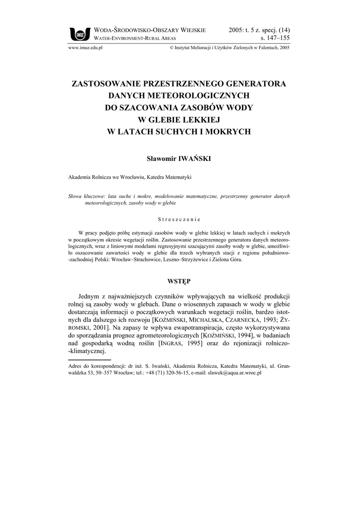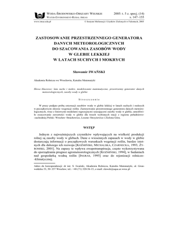 WODA-ŚRODOWISKO-OBSZARY WIEJSKIE WATER-ENVIRONMENT-RURAL AREAS www.imuz.edu.pl 2005: t. 5 z. specj. (14) s. 147–155 © Instytut Melioracji i Użytków Zielonych w Falentach, 2005 ZASTOSOWANIE PRZESTRZENNEGO GENERATORA DANYCH METEOROLOGICZNYCH DO SZACOWANIA ZASOBÓW WODY W GLEBIE LEKKIEJ W LATACH SUCHYCH I MOKRYCH Sławomir IWAŃSKI Akademia Rolnicza we Wrocławiu, Katedra Matematyki Słowa kluczowe: lata suche i mokre, modelowanie matematyczne, przestrzenny generator danych meteorologicznych, zasoby wody w glebie Streszczenie W pracy podjęto próbę estymacji zasobów wody w glebie lekkiej w latach suchych i mokrych w początkowym okresie wegetacji roślin. Zastosowanie przestrzennego generatora danych meteorologicznych, wraz z liniowymi modelami regresyjnymi szacującymi zasoby wody w glebie, umożliwiło oszacowanie zawartości wody w glebie dla trzech wybranych stacji z regionu południowo-zachodniej Polski: Wrocław–Strachowice, Leszno–Strzyżewice i Zielona Góra. WSTĘP Jednym z najważniejszych czynników wpływających na wielkość produkcji rolnej są zasoby wody w glebach. Dane o wiosennych zapasach w wody w glebie dostarczają informacji o początkowych warunkach wegetacji roślin, bardzo istotnych dla dalszego ich rozwoju [KOŹMIŃSKI, MICHALSKA, CZARNECKA, 1993; ŻYROMSKI, 2001]. Na zapasy te wpływa ewapotranspiracja, często wykorzystywana do sporządzania prognoz agrometeorologicznych [KOŹMIŃSKI, 1994], w badaniach nad gospodarką wodną roślin [INGRAS, 1995] oraz do rejonizacji rolniczo-klimatycznej. Adres do korespondencji: dr inż. S. Iwański, Akademia Rolnicza, Katedra Matematyki, ul. Grunwaldzka 53, 50–357 Wrocław; tel.: +48 (71) 320-56-15, e-mail: [email protected] 148 Woda-Środowisko-Obszary Wiejskie t. 5 z. specj. (14) Istotny wpływ na zasoby wody w glebie mają skrajne warunki klimatyczne. Bez zaplanowania racjonalnego wykorzystywania wody, jej nadmiary występujące w latach mokrych lub niedobory w latach suchych, mogą być bardzo dotkliwe w skutkach [KOŹMIŃSKI, MICHALSKA, CZARNECKA, 1993]. Badania wskazują, że w wyniku zmian klimatycznych można spodziewać się zwiększenia częstości występowania dni z większymi opadami [BOOIJ, 2002; HUNTINGFORD i in., 2003; KHARIN, ZWIERS, 2000; MAY, VOSS, ROECKNER, 2002; ZWIERS, KHARIN, 1998]. Znajomość zasobów wody w glebie w latach suchych i mokrych jest przydatna w planowaniu gospodarki wodnej na terenie zlewni, jednak szacowanie ich ilościowych zmian w latach skrajnych klimatycznie jest trudne, m.in. dlatego że sam pomiar tego czynnika agrometeorologicznego jest pracochłonny, a liczba punktów pomiarowych w zlewni z reguły stosunkowo mała. Problem ten można rozwiązać, stosując odpowiednie modele matematyczne. Przeprowadzono wiele prac nad modelami umożliwiającymi oszacowanie zasobów wody w glebie na podstawie czynników meteorologicznych [PASELA, 1971; ROZBICKI, 1997; ŻYROMSKI, 2001]. Wartości np. temperatury maksymalnej, minimalnej, opadu atmosferycznego i usłonecznienia są obserwowane w znacznie większej liczbie stacji, a dane cechujące lata suche i mokre można otrzymać, wykorzystując generator danych meteorologicznych z odpowiednio zadanym kryterium selekcji symulowanych danych. Celem pracy jest ocena możliwości wykorzystania przestrzennego generatora dobowych danych meteorologicznych w połączeniu z liniowymi modelami regresyjnymi do zawartości wody w glebie lekkiej wiosną w latach suchych i mokrych, które zdefiniowano według kryterium zaproponowanego przez KACZOROWSKĄ [1962]. METODY BADAŃ Badania przeprowadzono na terenie trzech stacji meteorologicznych: Wrocław–Strachowice, Leszno–Strzyżewice oraz Zielona Góra (tab. 1). Analizie poddano zapas wody w glebie w latach suchych i mokrych, oszacowany dla wszystkich stacji. Uwzględniono termin szacowania (11 IV i 11 V), głębokość profilu (40 Tabela 1. Charakterystyka położenia wybranych stacji meteorologicznych [ROJEK, ŻYROMSKI, 2000] Table 1. Location of selected sites [ROJEK, ŻYROMSKI, 2000] Stacja Site Wrocław–Strachowice Leszno–Strzyżewiec Zielona Góra Położenie Location 51º06´ N, 16º53´ E 51º50´ N, 16º32´ E 51º56´ N, 15º30´ E Wysokość, m n.p.m. Teren Altitude, m a.s.l. Terrain 120 równinny plain 91 równinny plain 180 zbocze niewielkiej wyżyny slope of a small upland S. Iwański: Zastosowanie przestrzennego generatora danych meteorologicznych ... 149 i 80 cm) i rodzaj powierzchni (porośnięta trawą o wysokości ok. 15 cm, nieporośnięta – czarny ugór). Symulacja danych przebiegała w dwóch etapach – w pierwszym uzyskano dane meteorologiczne cechujące lata suche i mokre, w drugim oszacowano zasoby wody w glebie na terenie wszystkich rozpatrywanych stacji. Ponieważ badania obejmowały więcej niż jedną stację, w celu zachowania zależności między stacjami wykorzystano przestrzenny generator dobowych danych meteorologicznych [IWAŃSKI, KUCHAR, 2003]. Generator jest rozszerzeniem jednopunktowego modelu RICHARDSONA [1981] i składa się z bloków wodnego i energetyczno-cieplnego. W bloku wodnym stan danego dnia (opad/brak opadu) definiuje się za pomocą dwustanowych łańcuchów Markowa pierwszego rzędu. Dla każdej stacji k = 1, 2, 3 i każdego miesiąca m = 1, 2, …, 12 estymuje się prawdopodobieństwa. Wielkość opadu generuje się na podstawie wielowymiarowego rozkładu gamma (Γm(α1, β1), …, Γm(αk, βk)). W bloku energetyczno-cieplnym usłonecznienie generuje się w analogiczny sposób, jak opad (dzień z usłonecznieniem/bez usłonecznienia), a jego wartość określa na podstawie wielowymiarowego rozkładu Weibulla (Wm(α1, β1), …, Wm(αk, βk)). Wartości temperatury maksymalnej i minimalnej oraz promieniowania słonecznego definiuje się za pomocą szeregu czasowego AR(1) [SHUMWAY, 1988]: X t = Φ m X t −1 + ε t gdzie: Xt − wektor kolumnowy z poszczególnymi zmiennymi po standaryzacji; εt − wektor kolumnowy reszt o wartości o