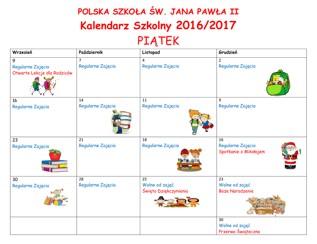 POLSKA SZKOŁA ŚW. JANA PAWŁA II Kalendarz Szkolny 2016/2017 PIĄTEK Wrzesień Październik Listopad Grudzień 9 Regularne Zajęcia Otwarte Lekcje dla Rodziców 7 Regularne Zajęcia 4 Regularne Zajęcia 2 Regularne Zajęcia 16 Regularne Zajęcia 14 Regularne Zajęcia 11 Regularne Zajęcia 9 Regularne Zajęcia 23 Regularne Zajęcia 21 Regularne Zajęcia 18 Regularne Zajęcia 16 Regularne Zajęcia Spotkanie z Mikołajem 30 Regularne Zajęcia 28 Regularne Zajęcia 25 Wolne od zajęć Święto Dziękczynienia 23 Wolne od zajęć Boże Narodzenie 30 Wolne od zajęć Przerwa Świąteczna Styczeń Luty Marzec Kwiecień Maj 6 Regularne Zajęcia 3 Regularne Zajęcia 2 Piątkowe zajęcia przesunięte są na CZWARTEK Regularne Zajęcia HOT DOG DAY 6 Piątkowe zajęcia przesunięte są na CZWARTEK Szkolna Święconka 5 Regularne Zajęcia 13 Regularne Zajęcia 10 Regularne Zajęcia Wywiadówki w klasach 9 Piątkowe zajęcia przesunięte są na CZWARTEK Regularne Zajęcia 14 Wolne od zajęć Wielki Piątek 12 Zakończenie Roku Szkolnego Msza Święta 20 Regularne Zajęcia 17 Regularne Zajęcia Pasowanie Pierwszej Klasy 17 Regularne Zajęcia Zapisy na Nowy Rok Szkolny 2017-2018 21 Regularne Zajęcia Zapisy na Nowy Rok Szkolny 2017-2018 26 Piątkowe zajęcia przesunięte są na CZWARTEK Regularne Zajęcia 24 Regularne Zajęcia 24 Regularne Zajęcia Zdjęcia w Togach 28 Regularne Zajęcia 31 Regularne Zajęcia Walne Zebranie