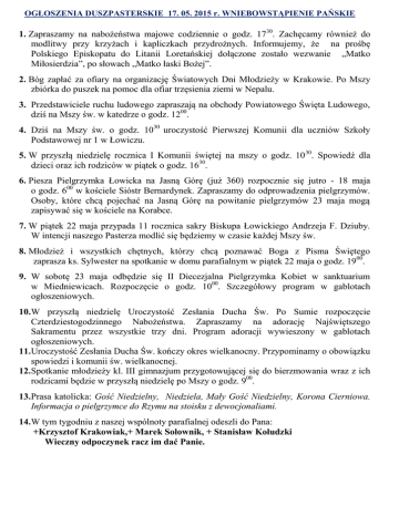 OGŁOSZENIA DUSZPASTERSKIE 17. 05. 2015 r. WNIEBOWSTĄPIENIE PAŃSKIE 1. Zapraszamy na nabożeństwa majowe codziennie o godz. 1730. Zachęcamy również do modlitwy przy krzyżach i kapliczkach przydrożnych. Informujemy, że na prośbę Polskiego Episkopatu do Litanii Loretańskiej dołączone zostało wezwanie „Matko Miłosierdzia”, po słowach „Matko łaski Bożej”. 2. Bóg zapłać za ofiary na organizację Światowych Dni Młodzieży w Krakowie. Po Mszy zbiórka do puszek na pomoc dla ofiar trzęsienia ziemi w Nepalu. 3. Przedstawiciele ruchu ludowego zapraszają na obchody Powiatowego Święta Ludowego, dziś na Mszy św. w katedrze o godz. 1200. 4. Dziś na Mszy św. o godz. 1030 uroczystość Pierwszej Komunii dla uczniów Szkoły Podstawowej nr 1 w Łowiczu. 5. W przyszłą niedzielę rocznica I Komunii świętej na mszy o godz. 10 30. Spowiedź dla dzieci oraz ich rodziców w piątek o godz. 1630. 6. Piesza Pielgrzymka Łowicka na Jasną Górę (już 360) rozpocznie się jutro - 18 maja o godz. 600 w kościele Sióstr Bernardynek. Zapraszamy do odprowadzenia pielgrzymów. Osoby, które chcą pojechać na Jasną Górę na powitanie pielgrzymów 23 maja mogą zapisywać się w kościele na Korabce. 7. W piątek 22 maja przypada 11 rocznica sakry Biskupa Łowickiego Andrzeja F. Dziuby. W intencji naszego Pasterza modlić się będziemy w czasie każdej Mszy św. 8. Młodzież i wszystkich chętnych, którzy chcą poznawać Boga z Pisma Świętego zaprasza ks. Sylwester na spotkanie w domu parafialnym w piątek 22 maja o godz. 1900. 9. W sobotę 23 maja odbędzie się II Diecezjalna Pielgrzymka Kobiet w sanktuarium w Miedniewicach. Rozpoczęcie o godz. 1000. Szczegółowy program w gablotach ogłoszeniowych. 10.W przyszłą niedzielę Uroczystość Zesłania Ducha Św. Po Sumie rozpoczęcie Czterdziestogodzinnego Nabożeństwa. Zapraszamy na adorację Najświętszego Sakramentu przez wszystkie trzy dni. Program adoracji wywieszony w gablotach ogłoszeniowych. 11.Uroczystość Zesłania Ducha Św. kończy okres wielkanocny. Przypominamy o obowiązku spowiedzi i komunii św. wielkanocnej. 12.Spotkanie młodzieży kl. III gimnazjum przygotowującej się do bierzmowania wraz z ich rodzicami będzie w przyszłą niedzielę po Mszy o godz. 900. 13.Prasa katolicka: Gość Niedzielny, Niedziela, Mały Gość Niedzielny, Korona Cierniowa. Informacja o pielgrzymce do Rzymu na stoisku z dewocjonaliami. 14.W tym tygodniu z naszej wspólnoty parafialnej odeszli do Pana: +Krzysztof Krakowiak,+ Marek Sołownik, + Stanisław Kołudzki Wieczny odpoczynek racz im dać Panie.