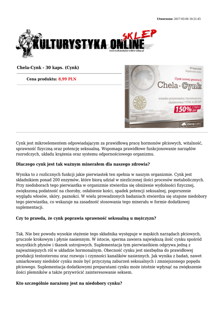 Utworzono: 2017-03-04 10:21:45 Chela-Cynk - 30 kaps. (Cynk) Cena produktu: 8,99 PLN Cynk jest mikroelementem odpowiadającym za prawidłową pracę hormonów płciowych, witalność, sprawność fizyczną oraz potencję seksualną. Wspomaga prawidłowe funkcjonowanie narządów rozrodczych, układu krążenia oraz systemu odpornościowego organizmu. Dlaczego cynk jest tak ważnym minerałem dla naszego zdrowia? Wynika to z rozlicznych funkcji jakie pierwiastek ten spełnia w naszym organizmie. Cynk jest składnikiem ponad 200 enzymów, które biorą udział w niezliczonej ilości procesów metabolicznych. Przy niedoborach tego pierwiastka w organizmie stwierdza się obniżenie wydolności fizycznej, zwiększoną podatność na choroby, osłabienie kości, spadek potencji seksualnej, pogorszenie wyglądu włosów, skóry, paznokci. W wielu prowadzonych badaniach stwierdza się utajone niedobory tego pierwiastka, co wskazuje na zasadność stosowania tego minerału w formie dodatkowej suplementacji. Czy to prawda, że cynk poprawia sprawność seksualną u mężczyzn? Tak. Nie bez powodu wysokie stężenie tego składnika występuje w męskich narządach płciowych, gruczole krokowym i płynie nasiennym. W istocie, sperma zawiera największą ilość cynku spośród wszystkich płynów i tkanek ustrojowych. Suplementacja tym pierwiastkiem odgrywa jedną z najważniejszych ról w układzie hormonalnym. Obecność cynku jest niezbędna do prawidłowej produkcji testosteronu oraz rozwoju i czynności kanalików nasiennych. Jak wynika z badań, nawet umiarkowany niedobór cynku może być przyczyną zaburzeń seksualnych i zmniejszonego popędu płciowego. Suplementacja dodatkowymi preparatami cynku może istotnie wpłynąć na zwiększenie ilości plemników a także przywrócić zainteresowanie seksem. Kto szczególnie narażony jest na niedobory cynku? Na niedobory tego cennego pierwiastka narażeni są w szczególności ludzie w wieku podeszłym, chorzy, rekonwalescenci, dzieci oraz młodzież w okresie pokwitania. Zmniejszone stężenie tego pierwiastka stwierdza się u osób z chorobami nerek, wątroby, nadużywających alkohol oraz żyjących w nadmiernym stresie. Jednym z charakterystycznych objawów niedoboru cynku w diecie mogą być: utrata apetytu, zakażenia grzybiczne, wirusowe, bakteryjne oraz spadek ogólnej odporności. Dlaczego OLIMP CHELA-CYNK® ? OLIMP CHELA-CYNK® to preparat mineralny nagrodzony Złotym Medalem ALBION®. To gwarancja wyjątkowej skuteczności działania. Tylko produkty oznaczone tym znakiem charakteryzują się najwyższą biodostępnością przez organizm, przewyższając pod tym względem większość preparatów obecnych na rynku. Wszystkie te parametry potwierdzają badania naukowe, których wyniki przedstawiamy: PORÓWNANIE PRZYSWAJALNOŚCI CHELATU CYNKU do INNYCH FORM CYNKU Poziom stężenia cynku w surowicy erytrocytów w zależności od dostarczonej formy cynku. Analizowano poziom tolerancji różnych form cynku – stężenia cynku w surowicy erytrocytów oraz stężenia cynku w osoczu. Każdemu uczestnikowi podawano 50 mg cynku w postaci każdej z czterech form cynku. Tydzień I Każdy dostawał 50 mg cynku w postaci pikolinianu cynku. Tydzień II Każdy otrzymywał 50 mg cynku w postaci glukonianu cynku Tydzień III Każdy otrzymywał 50 mg cynku w postaci chelatu glicynowego cynku Tydzień IV Każdy otrzymywał 50 mg cynku w postaci tlenku cynku W wykresie 1 zmiana stężeniu cynku w surowicy erytrocytów odzwierciedla kombinację absorbcji jelitowej cynku jak i pobrania go do komórek ustrojowych. Wykres 2 obrazuje sumę wzrostu stężenia cynku w osoczu, będącego praktycznie w całości odzwierciedleniem absorbcji jelitowej Z powyższych danych wyraźnie wynika, że chelat glicynowy cynku (Albion® Zinc Chelazome®) ma zdecydowaną przewagę nad pozostałymi formami cynku. Porównując stosunek absorbcji jelitowej absorbcja chelatu glicynowego cynku jest: 3,2 razy większą niż pikolinianu cynku 1,67 razy większą niż glukonianu cynku 3,22 razy większą niż tlenku cynku. Źródło: 1) New zinc comparsion study Albion Advanced Nutrition Dr Robert DiSilvestro, et al (badania przeprowadzone w Ohio State University) PAMIĘTAJ ! Wybierając preparat mineralny, zawsze na opakowaniu szukaj znaczka ALBION ® MINERALS Albion Laboratories® jako jedyna firma na świecie, opracowała najbardziej precyzyjny i skuteczny proces przekształcania minerałów w postać wysokoprzyswajalną przez organizm. Dzięki unikalnej technologii chelatowania minerałów (specjalnemu połączeniu z aminokwasami), minerały Albiona® są kilkakrotnie lepiej wchłaniane od tradycyjnych preparatów! Są ponadto odporne na działanie składników antyodżywczych, nie osłabiają działania witamin oraz stwarzają mniejsze ryzyko przedawkowania. Nowatorskie i opatentowane przez Albion osiągnięcie w zakresie produkcji minerałów znajdziesz w produkcie OLIMP CHELA-CYNK Nie kupuj tanich i niesprawdzonych środków. Twoje zdrowie i samopoczucie nie są tego warte! Skład: chelat aminokwasowy cynku, stearynian magnezu – substancja przeciwzbrylająca, celuloza mikrokrystaliczna – substancja wypełniająca, żelatyna – otoczka kapsułki 1 kapsułka / 150 mg chelatu aminokwasowego cynku ALBION® Zinc Chelazome®, w tym 30 mg cynku Sposób użycia: Aby zapewnić właściwą ochronę organizmu przed niedoborami cynku, suplement najlepiej przyjmować w ilości 1 kapsułki na dobę, po wybranym posiłku. Ilość Adres: http://www.ko.sklep.pl/ - Telefon: kom. 782 010 880 Email: [email protected]
