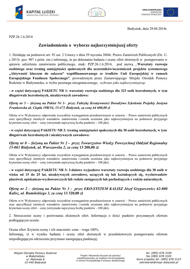 Białystok, dnia 29.04.2014r. PZP.26.1.6.2014 Zawiadomienie o wyborze najkorzystniejszej oferty 1. Działając na podstawie art. 92 ust. 2 Ustawy z dnia 29 stycznia 2004r. Prawo Zamówień Publicznych (Dz. U. z 2013r. poz. 907 z późn. zm.) informuję, że po dokonaniu badania i oceny ofert złożonych w postępowaniu w sprawie udzielenia zamówienia publicznego, znak: PZP.26.1.6.2014, pod nazwą „Warsztaty rozwoju osobistego oraz trening umiejętności społecznych dla uczestników/uczestniczek projektu systemowego „Aktywność kluczem do sukcesu” współfinansowanego ze środków Unii Europejskiej w ramach Europejskiego Funduszu Społecznego”, prowadzonym przez Zamawiającego: Miejski Ośrodek Pomocy Rodzinie w Białymstoku, w trybie przetargu nieograniczonego, wybrano jako najkorzystniejszą: - w części dotyczącej PAKIETU NR 1: warsztaty rozwoju osobistego dla 323 osób bezrobotnych, w tym długotrwale bezrobotnych, nieaktywnych zawodowo: Ofertę nr 5 – złożoną na Pakiet Nr 1- przez Fabrykę Kreatywności Doradztwo Szkolenia Projekty Justyna Frankowska ul. Ciepła 19B/54, 15-472 Białystok, za cenę 64 600,00 zł. Oferta w/w Wykonawcy odpowiada wszystkim wymaganiom przedstawionym w ustawie – Prawo zamówień publicznych oraz specyfikacji istotnych warunków zamówienia i została oceniona jako najkorzystniejsza na podstawie przyjętego kryterium oceny ofert – ceny (otrzymała najwyższą liczbę punktów - 100 pkt). - w części dotyczącej PAKIETU NR 2: trening umiejętności społecznych dla 30 osób bezrobotnych, w tym długotrwale bezrobotnych i nieaktywnych zawodowo: Ofertę nr 8 – złożoną na Pakiet Nr 2 - przez Towarzystwo Wiedzy Powszechnej Oddział Regionalny 15-063 Białystok, ul. Warszawska 2, za cenę 13 200,00 zł. Oferta w/w Wykonawcy odpowiada wszystkim wymaganiom przedstawionym w ustawie – Prawo zamówień publicznych oraz specyfikacji istotnych warunków zamówienia i została oceniona jako najkorzystniejsza na podstawie przyjętego kryterium oceny ofert – ceny (otrzymała najwyższą liczbę punktów - 100 pkt). - w części dotyczącej PAKIETU NR 3: 3-dniowe wyjazdowe warsztaty rozwoju osobistego dla 30 osób w wieku od 15 do 25 lat, nieaktywnych zawodowo, uczących się lub kształcących się, wychowanków placówek opiekuńczo-wychowawczych lub rodzin zastępczych lub pochodzących z rodzin naturalnych. Ofertę nr 2 – złożoną na Pakiet Nr 3 - przez EKO-SYSTEM KALISZ Józef Grygorcewicz 62-800 Kalisz, ul. Rumińskiego 3, za cenę 13 320,00 zł. Oferta w/w Wykonawcy odpowiada wszystkim wymaganiom przedstawionym w ustawie – Prawo zamówień publicznych oraz specyfikacji istotnych warunków zamówienia i została oceniona jako najkorzystniejsza na podstawie przyjętego kryterium oceny ofert – ceny (otrzymała najwyższą liczbę punktów - 100 pkt). 2. Streszczenie oceny i porównania złożonych ofert. Informacja o ilości punktów przyznanych ofertom podlegającym ocenie. Ocena ofert: Kryteria oceny i ich znaczenie: cena – waga 100%. Informuję, iż w wyniku badania i oceny ofert złożonych w przedmiotowym postępowaniu ofertom niepodlegającym odrzuceniu przyznano następującą punktację: PAKIET NR 1: Firma (nazwa) lub nazwisko oraz adres Wykonawcy konsorcjum: Galicyjskie Centrum Edukacji Sp. z o.o. 30-091 Kraków, ul. Bronowicka 73 oraz Ośrodek Szkolenia Kursowego i Ustawicznego 30-091 Kraków, ul. Bronowicka 73 Fabryka Kreatywności Doradztwo Szkolenia Projekty Justyna Frankowska ul. Ciepła 19B/54, 15-472 Białystok Zakład Doskonalenia Zawodowego 15-365 Białystok, ul. Pogodna 63/1 PAKIET NR 2: Firma (nazwa) lub nazwisko oraz adres Wykonawcy konsorcjum: Galicyjskie Centrum Edukacji Sp. z o.o. 30-091 Kraków, ul. Bronowicka 73 oraz Ośrodek Szkolenia Kursowego i Ustawicznego 30-091 Kraków, ul. Bronowicka 73 Placówka Kształcenia Ustawicznego „LOGOS” Centrum Edukacyjne 18-400 Łomża, ul. Kard. Wyszyńskiego 6 lok. 44 Fabryka Kreatywności Doradztwo Szkolenia Projekty Justyna Frankowska ul. Ciepła 19B/54, 15-472 Białystok Towarzystwo Wiedzy Powszechnej Oddział Regionalny 15-063 Białystok, ul. Warszawska 2 Zakład Doskonalenia Zawodowego 15-365 Białystok, ul. Pogodna 63/1 T-MATIC Grupa Computer Plus Sp. z o.o. 15-440 Białystok, ul. Malmeda 1 PAKIET NR 3: Firma (nazwa) lub nazwisko oraz adres Wykonawcy konsorcjum: Galicyjskie Centrum Edukacji Sp. z o.o. 30-091 Kraków, ul. Bronowicka 73 oraz Ośrodek Szkolenia Kursowego i Ustawicznego 30-091 Kraków, ul. Bronowicka 73 EKO-SYSTEM KALISZ Józef Grygorcewicz 62-800 Kalisz, ul. Rumińskiego 3 PTE Zakład Szkolenia i Doradztwa Ekonomicznego Sp. z o.o. 20-064 Lublin, ul. Północna 22a Fabryka Kreatywności Doradztwo Szkolenia Projekty Justyna Frankowska ul. Ciepła 19B/54, 15-472 Białystok Towarzystwo Wiedzy Powszechnej Oddział Regionalny 15-063 Białystok, ul. Warszawska 2 Liczba punktów w kryterium cena 90,88 pkt 100,00 pkt 71,68 pkt Liczba punktów w kryterium cena 93,42 pkt 59,46 pkt 68,22 pkt 100,00 pkt 84,62 pkt 82,09 pkt Liczba punktów w kryterium cena 64,82 pkt 100,00 pkt 37,00 pkt 55,85 pkt 85,38 pkt ZASTĘPCA DYREKTORA Miejskiego Ośrodka Pomocy Rodzinie w Białymstoku mgr Kazimierz Józef Kuczek