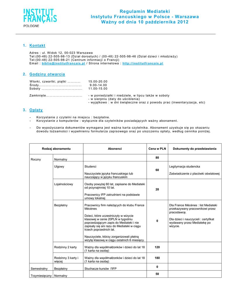 Regulamin Mediateki Instytutu Francuskiego w Polsce - Warszawa Ważny od dnia 10 października 2012 1. Kontakt Adres : ul. W idok 12, 00-023 W arsza wa Tel:(00 -48 ) 22 -50 5-9 8-13 (Dział do rosłych) / (00 -48) 22 -505-98 -46 (Dzi ał dzieci i m łodzieży ) Tel:(00 -48 ) 22 -50 5-9 8-21 (Centrum inform acji o Francji ) Em ail : biblio@institutfran cais.pl / Strona internetowa : http://institutfr ancais.pl 2. Godziny otwarcia W torki, czwartk i, piątki ………… Środy…………………………… …… Soboty ………………………………. 15.00 -20.00 9.00-14.00 11.00 -15.00 Zam knięte…………………………… - w poni edziałki i niedziele , w li pcu także w sobot y - w sierpniu (daty do uściślenia ) - wyj ątkowo : w dni ś wiątec zne oraz z powodu pr ac (inwentaryzacja , etc) 3. Opłaty - Korzystanie z czyteln i na m iejscu : bezpłatne. Korzystanie z kom puteró w : wyłąc znie dl a czytel ników posiadając ych ważny abonam ent . - Do wypo życzani a dokum entów wym agana jest ważna kart a czytelnika. Abonam ent uzyskuje się po okazani u do wo du to żsam ości i wypełn ieniu form ularza zapisowego oraz po uiszczeni u opłat y, według cennika poni żej. Rodzaj abonamentu Roczny Abonenci Dokumenty do przedstawienia 80 Normalny Ulgowy Cena w PLN Studenci Legitymacja studencka 60 Nauczyciele języka francuskiego lub nauczający w języku francuskim Lojalnościowy Osoby powyżej 60 lat, zapisane do Mediateki od przynajmniej 10 lat. Zaświadczenie z placówki oświatowej 20 Pracownicy IFP zatrudnieni na podstawie umowy lokalnej Bezpłatny Pracownicy firm należących do klubu France Mécènes Dzieci, które uczestniczyły w wizycie klasowej w cenie 20PLN w tygodniu poprzedzającym zapis do Mediateki i nie zapisały się ani razu do Mediateki w ciągu trzech poprzednich lat. Dla France Mécènes : list Mediateki przekazywany pracownikowi przez pracodawcę. 0 Nauczyciele, którzy zorganizowali płatną wizytę klasową w ciągu ostatnich 6 miesięcy. Semestralny Rodzinny 2 karty Ważny dla współmałżonków i dzieci do lat 18 (1 karta na osobę) 120 Rodzinny 3 karty i więcej Ważny dla współmałżonków i dzieci do lat 18 (1 karta na osobę) 180 Bezpłatny Słuchacze kursów l'IFP Trzymiesięczny Normalny 0 50 Dla dzieci i nauczycieli : certyfikat wydawany przez Mediatekę po wizycie. Kary za op óźn ieni e - k wota za każdy d okum ent i każdy dzień (dni ot warcia Mediatek i) DVD, pod ręczni ki do nauki francuskiego, gry , przewodnik i turystyczne…… Inne dokum enty…………………………………………………………………………. W ym iana karty czytelnika … …………………………..................... ................................. Druko wani e – Cena za stron ę………………………………………………………………………. 1 0,30 5 0,50 zł zł zł zł 4. Usługi oferowane osobom posiadającym abonament Karta czytel nika jest im ienna i nie m oże być przekazywana innym osobom . - Wypożyczanie dokumentów Po okazani u karty, czytelnik m oże wypo życzać dokum enty z sekcji dla dor osłych oraz sekcji dla dzieci i m łodzieży , za wyjątkiem dokum entó w o znaczon ych w katal ogu jako nieprzeznaczone do wypożyczani a. Karta upoważni a do jedno ra zo wego wypożyczeni a maksimum 11 dokumentów w podanych ni żej term in ach : 6 1 3 3 3 3 1 1 - książek przew odnik tur ys t yczn y podręczniki do nauki fra ncuskiego czasopisma CD DVD CD-ROM gra 30 14 14 14 14 7 14 7 dni (14 dni dla nowości ) dni dni dni dni dni dni dni Dostęp do komputerów Czytelnik m oże uzyskać dostęp do kom puterów po udziel eniu zgo dy przez pracowników Mediateki, którzy m ogą ogra niczyć czas korzystani a do 30 m inut (np. w przypadku oczeki wani a przez innych czytelników) Czytel nik m oże : - łączyć się z inte rnetem (ot wi eran ie stron ni ezgodnych z obowi ązującym prawem - nam awiani e do przem ocy, rasizm u, poch wała n ied ozwo lonych praktytk jest zabronione). - używać ed ytoró w tekstu i kalkulatorów. - korzystać z intern eto wych b az prasy i czasopism . Czytelnik zo bo wiązuje się ni e dokon ywać operacji m ogących zaszkodzić prawi dłowemu funkcjonowaniu kom putera i sieci oraz za wia dam iać o wszelkich e wentualnych nieprawidł owościach. - Dostęp do katalogu o nline Za pośre dnict wem strony intern eto we j Mediateki (http://institutfr ancais.pl/var so vie/pl/mediateka/ ), czytel nik m oże spra wd zać stan zbio ró w i przeg ląd ać nowości, sprawdzać stan s wojego konta (data wyczerpani a abonam entu , lista wypo życ zon ych dokum entó w, data zwrotu…) oraz rezerwować dokum enty. 5. Prolongaty Term in zwrotu m ożna wydłu żyć j ed yni e w przypadku wypożyc zeni a książki. Prolongaty dokon ać m ożna tylko j eśli żad en in ny c zytel nik nie za reze rwo wał dan ej książki. Trwa ona 14 dni i m ożna ją powtórzyć j ednokrotnie. Czyt elnik po win ien p oprosić o prol on gatę prze d upł ywem pierwszego term inu zwrotu : na m iejscu, telefonicznie, e -m ailem . Jedyni e zg oda p raco wnika Mediateki g wara ntuje dokonanie prol ongaty. 6. Rezerwacja Jeśli czytelnik chce zare ze rwo wać dokum ent, m oże poprosić o to pracowników Mediateki (gdy dokum ent jest dostępn y) l ub sam em u doko nać rezerwacji za pośrednict wem katalogu online (gdy dokum ent jest wyp ożyczo ny).Jeśli czytel ni k w m om encie zapisu podał swój adres m ailowy, otrzym a wiadom ość gdy dokument będ zie dostępn y. Na je go wypo życzenie czyt elnik m a tydzień. Po upływie t ego c zasu, do kum ent zostani e udostępni on y dla in nym czytelnikom . 7. Czytelnik zobowiązuje się : - Nie niszczyć dokum entó w w żad en sposób (nie robić w ni ch notatek ), Powiad am iać w m om encie wypo życ zani a dokum entów o ws zelkich dostrzeżonych problem ach, Przestrzegać term inó w zwro tu dokum entów, Szano wać pra wa a utorskie p rzypisan e do po