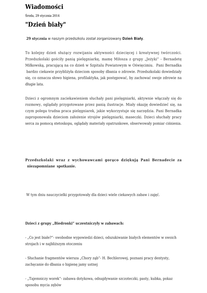 Wiadomości Środa, 29 stycznia 2014 "Dzień biały" 29 stycznia w naszym przedszkolu został zorganizowany Dzień Biały. To kolejny dzień służący rozwijaniu aktywności dziecięcej i kreatywnej twórczości. Przedszkolaki gościły panią pielęgniarkę, mamę Miłosza z grupy „Jeżyki” - Bernadetę Miłkowską, pracującą na co dzień w Szpitalu Powiatowym w Oświęcimiu. Pani Bernadka bardzo ciekawie przybliżyła dzieciom sposoby dbania o zdrowie. Przedszkolaki dowiedziały się, co oznacza słowo higiena, profilaktyka, jak postępować, by zachować swoje zdrowie na długie lata. Dzieci z ogromnym zaciekawieniem słuchały pani pielęgniarki, aktywnie włączały się do rozmowy, oglądały przygotowane przez panią ilustracje. Miały okazję dowiedzieć się, na czym polega trudna praca pielęgniarek, jakie wykorzystuje się narzędzia. Pani Bernadka zaproponowała dzieciom założenie strojów pielęgniarki, maseczki. Dzieci słuchały pracy serca za pomocą stetoskopu, oglądały materiały opatrunkowe, obserwowały pomiar ciśnienia. Przedszkolaki wraz z wychowawcami gorąco dziękują Pani Bernadecie za niezapomniane spotkanie. W tym dniu nauczycielki przygotowały dla dzieci wiele ciekawych zabaw i zajęć. Dzieci z grupy „Biedronki” uczestniczyły w zabawach: - „Co jest białe?”- swobodne wypowiedzi dzieci, odszukiwanie białych elementów w swoich strojach i w najbliższym otoczeniu - Słuchanie fragmentów wiersza „Chory ząb”- H. Bechlerowej, poznani pracy dentysty, zachęcanie do dbania o higienę jamy ustnej - „Tajemniczy worek”- zabawa dotykowa, odnajdywanie szczoteczki, pasty, kubka, pokaz sposobu mycia zębów - „Taniec z bibułką”- improwizacja ruchowa do melodii z użyciem pasków białej bibuły - „Skąd się bierze mleko?”- pokazanie dzieciom źródła pochodzenia mleka (krowa, koza), poznawanie białych produktów spożywczych: mleko, jogurt, śmietana ,ser, uświadamianie konieczności zjadania produktów bogatych w białko - „Degustacja twarożku”- wykonanie według instrukcji nauczycielki określonego kształtu z twarożku, degustacja, określanie smaku - „Zdrowy ząbek”- wspólna praca plastyczna, wypełnianie konturu ząbka białą farbą za pomocą gąbki Przedszkolaki z grupy „Jeżyki” brały udział w zabawach i zajęciach: Dzień mleka –uświadamianie dzieciom znaczenia spożywania mleka i produktów mlecznych. „Jak dbać o nasze ząbki?” -„Przetwory z mleka” - słuchanie wiersza B. Formy. Rozmowa na temat jego treści, wyjaśnienie dzieciom konieczności spożywania mleka i jego przetworów i ich wpływu na stan naszych zębów i kości- układanie puzzli- zdrowy i chory ząbek - Zabawa ,, Kosz z produktami ze „Zdrowolandii”. Dzieci nazywają znajdujące się w koszyku produkty i wspólnie z nauczycielką dzielą je na zdrowe, te które należy jeść codziennie i na te niezdrowe. Uświadomienie dz. pochodzenia produktów oraz ich wartości dla organizmuwykonanie z białego sera i innych produktów ; jeżyka, myszki, bałwanka - „Mleczny wyścig” – dziecko z każdej drużyny przenosi jak najszybciej kubek z mlekiem po wyznaczonej trasie. - Quiz ,,Żeby być zdrowym, trzeba jeść’’: - „Krowa” – praca plastyczna, kolorowanie konturów krowy czarnymi łatami,. Nazywanie poszczególnych części ciała krowy, kolorowanie ogona, rogów, kopyt. Dzieci z grupy „Kotki” brały udział w następujących zabawach i zajęciach: - „Jak powstaje mleko?”- poznanie etapów otrzymywania mleka. Uświadomienie dzieciom znaczenia spożywania produktów mlecznych dla zdrowych zębów i kości - „Myszka z sera białego”- łączenie twarogu ze śmietaną i cukrem pudrem, formowanie myszek. Dekorowanie za pomocą pianek żelków i rodzynek. Degustacja. ( przepis na „Myszkę z sera białego” zamieszczony w zakładce Informacje dla rodziców- zdrowe żywienie) - „Cztery proste kroki”- wykonanie karty pracy ukazującej podstawowe zasady higieny jamy ustnej - „Przedszkolak czysty musi być”- zabawy z piosenką