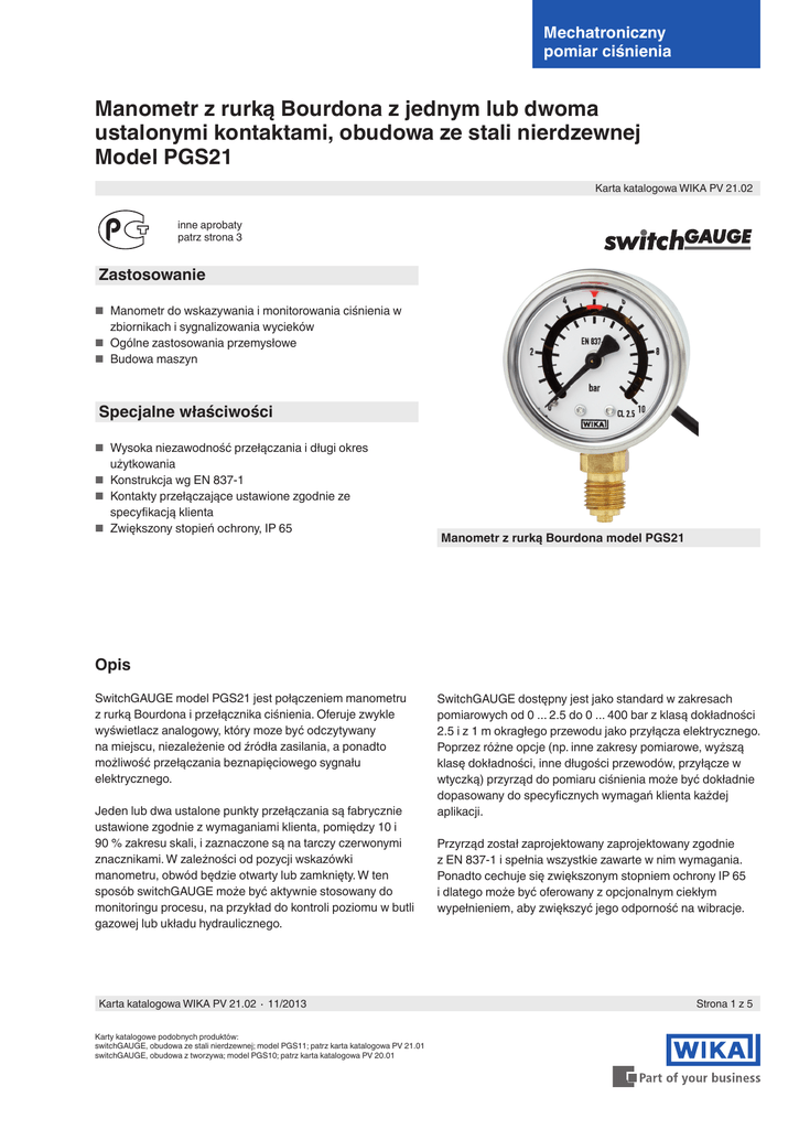 Mechatroniczny pomiar ciśnienia Manometr z rurką Bourdona z jednym lub dwoma ustalonymi kontaktami, obudowa ze stali nierdzewnej Model PGS21 Karta katalogowa WIKA PV 21.02 inne aprobaty patrz strona 3 Zastosowanie ■■ Manometr do wskazywania i monitorowania ciśnienia w zbiornikach i sygnalizowania wycieków ■■ Ogólne zastosowania przemysłowe ■■ Budowa maszyn Specjalne właściwości ■■ Wysoka niezawodność przełączania i długi okres użytkowania ■■ Konstrukcja wg EN 837-1 ■■ Kontakty przełączające ustawione zgodnie ze specyfikacją klienta ■■ Zwiększony stopień ochrony, IP 65 Manometr z rurką Bourdona model PGS21 Opis SwitchGAUGE model PGS21 jest połączeniem manometru z rurką Bourdona i przełącznika ciśnienia. Oferuje zwykle wyświetlacz analogowy, który moze być odczytywany na miejscu, niezależenie od źródła zasilania, a ponadto możliwość przełączania beznapięciowego sygnału elektrycznego. Jeden lub dwa ustalone punkty przełączania są fabrycznie ustawione zgodnie z wymaganiami klienta, pomiędzy 10 i 90 % zakresu skali, i zaznaczone są na tarczy czerwonymi znacznikami. W zależności od pozycji wskazówki manometru, obwód będzie otwarty lub zamknięty. W ten sposób switchGAUGE może być aktywnie stosowany do monitoringu procesu, na przykład do kontroli poziomu w butli gazowej lub układu hydraulicznego. Karta katalogowa WIKA PV 21.02 ∙ 11/2013 Karty katalogowe podobnych produktów: switchGAUGE, obudowa ze stali nierdzewnej; model PGS11; patrz karta katalogowa PV 21.01 switchGAUGE, obudowa z tworzywa; model PGS10; patrz karta katalogowa PV 20.01 SwitchGAUGE dostępny jest jako standard w zakresach pomiarowych od 0 ... 2.5 do 0 ... 400 bar z klasą dokładności 2.5 i z 1 m okragłego przewodu jako przyłącza elektrycznego. Poprzez różne opcje (np. inne zakresy pomiarowe, wyższą klasę dokładności, inne długości przewodów, przyłącze w wtyczką) przyrząd do pomiaru ciśnienia może być dokładnie dopasowany do specyficznych wymagań klienta każdej aplikacji. Przyrząd został zaprojektowany zaprojektowany zgodnie z EN 837-1 i spełnia wszystkie zawarte w nim wymagania. Ponadto cechuje się zwiększonym stopniem ochrony IP 65 i dlatego może być oferowany z opcjonalnym ciekłym wypełnieniem, aby zwiększyć jego odporność na wibracje. Strona 1 z 5 Tolerancja punktu przełączania Ustawienie fabryczne Z pojedynczym kontaktem: ± 2.5 % pełnej wartości skali Z podwójnym kontaktem: ± 4 % pełnej wartości skali Zakresy pomiarowe 0 ... 2.5 do 0 ... 400 bar Ograniczenie ciśnienia Sałe: 3/4 x pełna wartość skali Zmienne: 2/3 x pełna wartość skali Chwilowe: pełna wartość skali Dopuszczalna temperatura Otoczenia: -20 … +60 °C Medium: max. +60 °C Wpływ temperatury Kiedy temperatura systemu pomiarowego odchyla się od temperatury odniesienia (+20 °C): max. ±0.4 %/10 K zakresu Przyłącze procesowe Stop miedzi, dolne (LM) lub tylne centryczne(CBM) 1) NS 40: G 1/8 B (zewnętrzny), 14 mm pod klucz NS 50, 63: G 1/4 B (zewnętrzny), 14 mm pod klucz 1) NS 40 tylko przyłącze tylne Element ciśnieniowy Stop miedzi Sprężyna typu C lub typu śrubowego Mechanizm Stop miedzi Podzielnia NS 40, 50: aluminium, biała NS 63: stal nierdzewna, biała Wskazówka Tworzywo, czarne Normalnie otwarty (NO) 2 Normalnie zamknięty (NC) 12 Normalnie otwarty / normalnie zamknięty (NO-NC) 11 22 Kod Kontakt zamyka obwód ze wzrostem 1 ciśnienia lub ruchem wskazówki zgdonie z ruchem wskazówek zegara (standard) Kontatk otwiera obwód ze spadkiem 5 ciśnienia lub ruchem wskazówki przeciwnie do ruchu wskazówek zegara Kontakt otwiera obwód ze wzrostem 2 ciśnienia lub ruchem wskazówki zgodnie z ruchem wskazówek zegara (standard) Kontakt zamyka obwód ze spadkiem 4 ciśnienia lub ruchem wskazówki przeciwnie do ruchu wskazówek zegara Patrz funkcja przełączania lub ustawienie kierunku dla pojedynczego kontaktu Normalnie otwarty / normalnie otwarty (NO-NO) Patrz funkcja przełączania lub ustawienie kierunku dla pojedynczego kontaktu Normalnie zamknięty / normalnie zamknięty (NC-NC) Patrz funkcja przełaczania lub ustawienie kierunku dla pojedynczego kontaktu Ustawienie kontaktu: zgodnie z wymaganiami klienta (pomiędzy 10 i 90 % zakresu pomiarowego) Bezpotencjałowy Regulacja kontaktów 15 % FSV % V FS Szyba Poliwęglan 1 Funkcja przełączania / ustawienie kierunku 10 Obudowa Stal nierdzewna Indeks Oznacze- Symbol nie 31023461.01 Klasa dokładności 2.5 Dane dotyczące elektryki Napięcie przełączania: DC / AC 4.5 ... 24 V Prąd przełączania: 5 ... 100 mA Obciążenie kontaktu: max. 2.4 W Kontakt przełączający: normalnie zamknięty (NC) lub normalnie otwarty (NO), kontakt podwójny tylko z NS 50 FS V Rozmiar nominalny w mm 40, 50, 63 (podwójny kontakt tylko z NS 50) Test szczelności helem Szybkość ucieczki 10-5 mbar*l/s % Konstrukcja EN 837-1 IP 65 wg EN 60529 / lEC 529 patrz także opcja, przyłącze elektryczne poprzez wtyczkę 10 Wersja standardowa Stopień ochrony Strona 2 z 5 Karta katalogowa WIKA PV 21.02 ∙ 11/2013 Przyłącze elektryczne Wyjście kablowe, końcówki cynowane dla połączeń lutowanych (wg standardu IPC-WHMA-A-620A), standardowa długość 1 m Pojedynczy kontakt Podwójny kontakt czerwonu: UB+ czarny: SP 1 czerwony: UB+ (wspólny) pomarańczowy: SP 1 czarny SP 2 Zgodność CE Dyrektywa dotycząca sprzętu ciśnieniowego 97/23/EC, PS > 200 bar, moduł A, akcesoria ciśnieniowe Aprobaty ■■ GOST-R, certyfikat importu, Rosja ■■ CRN, bezpieczeństwo (np. bezpieczeństwo elektryczne, nadciśnienie, ...), Kanada Opcje ■■ Inne przyłącza procesowe Certyfikaty 1) ■■ Inne zakresy pomiarowe ■■ Certyfikat kontrolny 2.2 wg EN 10204 (np. produkcja ■■ Wypełnienie cieczą (olej silikonowy) ■■ Regulowany kontakt (model PGS11, karta katalogowa ■■ ■■ ■■ ■■ PV 21.01) Przyłącze elektryczne poprzez wtyczkę (NS 50, 63) Klasa dokładności 1.6 % In