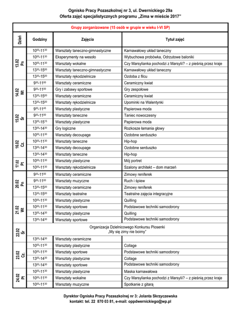 Ognisko Pracy Pozaszkolnej nr 3, ul. Dwernickiego 29a Oferta zajęć specjalistycznych programu „Zima w mieście 2017” 24.02 Pt 23.02 Cz. 22.02 Śr 21.02 Wt 20.02 Pn 17.02 Pt 16.02 Cz. 15.02 Śr 14.02 Wt 13.02 Pn Dzień Grupy zorganizowane (15 osób w grupie w wieku I-VI SP) Godziny Zajęcia Tytuł zajęć 1000-1130 Warsztaty taneczno-gimnastyczne Karnawałowy układ taneczny 1000-1130 Eksperymenty na wesoło Wybuchowa probówka, Odrzutowe baloniki 1000-1130 Warsztaty wokalne Czy Marsylianka pochodzi z Marsylii? – z pieśnią przez kraje 1330-1500 Warsztaty taneczno-gimnastyczne Karnawałowy układ taneczny 1330-1500 Warsztaty rękodzielnicze Ozdoba z filcu 930-1100 Warsztaty ceramiczne Ceramiczny kwiat 930-1100 Gry i zabawy sportowe Gry zespołowe 1330-1500 Warsztaty ceramiczne Ceramiczny kwiat 1330-1500 Warsztaty rękodzielnicze Upominki na Walentynki 930-1145 Warsztaty plastyczne Papierowa moda 930-1100 Warsztaty taneczne Taniec nowoczesny 1300-1515 Warsztaty plastyczne Papierowa moda 1300-1430 Gry logiczne Rozkosze łamania głowy 1000-1130 Warsztaty decoupage Ozdobne serduszko 1000-1130 Warsztaty taneczne Hip-hop 1300-1430 Warsztaty decoupage Ozdobne serduszko 1300-1430 Warsztaty taneczne Hip-hop 1000-1130 Warsztaty plastyczne Mój portret 1000-1130 Warsztaty rękodzielnicze Szalony architekt – dom marzeń 930-1100 Warsztaty ceramiczne Zimowy reniferek 930-1100 Warsztaty muzyczne Ruch i śpiew 1330-1500 Warsztaty ceramiczne Zimowy reniferek 1330-1500 Warsztaty teatralne Teatralne zajęcia integracyjne 1000-1130 Warsztaty plastyczne Quilling 1000-1130 Warsztaty sportowe Podstawowe techniki samoobrony 1300-1430 Warsztaty plastyczne 1300-1430 Warsztaty sportowe Quilling Podstawowe techniki samoobrony Organizacja Dzielnicowego Konkursu Piosenki „My się zimy nie boimy” 1300-1430 Warsztaty ceramiczne 1000-1130 Warsztaty plastyczne Collage 1000-1130 Warsztaty sportowe Podstawowe techniki samoobrony 1300-1430 Warsztaty plastyczne 1300-1430 Warsztaty sportowe Collage Podstawowe techniki samoobrony 1000-1130 Warsztaty plastyczne Maska karnawałowa 1000-1130 Warsztaty wokalne Czy Marsylianka pochodzi z Marsylii? – z pieśnią przez kraje 1000-1130 Warsztaty muzyczne Spotkanie z gitarą Dyrektor Ogniska Pracy Pozaszkolnej nr 3: Jolanta Skrzyczewska kontakt: tel. 22 870 03 81, e-mail: [email protected] Ognisko Pracy Pozaszkolnej nr 3, ul. Dwernickiego 29a Oferta zajęć specjalistycznych programu „Zima w mieście 2017” Tytuł zajęć 930-1200 Zajęcia informatyczne Kompozycja graficzna – Białe szaleństwo 1200-1300 Gry sportowe i świetlicowe 1200-1300 Warsztaty wokalne Czy Marsylianka pochodzi z Marsylii? – z pieśnią przez kraje 1200-1330 Warsztaty taneczne Karnawałowy układ taneczny 1130-1300 Warsztaty ceramiczne Ceramiczny kwiat 1130-1300 Warsztaty rękodzielnicze Upominki na Walentynki 1130-1300 Gry i zabawy sportowe Tenis stołowy 930-1100 Warsztaty językowe Gry językowe, karaoke 1030-1245 Gry logiczne Rozkosze łamania głowy 1130-1230 Zajęcia sportowe Trening Funkcjonalny 1000-1130 Warsztaty rękodzielnicze Ozdoba z filcu 1230-1400 Gry i zabawy sportowe 1230-1400 Warsztaty językowe 1000-1130 Zabawy sportowe i świetlicowe 1100-1230 Warsztaty taneczne Hip-hop 1200-1330 Warsztaty plastyczne Mój portret 20.02 Pn 1100-1230 Teatralne zajęcia integracyjne Z Teatrem na Ty 1130-1300 Warsztaty ceramiczne Zimowy reniferek 1200-1330 Warsztaty rękodzielnicze Torebki prezentowe, biżuteria 1300-1430 Gry i zabawy sportowe Godziny 23.02 Cz. Pt 24.02 Gry językowe, karaoke Organizacja Dzielnicowego Konkursu Piosenki „My się zimy nie boimy” 22.02 Śr 17.02 Pt 16.02 Cz. 15.02 Śr 14.02 Wt 13.02 Pn Zajęcia 21.02 Wt Dzień Uczestnicy indywidualni (15 osób w grupie SP, Gim.) 1100-1315 Gry logiczne Rozkosze łamania głowy 1300-1430 Gry i zabawy sportowe Tenis stołowy 1200-1330 Warsztaty wokalne Czy Marsylianka pochodzi z Marsylii? – z pieśnią przez kraje 1200-1330 Warsztaty muzyczne Spotkanie z gitarą Dyrektor Ogniska Pracy Pozaszkolnej nr 3: Jolanta Skrzyczewska kontakt: tel. 22 870 03 81, e-mail: [email protected]