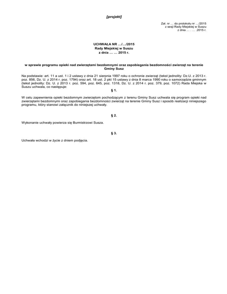 [projekt] Zał. nr … do protokołu nr …/2015 z sesji Rady Miejskiej w Suszu z dnia … . … .2015 r. UCHWAŁA NR …/…/2015 Rady Miejskiej w Suszu z dnia … … 2015 r. w sprawie programu opieki nad zwierzętami bezdomnymi oraz zapobiegania bezdomności zwierząt na terenie Gminy Susz Na podstawie: art. 11 a ust. 1 i 2 ustawy z dnia 21 sierpnia 1997 roku o ochronie zwierząt (tekst jednolity: Dz.U. z 2013 r. poz. 856, Dz. U. z 2014 r. poz. 1794) oraz art. 18 ust. 2 pkt 15 ustawy z dnia 8 marca 1990 roku o samorządzie gminnym (tekst jednolity: Dz. U. z 2013 r. poz. 594, poz. 645, poz. 1318, Dz. U. z 2014 r. poz. 379, poz. 1072) Rada Miejska w Suszu uchwala, co następuje: § 1. W celu zapewnienia opieki bezdomnym zwierzętom pochodzącym z terenu Gminy Susz uchwala się program opieki nad zwierzętami bezdomnymi oraz zapobiegania bezdomności zwierząt na terenie Gminy Susz i sposób realizacji niniejszego programu, który stanowi załącznik do niniejszej uchwały. § 2. Wykonanie uchwały powierza się Burmistrzowi Susza. § 3. Uchwała wchodzi w życie z dniem podjęcia. [projekt] Uzasadnienie Art. 11a. ust. 1 ustawy z dnia 21 sierpnia 1997r. o ochronie zwierząt (t.j. Dz.U. z 2013 r., poz. 856) nakłada na rady gmin obowiązek określenia corocznie do dnia 31 marca, w drodze uchwały, programu opieki nad zwierzętami bezdomnymi oraz zapobiegania bezdomności zwierząt. W związku z powyższym, podjęcie przez Radę Miejską w Suszu przedmiotowej uchwały w celu realizacji nałożonych ustawą na gminę obowiązków w zakresie zapewnienia opieki bezdomnym zwierzętom oraz zapobiegania tej bezdomności jest uzasadnione. Zgodnie z wymogiem art. 11a. ust. 7 ustawy o ochronie zwierząt projekt programu został przesłany do zaopiniowania właściwemu powiatowemu lekarzowi weterynarii oraz dzierżawcom i zarządcom obwodów łowieckich, działających na obszarze gminy. [projekt] Załącznik do uchwały Nr …/…/2015 z sesji Rady Miejskiej w Suszu z dnia … . … .2015 r. „Program opieki nad zwierzętami bezdomnymi oraz zapobiegania bezdomności zwierząt na terenie Gminy Susz w 2015 roku” Rozdział 1 Postanowienia ogólne §1 Niniejsza uchwała ma zastosowanie do wszystkich zwierząt bezdomnych w rozumieniu ustawy z dnia 21 sierpnia 1997r. o ochronie zwierząt (j.t. Dz.U. z 2013 r., poz. 856) przebywającymi na terenie Gminy Susz. §2 Ilekroć w uchwale jest mowa o: 1) Programie – należy przez to rozumieć „Program opieki nad zwierzętami bezdomnymi oraz zapobiegania bezdomności zwierząt na terenie Gminy Susz w 2015 roku”, 2) Gminie – należy przez to rozumieć gminę Susz, 3) Urzędzie – należy przez to rozumieć Urząd Miejski w Suszu, 4) Burmistrzu – należy przez to rozumieć Burmistrza Susza, 5) Ustawie – należy przez to rozumieć ustawę z dnia 21 sierpnia 1997 r. o ochronie zwierząt (j.t. Dz.U. z 2013 r., poz. 856), Rozdział 2 Cel i zadania programu §3 Celem Programu jest opieka nad bezdomnymi zwierzętami oraz zapobiegania bezdomności zwierząt na terenie Gminy Susz w 2015 roku. §4 Zadania priorytetowe programu: 1. Zapewnienie bezdomnym zwierzętom miejsca w schronisku. 2. Opieka nad wolno żyjącymi kotami. 3. Odławianie bezdomnych zwierząt. 4. Obligatoryjna sterylizacja albo kastracja zwierząt w schronisku. 5. Poszukiwanie właścicieli dla bezdomnych zwierząt. 6. Usypianie ślepych miotów. 7. Wskazanie gospodarstwa rolnego w celu zapewnienia miejsca dla zwierząt gospodarskich. 8. Zapewnienie całodobowej opieki weterynaryjnej w przypadku zdarzeń drogowych z udziałem zwierząt. 9. Edukacja mieszkańców w zakresie opieki nad zwierzętami. §5 1. Funkcje koordynatora działań podejmowanych w ramach niniejszego Programu pełni Burmistrz Susza 2. Wykonawcami Programu są: 1) Gmina. 2) Lekarze weterynarii, z którymi gmina podpisze stosowną umowę. 3) Schroniska dla zwierząt na podstawie umowy podpisanej z Gminą tj.: a) Schronisko dla Bezdomnych Zwierząt w Węgrowie k/Grudziądza, Węgrowo 4, 86-302 Grudziądz; b) Schronisko dla Bezdomnych Zwierząt w Zbożnem k/Morąga, Zbożne 3, 14-300 Morąg; c) Schronisko dla Zwierząt w Iławie, ul. Komunalna 2a, 14-200 Iława. Rozdział 3 Odławianie bezdomnych zwierząt i zapewnienie im miejsca w schronisku dla zwierząt §6 Na terenie Gminy odławianie bezdomnych zwierząt będzie miało charakter stały – w odniesieniu do pojedynczych zgłoszeń dotyczących błąkających się i pozostawionych bez opieki zwierząt, w szczególności chorych lub powodujących zagrożenie dla bezpieczeństwa. §7 1. Zgłoszenia o zwierzętach przebywających na terenach ogólnie dostępnych w obrębie Gminy, co do których istnieje przypuszczenie, że są bezdomne, przyjmować będzie Urząd Miejski w Suszu, który podejmie działania zmierzające do ustalenia właściciela bądź opiekuna zwierząt. 2. W przypadku nieustalenia właściciela bądź opiekuna zwierzęcia, o którym mowa w ust. 1, Urząd Miejski w Suszu podejmuje działania zmierzające do odłowienia zwierzęcia i umieszczenia w schronisku dla zwierząt. 3. Odłowione zwierzęta zostaną niezwłocznie przewiezione i umieszczone w schronisku dla zwierząt. 4. Odławianiem bezdomnych zwierząt z terenu Gminy Susz zajmują się Schronisko dla Bezdomnych Zwierząt w Węgrowie k/Grudziądza i Schronisko dla Bezdomnych Zwierząt w Zbożnem k/Morąga. Rozdział 4 Opieka nad wolno żyjącymi kotami, w tym ich dokarmianie. §8 1. Koty wolno żyjące są odławiane na zasadach określonych w Rozdziale 3 niniejszego Programu. 2. Sprawowanie opieki nad kotami wolno żyjącymi realizowane jest poprzez: 1) Ustalenie miejsc, w których przebywają koty wolno żyjące. 2) Zapewnienie dokarmiania oraz zapewnienie im wody pitnej w miejscach przebywania. 3) W celu kontroli populacji kotów wolno żyjących Gmina finansuje zabiegi sterylizacji i kastracji zwierząt. 4) Wykonanie zabiegów, o których mowa w pkt 3, może nastąpić wyłącznie przez lekarza we