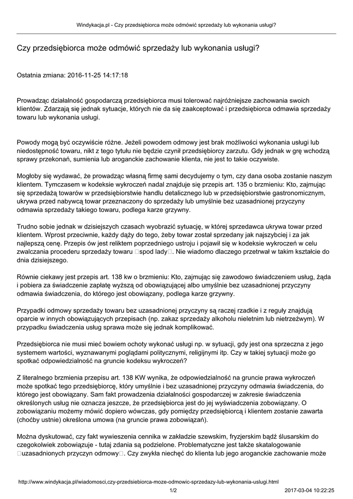 Windykacja.pl - Czy przedsiębiorca może odmówić sprzedaży lub wykonania usługi? Czy przedsiębiorca może odmówić sprzedaży lub wykonania usługi? Ostatnia zmiana: 2016-11-25 14:17:18 Prowadząc działalność gospodarczą przedsiębiorca musi tolerować najróżniejsze zachowania swoich klientów. Zdarzają się jednak sytuacje, których nie da się zaakceptować i przedsiębiorca odmawia sprzedaży towaru lub wykonania usługi. Powody mogą być oczywiście różne. Jeżeli powodem odmowy jest brak możliwości wykonania usługi lub niedostępność towaru, nikt z tego tytułu nie będzie czynił przedsiębiorcy zarzutu. Gdy jednak w grę wchodzą sprawy przekonań, sumienia lub aroganckie zachowanie klienta, nie jest to takie oczywiste. Mogłoby się wydawać, że prowadząc własną firmę sami decydujemy o tym, czy dana osoba zostanie naszym klientem. Tymczasem w kodeksie wykroczeń nadal znajduje się przepis art. 135 o brzmieniu: Kto, zajmując się sprzedażą towarów w przedsiębiorstwie handlu detalicznego lub w przedsiębiorstwie gastronomicznym, ukrywa przed nabywcą towar przeznaczony do sprzedaży lub umyślnie bez uzasadnionej przyczyny odmawia sprzedaży takiego towaru, podlega karze grzywny. Trudno sobie jednak w dzisiejszych czasach wyobrazić sytuację, w której sprzedawca ukrywa towar przed klientem. Wprost przeciwnie, każdy dąży do tego, żeby towar został sprzedany jak najszybciej i za jak najlepszą cenę. Przepis ów jest reliktem poprzedniego ustroju i pojawił się w kodeksie wykroczeń w celu zwalczania procederu sprzedaży towaru spod lady . Nie wiadomo dlaczego przetrwał w takim kształcie do dnia dzisiejszego. Równie ciekawy jest przepis art. 138 kw o brzmieniu: Kto, zajmując się zawodowo świadczeniem usług, żąda i pobiera za świadczenie zapłatę wyższą od obowiązującej albo umyślnie bez uzasadnionej przyczyny odmawia świadczenia, do którego jest obowiązany, podlega karze grzywny. Przypadki odmowy sprzedaży towaru bez uzasadnionej przyczyny są raczej rzadkie i z reguły znajdują oparcie w innych obowiązujących przepisach (np. zakaz sprzedaży alkoholu nieletnim lub nietrzeźwym). W przypadku świadczenia usług sprawa może się jednak komplikować. Przedsiębiorca nie musi mieć bowiem ochoty wykonać usługi np. w sytuacji, gdy jest ona sprzeczna z jego systemem wartości, wyznawanymi poglądami politycznymi, religijnymi itp. Czy w takiej sytuacji może go spotkać odpowiedzialność na gruncie kodeksu wykroczeń? Z literalnego brzmienia przepisu art. 138 KW wynika, że odpowiedzialność na gruncie prawa wykroczeń może spotkać tego przedsiębiorcę, który umyślnie i bez uzasadnionej przyczyny odmawia świadczenia, do którego jest obowiązany. Sam fakt prowadzenia działalności gospodarczej w zakresie świadczenia określonych usług nie oznacza jeszcze, że przedsiębiorca jest do jej wyświadczenia zobowiązany. O zobowiązaniu możemy mówić dopiero wówczas, gdy pomiędzy przedsiębiorcą i klientem zostanie zawarta (choćby ustnie) określona umowa (na gruncie prawa zobowiązań). Można dyskutować, czy fakt wywieszenia cennika w zakładzie szewskim, fryzjerskim bądź ślusarskim do czegokolwiek zobowiązuje - tutaj zdania są podzielone. Problematyczne jest także skatalogowanie uzasadnionych przyczyn odmowy . Czy zwykła niechęć do klienta lub jego aroganckie zachowanie może http://www.windykacja.pl/wiadomosci,czy-przedsiebiorca-moze-odmowic-sprzedazy-lub-wykonania-uslugi.html 1/2 2017-03-04 10:22:25 Windykacja.pl - Czy przedsiębiorca może odmówić sprzedaży lub wykonania usługi? stanowić uzasadnioną odmowę wyświadczenia usługi? Czy przekonania religijne, polityczne lub odmienny pogląd na sprawy obyczajowe może uzasadniać odmowę wykonania usługi, która w te przekonania godzi? W ostatnich tygodniach nagłośniony został przypadek właściciela drukarni, który odmówił wykonania materiałów dla jednej z fundacji argumentując to niechęcią do wspierania ruchów LGBT. Odmowa wykonania usługi skutkowała nałożeniem na przedsiębiorcę grzywny w trybie nakazowym. I choć przedsiębiorca wniósł odwołanie, na którego rozpoznanie trzeba jeszcze poczekać to rodzi się pytanie, czy wskazane przepisy mają jakąkolwiek rację bytu? Wydaje się, że powinny one zostać znowelizowane i znajdować zastosowanie wyłącznie w tych przypadkach, w których przedsiębiorca odmawia sprzedaży towaru lub wykonania usługi kierując się niskimi pobudkami lub wyjątkową złośliwością, narażając przy tym potencjalnego klienta na szkodę lub ryzyko utraty życia lub zdrowia (odmowa sprzedaży leku bez uzasadnionej przyczyny, odmowa przewiezienia chorego do szpitala w sytuacji zagrożenia zdrowia lub życia itp.). W pozostałych przypadkach przedsiębiorca, nawet jeżeli jego motywacją jest osobista niechęć do klienta, aroganckie zachowanie klienta lub wyznawany system wartości odmienny od tego, który wyznaje klient, powinien mieć możliwość odmowy zaspokojenia potrzeb takiego klienta. Co ciekawe, zwraca się także uwagę na to, że brak wskazania przyczyny odmowy wykonania usługi nie pociąga za sobą konsekwencji a wskazanie przyczyny nieuzasadnionej taką odpowiedzialnością może skutkować. Jeżeli więc przedsiębiorca nie chce wykonać usługi lub sprzedać towaru z przyczyny innej niż powszechnie uznawana za usprawiedliwioną, nie powinien - z obawy przed ewentualną odpowiedzialnością uzasadniać jej w jakikolwiek sposób. Autor: Przemysław Jamróz http://www.windykacja.pl/wiadomosci,czy-przedsiebiorca-moze-odmowic-sprzedazy-lub-wykonania-uslugi.html 2/2 2017-03-04 10:22:25