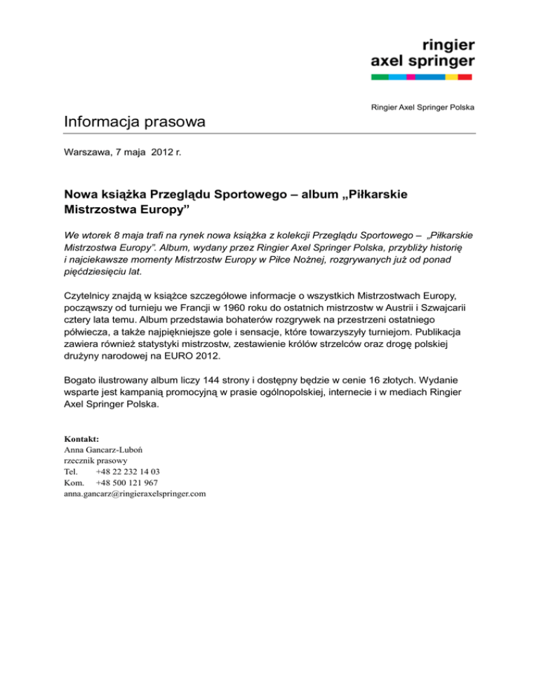 Ringier Axel Springer Polska Informacja prasowa Warszawa, 7 maja 2012 r. Nowa książka Przeglądu Sportowego – album „Piłkarskie Mistrzostwa Europy” We wtorek 8 maja trafi na rynek nowa książka z kolekcji Przeglądu Sportowego – „Piłkarskie Mistrzostwa Europy”. Album, wydany przez Ringier Axel Springer Polska, przybliży historię i najciekawsze momenty Mistrzostw Europy w Piłce Nożnej, rozgrywanych już od ponad pięćdziesięciu lat. Czytelnicy znajdą w książce szczegółowe informacje o wszystkich Mistrzostwach Europy, począwszy od turnieju we Francji w 1960 roku do ostatnich mistrzostw w Austrii i Szwajcarii cztery lata temu. Album przedstawia bohaterów rozgrywek na przestrzeni ostatniego półwiecza, a także najpiękniejsze gole i sensacje, które towarzyszyły turniejom. Publikacja zawiera również statystyki mistrzostw, zestawienie królów strzelców oraz drogę polskiej drużyny narodowej na EURO 2012. Bogato ilustrowany album liczy 144 strony i dostępny będzie w cenie 16 złotych. Wydanie wsparte jest kampanią promocyjną w prasie ogólnopolskiej, internecie i w mediach Ringier Axel Springer Polska. Kontakt: Anna Gancarz-Luboń rzecznik prasowy Tel. +48 22 232 14 03 Kom. +48 500 121 967 [email protected]