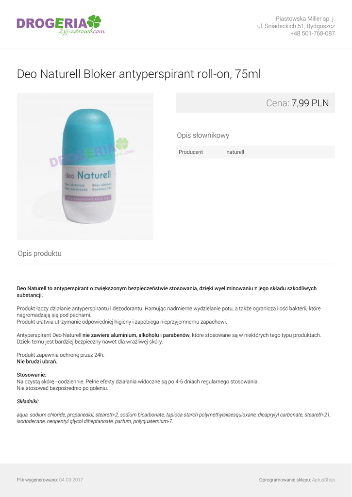 Piastowska Miller sp. j. ul. Śniadeckich 51, Bydgoszcz +48 501-768-087 Deo Naturell Bloker antyperspirant roll-on, 75ml Cena: 7,99 PLN Opis słownikowy Producent naturell Opis produktu Deo Naturell to antyperspirant o zwiększonym bezpieczeństwie stosowania, dzięki wyeliminowaniu z jego składu szkodliwych substancji. Produkt łączy działanie antyperspirantu i dezodorantu. Hamując nadmierne wydzielanie potu, a także ogranicza ilość bakterii, które nagromadzają się pod pachami. Produkt ułatwia utrzymanie odpowiedniej higieny i zapobiega nieprzyjemnemu zapachowi. Antyperspirant Deo Naturell nie zawiera aluminium, alkoholu i parabenów, które stosowane są w niektórych tego typu produktach. Dzięki temu jest bardziej bezpieczny nawet dla wrażliwej skóry. Produkt zapewnia ochronę przez 24h. Nie brudzi ubrań. Stosowanie: Na czystą skórę - codziennie. Pełne efekty działania widoczne są po 4-5 dniach regularnego stosowania. Nie stosować bezpośrednio po goleniu. Składniki: aqua, sodium chloride, propanediol, steareth-2, sodium bicarbonate, tapioca starch polymethylsilsesquioxane, dicaprylyl carbonate, steareth-21, isododecane, neopentyl glycol diheptanoate, parfum, polyquaternium-7. Plik wygenerowano: 04-03-2017 Oprogramowanie sklepu: AptusShop Piastowska Miller sp. j. ul. Śniadeckich 51, Bydgoszcz +48 501-768-087 Plik wygenerowano: 04-03-2017 Powered by TCPDF (www.tcpdf.org) Oprogramowanie sklepu: AptusShop