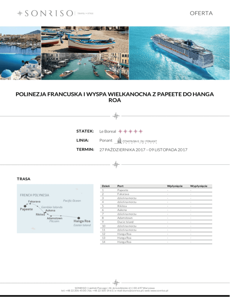 OFERTA POLINEZJA FRANCUSKA I WYSPA WIELKANOCNA Z PAPEETE DO HANGA ROA STATEK: Le Boreal LINIA: Ponant TERMIN: 27 PAŹDZIERNIKA 2017 – 09 LISTOPADA 2017 TRASA Dzień 1 2 3 4 5 6 7 8 9 10 11 12 13 14 Port Papeete Fakarava dzień na morzu dzień na morzu Rikitea Aukena dzień na morzu Adamstown Ducie Island dzień na morzu dzień na morzu Hanga Roa Hanga Roa Hanga Roa Wpłynięcie - SONRISO | Lipiński Passage | Al. Jero zo limskie 61 | 00-697 Warszawa tel. +48 22 206 45 00 | fax. +48 22 100 14 61 | e-mail: biuro @so nriso .pl | web: www.so nriso .pl Wypłynięcie - OFERTA CENA Typ kabiny Cena z osobę Kabina z oknem od 4 040 EUR Kabina z balkonem od 4 310 EUR Deluxe Suite od 6 320 EUR CENA ZAWIERA DOTATKOWE OPŁATY zakwaterowanie w 2 - os. kabinie wybranej kategorii pełne wyżywienie: 3 posiłki, przekąski między posiłakmi, bufet o północy napoje do posiłków: woda stołowa, kawa, herbata, wybrane wina oraz sok do śniadania serwis bagażowy podczas wejścia i zejścia ze statku 24 godzinny serwis kabinowy korzystanie z urządzeń sportowo - rekreacyjnych dostępnych na pokładzie (baseny, jacuzzi, boiska sportowe itp.) udział we wszystkich imprezach organizowanych na pokładzie (przedstawienia, pokazy, aukcje, animacje i inne) dojazd/przelot do portu rozpoczęcia i zakończenia rejsu transfery (lotnisko - port - lotnisko) ewentualne noclegi przed lub po rejsie wycieczki fakultatywne napoje: bezalkoholowe, alkoholowe, woda mineralna dostępne w restauracjach i barach (istnieje możliwość wykupienia pakietów napojów, o szczegóły zapytaj w biurze) korzystanie z mini baru w kabinie korzystanie z usług typu: SPA, salon piękności, pralnia itp. wydatki osobiste tj. zakupy w butikach, internet, kasyno itp. obowiązkowe opłaty portowe obowiązkowa opłata serwisowa obowiązkowe ubezpieczenie turystyczne koszt wymaganych wiz ewentualna opłata paliwowa (linia w momencie wzrotu cen ropy zastrzega sobie prawo do dodania oplaty paliwowej do każdej rezerwacji) Na życzenie świadczymy dodatkowo usługi: rezerwacje hotelowe na całym świecie rezerwacje biletów lotniczych, trasferów oraz parkingu w porcie rezerwacje wycieczek fakultatywnych i innych atrakcji SONRISO | Lipiński Passage | Al. Jero zo limskie 61 | 00-697 Warszawa tel. +48 22 206 45 00 | fax. +48 22 100 14 61 | e-mail: biuro @so nriso .pl | web: www.so nriso .pl