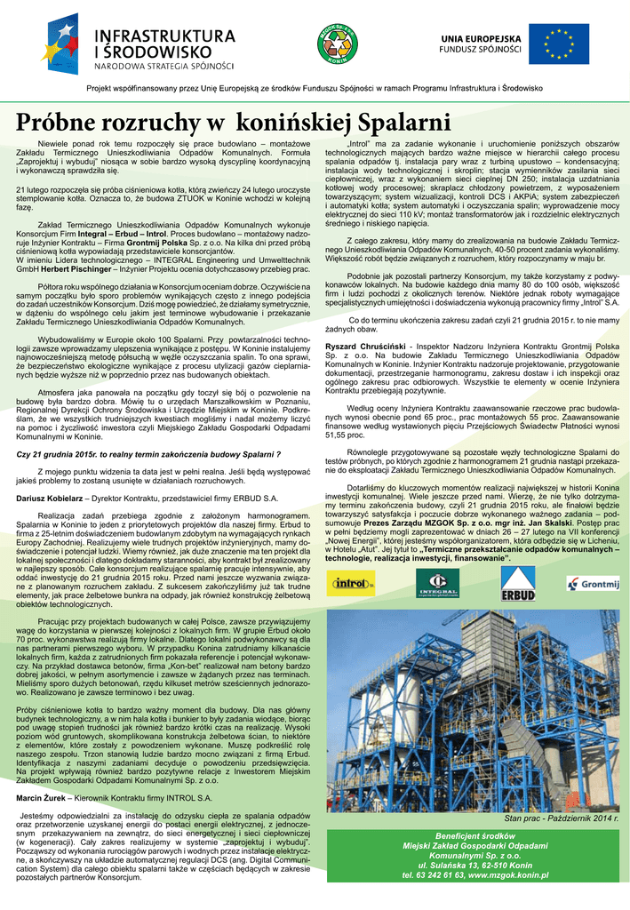 Próbne rozruchy w konińskiej Spalarni Niewiele ponad rok temu rozpoczęły się prace budowlano – montażowe Zakładu Termicznego Unieszkodliwiania Odpadów Komunalnych. Formuła „Zaprojektuj i wybuduj” niosąca w sobie bardzo wysoką dyscyplinę koordynacyjną i wykonawczą sprawdziła się. 21 lutego rozpoczęła się próba ciśnieniowa kotła, którą zwieńczy 24 lutego uroczyste stemplowanie kotła. Oznacza to, że budowa ZTUOK w Koninie wchodzi w kolejną fazę. Zakład Termicznego Unieszkodliwiania Odpadów Komunalnych wykonuje Konsorcjum Firm Integral – Erbud – Introl. Proces budowlano – montażowy nadzoruje Inżynier Kontraktu – Firma Grontmij Polska Sp. z o.o. Na kilka dni przed próbą ciśnieniową kotła wypowiadają przedstawiciele konsorcjantów. W imieniu Lidera technologicznego – INTEGRAL Engineering und Umwelttechnik GmbH Herbert Pischinger – Inżynier Projektu ocenia dotychczasowy przebieg prac. Półtora roku wspólnego działania w Konsorcjum oceniam dobrze. Oczywiście na samym początku było sporo problemów wynikających często z innego podejścia do zadań uczestników Konsorcjum. Dziś mogę powiedzieć, że działamy symetrycznie, w dążeniu do wspólnego celu jakim jest terminowe wybudowanie i przekazanie Zakładu Termicznego Unieszkodliwiania Odpadów Komunalnych. Wybudowaliśmy w Europie około 100 Spalarni. Przy powtarzalności technologii zawsze wprowadzamy ulepszenia wynikające z postępu. W Koninie instalujemy najnowocześniejszą metodę półsuchą w węźle oczyszczania spalin. To ona sprawi, że bezpieczeństwo ekologiczne wynikające z procesu utylizacji gazów cieplarnianych będzie wyższe niż w poprzednio przez nas budowanych obiektach. Atmosfera jaka panowała na początku gdy toczył się bój o pozwolenie na budowę była bardzo dobra. Mówię tu o urzędach Marszałkowskim w Poznaniu, Regionalnej Dyrekcji Ochrony Środowiska i Urzędzie Miejskim w Koninie. Podkreślam, że we wszystkich trudniejszych kwestiach mogliśmy i nadal możemy liczyć na pomoc i życzliwość inwestora czyli Miejskiego Zakładu Gospodarki Odpadami Komunalnymi w Koninie. Czy 21 grudnia 2015r. to realny termin zakończenia budowy Spalarni ? Z mojego punktu widzenia ta data jest w pełni realna. Jeśli będą występować jakieś problemy to zostaną usunięte w działaniach rozruchowych. Dariusz Kobielarz – Dyrektor Kontraktu, przedstawiciel firmy ERBUD S.A. Realizacja zadań przebiega zgodnie z założonym harmonogramem. Spalarnia w Koninie to jeden z priorytetowych projektów dla naszej firmy. Erbud to firma z 25-letnim doświadczeniem budowlanym zdobytym na wymagających rynkach Europy Zachodniej. Realizujemy wiele trudnych projektów inżynieryjnych, mamy doświadczenie i potencjał ludzki. Wiemy również, jak duże znaczenie ma ten projekt dla lokalnej społeczności i dlatego dokładamy staranności, aby kontrakt był zrealizowany w najlepszy sposób. Całe konsorcjum realizujące spalarnię pracuje intensywnie, aby oddać inwestycję do 21 grudnia 2015 roku. Przed nami jeszcze wyzwania związane z planowanym rozruchem zakładu. Z sukcesem zakończyliśmy już tak trudne elementy, jak prace żelbetowe bunkra na odpady, jak również konstrukcję żelbetową obiektów technologicznych. „Introl” ma za zadanie wykonanie i uruchomienie poniższych obszarów technologicznych mających bardzo ważne miejsce w hierarchii całego procesu spalania odpadów tj. instalacja pary wraz z turbiną upustowo – kondensacyjną; instalacja wody technologicznej i skroplin; stacja wymienników zasilania sieci ciepłowniczej, wraz z wykonaniem sieci cieplnej DN 250; instalacja uzdatniania kotłowej wody procesowej; skraplacz chłodzony powietrzem, z wyposażeniem towarzyszącym; system wizualizacji, kontroli DCS i AKPiA; system zabezpieczeń i automatyki kotła; system automatyki i oczyszczania spalin; wyprowadzenie mocy elektrycznej do sieci 110 kV; montaż transformatorów jak i rozdzielnic elektrycznych średniego i niskiego napięcia. Z całego zakresu, który mamy do zrealizowania na budowie Zakładu Termicznego Unieszkodliwiania Odpadów Komunalnych, 40-50 procent zadania wykonaliśmy. Większość robót będzie związanych z rozruchem, który rozpoczynamy w maju br. Podobnie jak pozostali partnerzy Konsorcjum, my także korzystamy z podwykonawców lokalnych. Na budowie każdego dnia mamy 80 do 100 osób, większość firm i ludzi pochodzi z okolicznych terenów. Niektóre jednak roboty wymagające specjalistycznych umiejętności i doświadczenia wykonują pracownicy firmy „Introl” S.A. Co do terminu ukończenia zakresu zadań czyli 21 grudnia 2015 r. to nie mamy żadnych obaw. Ryszard Chruściński - Inspektor Nadzoru Inżyniera Kontraktu Grontmij Polska Sp. z o.o. Na budowie Zakładu Termicznego Unieszkodliwiania Odpadów Komunalnych w Koninie. Inżynier Kontraktu nadzoruje projektowanie, przygotowanie dokumentacji, przestrzeganie harmonogramu, zakresu dostaw i ich inspekcji oraz ogólnego zakresu prac odbiorowych. Wszystkie te elementy w ocenie Inżyniera Kontraktu przebiegają pozytywnie. Według oceny Inżyniera Kontraktu zaawansowanie rzeczowe prac budowlanych wynosi obecnie pond 65 proc., prac montażowych 55 proc. Zaawansowanie finansowe według wystawionych pięciu Przejściowych Świadectw Płatności wynosi 51,55 proc. Równolegle przygotowywane są pozostałe węzły technologiczne Spalarni do testów próbnych, po których zgodnie z harmonogramem 21 grudnia nastąpi przekazanie do eksploatacji Zakładu Termicznego Unieszkodliwiania Odpadów Komunalnych. Dotarliśmy do kluczowych momentów realizacji największej w historii Konina inwestycji komunalnej. Wiele jeszcze przed nami. Wierzę, że nie tylko dotrzymamy terminu zakończenia budowy, czyli 21 grudnia 2015 roku, ale finałowi będzie towarzyszyć satysfakcja i poczucie dobrze wykonanego ważnego zadania – podsumowuje Prezes Zarządu MZGOK Sp. z o.o. mgr inż. Jan Skalsk