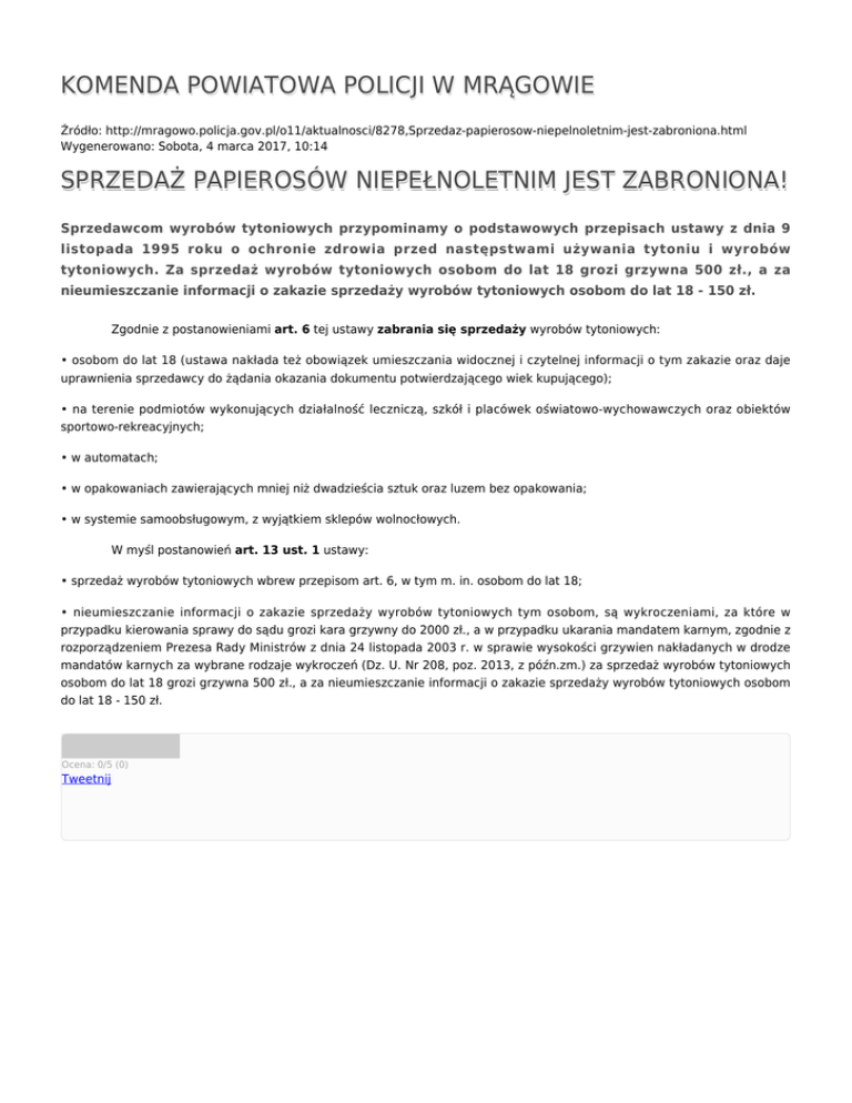 KOMENDA POWIATOWA POLICJI W MRĄGOWIE Źródło: http://mragowo.policja.gov.pl/o11/aktualnosci/8278,Sprzedaz-papierosow-niepelnoletnim-jest-zabroniona.html Wygenerowano: Sobota, 4 marca 2017, 10:14 SPRZEDAŻ PAPIEROSÓW NIEPEŁNOLETNIM JEST ZABRONIONA! Sprzedawcom wyrobów tytoniowych przypominamy o podstawowych przepisach ustawy z dnia 9 listopada 1995 roku o ochronie zdrowia przed następstwami używania tytoniu i wyrobów tytoniowych. Za sprzedaż wyrobów tytoniowych osobom do lat 18 grozi grzywna 500 zł., a za nieumieszczanie informacji o zakazie sprzedaży wyrobów tytoniowych osobom do lat 18 - 150 zł. Zgodnie z postanowieniami art. 6 tej ustawy zabrania się sprzedaży wyrobów tytoniowych: • osobom do lat 18 (ustawa nakłada też obowiązek umieszczania widocznej i czytelnej informacji o tym zakazie oraz daje uprawnienia sprzedawcy do żądania okazania dokumentu potwierdzającego wiek kupującego); • na terenie podmiotów wykonujących działalność leczniczą, szkół i placówek oświatowo-wychowawczych oraz obiektów sportowo-rekreacyjnych; • w automatach; • w opakowaniach zawierających mniej niż dwadzieścia sztuk oraz luzem bez opakowania; • w systemie samoobsługowym, z wyjątkiem sklepów wolnocłowych. W myśl postanowień art. 13 ust. 1 ustawy: • sprzedaż wyrobów tytoniowych wbrew przepisom art. 6, w tym m. in. osobom do lat 18; • nieumieszczanie informacji o zakazie sprzedaży wyrobów tytoniowych tym osobom, są wykroczeniami, za które w przypadku kierowania sprawy do sądu grozi kara grzywny do 2000 zł., a w przypadku ukarania mandatem karnym, zgodnie z rozporządzeniem Prezesa Rady Ministrów z dnia 24 listopada 2003 r. w sprawie wysokości grzywien nakładanych w drodze mandatów karnych za wybrane rodzaje wykroczeń (Dz. U. Nr 208, poz. 2013, z późn.zm.) za sprzedaż wyrobów tytoniowych osobom do lat 18 grozi grzywna 500 zł., a za nieumieszczanie informacji o zakazie sprzedaży wyrobów tytoniowych osobom do lat 18 - 150 zł. Ocena: 0/5 (0) Tweetnij