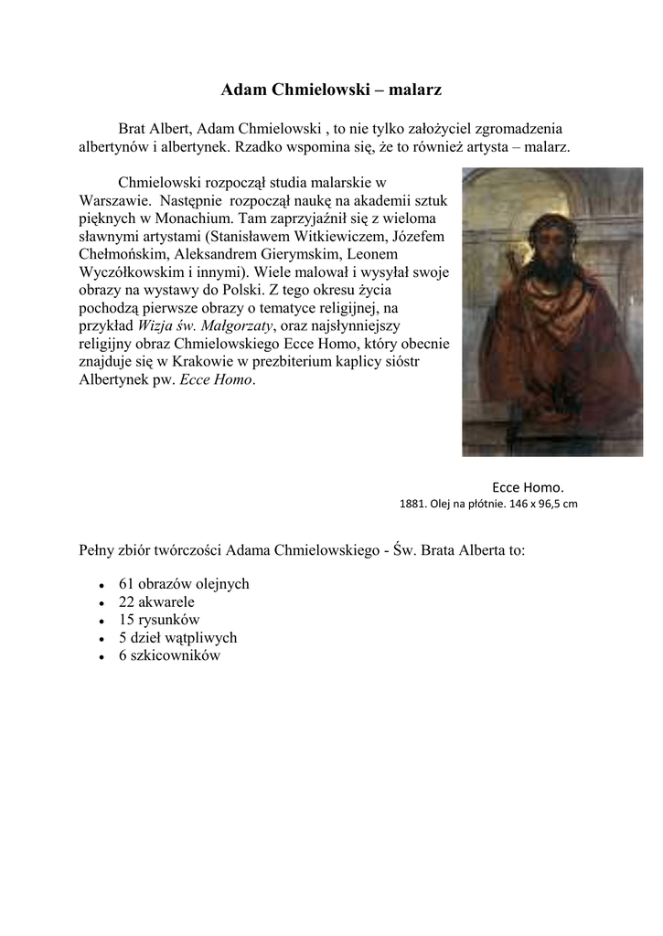 Adam Chmielowski – malarz Brat Albert, Adam Chmielowski , to nie tylko założyciel zgromadzenia albertynów i albertynek. Rzadko wspomina się, że to również artysta – malarz. Chmielowski rozpoczął studia malarskie w Warszawie. Następnie rozpoczął naukę na akademii sztuk pięknych w Monachium. Tam zaprzyjaźnił się z wieloma sławnymi artystami (Stanisławem Witkiewiczem, Józefem Chełmońskim, Aleksandrem Gierymskim, Leonem Wyczółkowskim i innymi). Wiele malował i wysyłał swoje obrazy na wystawy do Polski. Z tego okresu życia pochodzą pierwsze obrazy o tematyce religijnej, na przykład Wizja św. Małgorzaty, oraz najsłynniejszy religijny obraz Chmielowskiego Ecce Homo, który obecnie znajduje się w Krakowie w prezbiterium kaplicy sióstr Albertynek pw. Ecce Homo. Ecce Homo. 1881. Olej na płótnie. 146 x 96,5 cm Pełny zbiór twórczości Adama Chmielowskiego - Św. Brata Alberta to: 61 obrazów olejnych 22 akwarele 15 rysunków 5 dzieł wątpliwych 6 szkicowników Akwarele Jar podolski w jesieni Akw. na papierze 23x19,1; ok. 1882-1884. Zbocze parowu Akw. na papierze 23,3x16; ok. 1882-1884. Wrony nad urwiskiem Akw. na papierze 14,7x20; ok. 1882-1884. Studium do "Pogrzebu samobójcy" Akw. na papierze 14x37,4; Wyjazd na polowanie Akw. na papierze 10,3x35,6; Obrazy olejne Zawale. 1883. Olej na płótnie. 69 x 120,5 cm. Muzeum Narodowe, Kraków. Opuszczona plebania. 1888. Olej na płótnie. 71,5 x 56,8 cm. Muzeum Narodowe, Warszawa. Czarnokozińce nad Zbruczem. 1886. Olej na płótnie. 32,5 x 62 cm. Cmentarz włoski. 1880. Olej na płótnie. 79 x 143 cm. Muzeum Narodowe, Kraków. Ogród miłości. 1876. Olej na płótnie. 88 x 168 cm. Muzeum Narodowe, Warszawa. Pejzaż ze zjawą Olej na płótnie 67,5x106. Amazonka (Portret Wandy Dwernickiej z Zawala) Olej na płótnie 78,5x57; Zawale 1883.