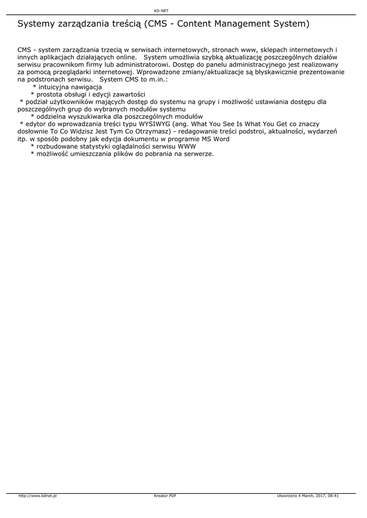 KD-NET Systemy zarządzania treścią (CMS - Content Management System) CMS - system zarządzania trzecią w serwisach internetowych, stronach www, sklepach internetowych i innych aplikacjach działających online. System umożliwia szybką aktualizację poszczególnych działów serwisu pracownikom firmy lub administratorowi. Dostęp do panelu administracyjnego jest realizowany za pomocą przeglądarki internetowej. Wprowadzone zmiany/aktualizacje są błyskawicznie prezentowanie na podstronach serwisu. System CMS to m.in.: * intuicyjna nawigacja * prostota obsługi i edycji zawartości * podział użytkowników mających dostęp do systemu na grupy i możliwość ustawiania dostępu dla poszczególnych grup do wybranych modułów systemu * oddzielna wyszukiwarka dla poszczególnych modułów * edytor do wprowadzania treści typu WYSIWYG (ang. What You See Is What You Get co znaczy dosłownie To Co Widzisz Jest Tym Co Otrzymasz) - redagowanie treści podstroi, aktualności, wydarzeń itp. w sposób podobny jak edycja dokumentu w programie MS Word * rozbudowane statystyki oglądalności serwisu WWW * możliwość umieszczania plików do pobrania na serwerze. http://www.kdnet.pl Kreator PDF Utworzono 4 March, 2017, 08:41