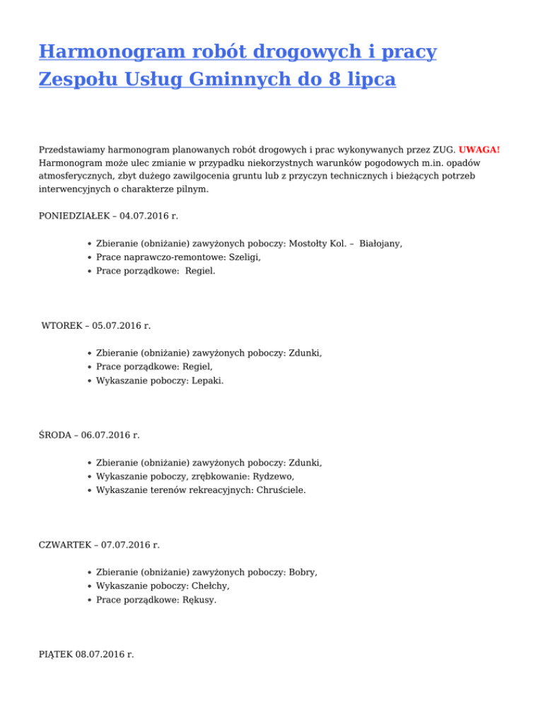 Harmonogram robót drogowych i pracy Zespołu Usług Gminnych do 8 lipca Przedstawiamy harmonogram planowanych robót drogowych i prac wykonywanych przez ZUG. UWAGA! Harmonogram może ulec zmianie w przypadku niekorzystnych warunków pogodowych m.in. opadów atmosferycznych, zbyt dużego zawilgocenia gruntu lub z przyczyn technicznych i bieżących potrzeb interwencyjnych o charakterze pilnym. PONIEDZIAŁEK – 04.07.2016 r. Zbieranie (obniżanie) zawyżonych poboczy: Mostołty Kol. – Białojany, Prace naprawczo-remontowe: Szeligi, Prace porządkowe: Regiel. WTOREK – 05.07.2016 r. Zbieranie (obniżanie) zawyżonych poboczy: Zdunki, Prace porządkowe: Regiel, Wykaszanie poboczy: Lepaki. ŚRODA – 06.07.2016 r. Zbieranie (obniżanie) zawyżonych poboczy: Zdunki, Wykaszanie poboczy, zrębkowanie: Rydzewo, Wykaszanie terenów rekreacyjnych: Chruściele. CZWARTEK – 07.07.2016 r. Zbieranie (obniżanie) zawyżonych poboczy: Bobry, Wykaszanie poboczy: Chełchy, Prace porządkowe: Rękusy. PIĄTEK 08.07.2016 r. Zbieranie (obniżanie) zawyżonych poboczy: Rostki Bajtkowskie, Wykaszanie poboczy: Lega, Prace naprawczo-porządkowe: Woszczele. Przerwa w dostawie wody w dwóch miejscowościach: Borki i Śniepie Informujemy, że w związku z pracami Zakładu Energetycznego Ełk i wyłączeniu energii elektrycznej w miejscowości Borki, gmina Prostki, w dniu 05.07.2016 r. w godzinach 8.00 – 19.00 będzie przerwa w dostawie wody w miejscowości Borki i Śniepie, gmina Ełk. Prosimy o zabezpieczenie we własnym zakresie zapasów wody. Za utrudnienia przepraszamy. Zapoznaj się z planem pracy przedszkoli i punktów przedszkolnych w lipcu i sierpniu Zgodnie z zarządzeniem nr 296/2015 Tomasza Osewskiego, Wójta Gminy Ełk, z dnia 8 grudnia 2015 roku, przedstawiamy plan pracy przedszkoli i punktów przedszkolnych w Gminie Ełk w okresie od 1 lipca 2016 roku do 31 sierpnia 2016 roku. Przedszkole w Zespole Szkół Samorządowych w Stradunach – od 1 do 25 lipca: dyżur wakacyjny; od 26 do 29 lipca i od 1 do 18 sierpnia: zamknięte; od 19 do 31 sierpnia: otwarte. Przedszkole w Zespole Szkolno-Przedszkolnym w Nowej Wsi Ełckiej – od 1 do 25 lipca: zamknięte; od 26 do 29 lipca i od 1 do 18 sierpnia: dużur wakacyjny; od 19 do 31 sierpnia: otwarte. Punkt Przedszkolny w Zespole Szkół Samorządowych w Woszczelach – od 1 do 25 lipca: zamknięte; od 26 do 29 lipca i od 1 do 18 sierpnia: otwarte; od 19 do 31 sierpnia: otwarte. Punkt Przedszkolny w Zespole Szkół Samorządowych w Chełchach – od 1 do 25 lipca: zamknięte; od 26 do 29 lipca i od 1 do 18 sierpnia: otwarte; od 19 do 31 sierpnia: otwarte. Punkt Przedszkolny w Szkole Podstawowej w Mrozach Wielkich – od 1 do 25 lipca: zamknięte; od 26 do 29 lipca i od 1 do 18 sierpnia: zamknięte; od 19 do 31 sierpnia: otwarte. Punkt Przedszkolny w Rękusach – od 1 do 25 lipca: zamknięte; od 26 do 29 lipca i od 1 do 18 sierpnia: zamknięte; od 19 do 31 sierpnia: otwarte. Kapela cymbałowa zwyciężyła w Kazimierzu Dolnym nad Wisłą! Kapela „Maleczewiacy” zajęła pierwsze miejsce w kategorii Duży-Mały na 50. Ogólnopolskim Festiwalu Kapel i Śpiewaków Ludowych w Kazimierzu Dolnym nad Wisłą. To kolejny sukces mieszkańców Gminy Ełk, którzy od lat z różnego rodzaju festiwalów folkloru wracają z nagrodami. – Ogólnopolski Festiwal Kapel i Śpiewaków Ludowych w Kazimierzu Dolnym nad Wisłą to największa impreza folkloru źródłowego w Polsce – mówi Krzysztof Łapiński, dyrektor Centrum Kultury Gminy Ełk, które od lat patronuje i opiekuje się zespołami i solistami reprezentującymi Gminę Ełk w festiwalach folkloru. – Od wielu już lat nasi reprezentanci przyjeżdżają z niego z nagrodami. W tym roku, co bardzo nas wszystkich cieszy, dziecięca kapela cymbałowa „Maleczewiacy” zwyciężyła w kategorii Duży-Mały. W jej składzie znaleźli się: Mistrz – Paweł Grupkajtys, cymbalista oraz uczniowie – Piotr Olszewski, cymbały wileńskie oraz Janek Jaroszewski, bębenek obręczowy . Gminę Ełk , oprócz kapeli „Maleczewiacy”, reprezentował Zespół Śpiewaczy „Zielona Dąbrowa” z Nowej Wsi Ełckiej oraz Jadwiga Masłowska, solistka-śpiewaczka ze Stradun. Festiwal w Kazimierzu Dolnym nad Wisłą odbył się pod patronatem Prezydenta RP Andrzeja Dudy oraz Ministerstwa Kultury i Dziedzictwa Narodowego . Radni Gminy Ełk udzielili absolutorium Tomaszowi Osewskiemu, Wójtowi Gminy Ełk Na wczorajszej Sesji Rady Gminy Ełk (29 czerwca 2016 roku), Radni Gminy Ełk jednogłośnie udzielili Tomaszowi Osewskiemu, Wójtowi Gminy Ełk, absolutorium z tytułu wykonania budżetu Gminy Ełk za 2015 rok. – To dla mnie bardzo ważne, bowiem absolutorium jest jedną z najważniejszych uchwał, jakie podejmowane są w ciągu całego roku – mówi Tomasz Osewski, Wójt Gminy Ełk. – Jednogłośna decyzja radnych to dla mnie sygnał, że akceptują i są zadowoleni z mojej całorocznej pracy. Chciałbym podziękować radnym za pozytywną ocenę i dobrą współpracę. Pani skarbnik, sekretarzowi, naczelnikom, dyrektorom i kierownikom jednostek gminnych, szkół i placówek oświatowych oraz wszystkim współpracownikom za zaangażowanie. Szczególne podziękowania chciałbym złożyć sołtysom, którzy codziennie pomagają mi w wypełnianiu obowiązków, uczestniczą w spotkaniach, zgłaszają cenne sugestie i uwagi. To dzięki naszej wspólnej pracy, Gmina Ełk ciągle się rozwija. Wszyscy pracujemy na rzecz naszej Gminy i jej mieszkańców. Rada Przedsiębiorczości zebrała się po raz czwarty Już po raz czwarty w sali konferencyjnej Urzędu Gminy Ełk zebrała się Rada Przedsiębiorczości, organ konsultacyjno-opiniodawczy Wójta Gminy Ełk Tomasza Osewskiego. Na spotkaniu Tomasz Osewski, Wójt Gminy Ełk, rozmawiał z przedsiębiorcami m.in. na temat planów inwestycyjnych Gminy Ełk oraz aktualnych problemów i potrzeb, w tym dotyczących pogorzelców z Woszczel. Wójt serdecznie podziękował przedsiębiorc