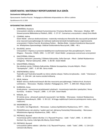 1 DZIEŃ MATKI. MATERIAŁY REPERTUAROWE DLA SZKÓŁ Zestawienie bibliograficzne Opracowanie: Ewelina Pryciuk. Pedagogiczna Biblioteka Wojewódzka im. KEN w Lublinie Opublikowano 05.12.2005 WYDAWNICTWA ZWARTE 1. BARAŃSKA, Krystyna Uroczystości szkolne w edukacji humanistycznej / Krystyna Barańska. - Warszawa : Wydaw. SBP Stowarzyszenia Bibliotekarzy Polskich, 2002. - S. 27-37 : Scenariusz uroczystości z okazji Dnia Matki 2. CZARNIK, Halina Dzień Matki : wiersze okolicznościowe : materiały metodyczno-literackie dla nauczycieli przedszkoli oraz nauczania początkowego do realizacji wybranej tematyki kompleksowej i organizowania uroczystości / Halina Czarnik, Bronisława Pytlarz. - Bielsko-Biała : Instytut Kształcenia Nauczycieli im. Władysława Spasowskiego. Oddział Doskonalenia Nauczycieli, 1986. - 46 s. 3. DŁUGOSZ, Janina Uroczystości i imprezy w procesie dydaktyczno-wychowawczym klas początkowych / Janina Długosz. - Rzeszów : ROSZE, 1992. - S. 237-267 : Dzień Matki : propozycja scenariusza uroczystości 4. GAŁCZYŃSKA, Elżbieta Uczcijmy wierszem i piosenką / Elżbieta Gałczyńska, Zofia Garczyk. - Płock : Zakład WydawniczoUsługowy - Marian Gałczyński, 1994. - S. 85-90 : Dzień Matki 5. GAŁCZYŃSKA, Elżbieta Na szkolnej scenie / Elżbieta Gałczyńska, Elżbieta Szczepańska, Urszula Wójcik.- Płock : "Korepetytor", 1997. - S. 87-98 : Serce matki 6. JERZYKOWSKA, Kalina Teatrałki czyli Teatralne kawałki na różne szkolne okazje / Kalina Jerzykowska. - Łódź : "Literatura", 2002. - S. 134-144 : Jak mama została królewną 7. KRUK, Helena Wybór wierszy okolicznościowych dla klas nauczania początkowego / Helena Kruk, Krystyna Lenkiewicz. - Warszawa : Wydaw. Szkolne i Pedagogiczne, 1977. - S. 209-218 : Mojej mamie 8. KURNICKA, Anna Kredą pisane : scenariusze przedstawień szkolnych : inscenizacje teatralne i poetyckie / Anna Kurnicka. - Kraków : "Impuls", 1999. - S. 97-104 : Dzień Matki 9. MOŁDA, Jan W rytmie serca : almanach poetycki nauczycieli / Jan Mołda. - Warszawa : Instytut Wydawniczy Związków Zawodowych, 1983. - S. 95-122 : W kręgu najbliższych (wiersze poświęcone matce, ojcu, rodzicom) 10. NAGROBIECKI, Jan Do matki / Jan Nagrobiecki. - Warszawa : Ludowa Spółdzielnia Wydawnicza, 1977. - 318 s. 11. PEGAZEM przez rok szkolny / wybór pod red. Adrianny Panieckiej-Piekutowskiej. - Warszawa : Młodzieżowa Agencja Wydawnicza, 1982. - 695 s. 12. PRZYMUS, Ryszard Inscenizacje pełne radości dla klas 1-3 / Ryszard Przymus. - Łódź : "Juka", 1995. - S. 145-158 : Kocham Cię, mamo; Cała łąka dla Mamy; Dzień Matki 13. PRZYMUS, Ryszard Uroczystości pełne radości : (dla klas 1-3) / Ryszard Przymus. - Łódź : "Juka", 1995. - S. 114-123 : Uśmiech dla Mamy 2 14. SADKOWSKA-MAZURKIEWICZ, Helena Wybór wierszy na uroczystości szkolne : klasy 5-8 / Helena Sadkowska-Mazurkiewicz. - Warszawa : Wydaw. Szkolne i Pedagogiczne, 1974. - 205 s. 15. ŚNIECIŃSKI, Józef Marek Bicie serca : wybór wierszy okolicznościowych dla wszystkich klas szkoły podstawowej / Józef Marek Śnieciński. - Warszawa : "Żak", 1994. - S. 151-162 : Święto Matki 16. ŚNIECIŃSKI, Józef Marek KochaK świat : wiersze okolicznościowe dla przedszkoli / Józef Marek Śnieciński. - Warszawa : "Żak", 1994. - S. 116-132 : Dzień Mamy 17. ŚNIECIŃSKI, Józef Marek Słowa jak kwiaty / Józef Marek Śnieciński. - Warszawa : "Żak", 1995. - S. 117-128 : Uroczystości rodzinne 18. WIECH, Anna Poradnik dla wychowawców świetlic szkolnych / Anna Wiech, Zdzisław Wiech. - Warszawa : Wydaw. Szkolne i Pedagogiczne, 1986. - S. 290-292 : Impreza na Dzień Matki ARTYKUŁY Z CZASOPISM 19. ADAMCZAK, Krystyna Scenariusz uroczystości z okazji Dnia Matki / Krystyna Adamczak, Lucyna Kurczych // Życie Szkoły. 2002, nr 5, s. 282-288 20. BARYLSKA, Halina Dla Ciebie, Mamo / Halina Barylska // Poradnik Bibliotekarza. - 1998, nr 5, s. 14-16 21. CENCEK, Zofia Propozycje materiałów do inscenizacji / Zofia Cencek // Życie Szkoły. - 1991, nr 6, s. 365-377 22. CHOIŃSKI, Krzysztof Kwiaty dla Matki : sztuka w czterech obrazach / Krzysztof Choiński // Scena. - 1972, nr 2, s. 39-48 23. GIEWARTOWSKA, Danuta Dzień Matki : montaż poetycki / Danuta Giewartowska // Poradnik Bibliotekarza. - 1993, nr 3, s. 3134 24. JACHOWSKA-STASIAK, Jadwiga Dzień Matki : scenariusz uroczystości szkolnej / Jadwiga Jachowska-Stasiak // Biblioteka w Szkole. 1994, nr 4, s. 10-11 25. JANUCHTA, Barbara Maria Gdy myślę Matka... / Barbara Maria Januchta // Inspiracje. - 1988, nr 3, wkładka Biblioteczka Repertuarowa "Inspiracji" 26. KIEŁCZEWSKA, Małgorzata Barbara Dla naszych mam / Małgorzata Barbara Kiełczewska // Wychowawca. - 2002, nr 5, s. 26-27 27. KIERCZ, Joanna Propozycja scenariusza klasowej uroczystości z okazji Dnia Matki / Joanna Kiercz // Nauczanie Początkowe. - 1993/94, nr 5, s. 61-67 28. KOWALCZYK, Małgorzata Dzień Matki : scenariusz uroczystości / Małgorzata Kowalczyk // Poradnik Bibliotekarza. - 2002, nr 5, s. 31-33 29. KRUSZEWSKA, Mariola Gdzie jesteś, mamo? / Mariola Kruszewska // Wszystko dla Szkoły. - 2005, nr 3, s. 20-23 3 30. KUŚ, Urszula "Przynoszę kosz pełen kwiatów" Tobie Mamoo : montaż poetycko-muzyczny na Dzień Matki / Urszula Kuś // Poradnik Bibliotekarza. - 1995, nr 4, s. 20-22 31. KUŹNIK, Romana Scenariusz inscenizacji "Dziękuję za trud twój, mamo" / Romana Kuźnik // Życie Szkoły. - 2000, nr 5, s. 287-288 32. ŁOSIK, Zofia Święto Matki / Zofia Łosik // Życie Szkoły. - 1991, nr 5, s. 287-290 33. MICHALUK, Stanisław Dałam ci serce - abyś mógł wierzyK... : scenariusz poetycki dla zespołów małych form teatralnych szkół ponadpodstawowych - na Dzień Matki / Stanisław Michaluk // Biuletyn Pedagogiczny. Pałac Młodzieży w Katowicach. - 1989, nr 1, s. 11-16 34. MICHALUK, Stanisław Dla codziennej zwykłej mamy : scenariusz poetycki dla zespołów małych form teatralnych młodzieży szkół podstawowych - na Dzień Matki / Stanisław Michaluk // Biu