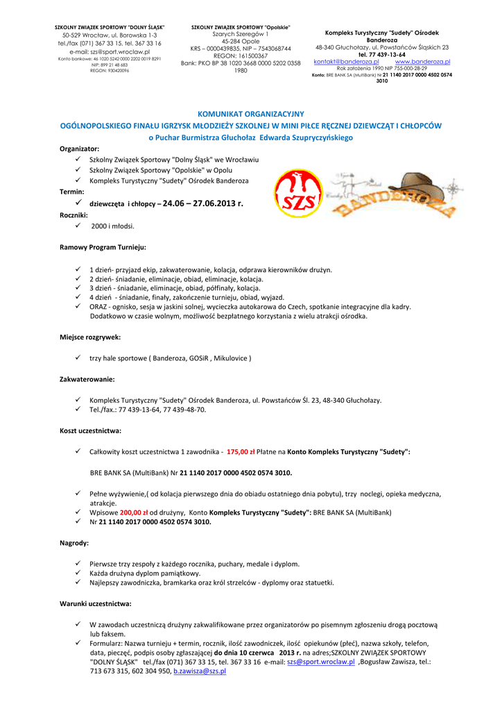 SZKOLNY ZWIĄZEK SPORTOWY "DOLNY ŚLĄSK" SZKOLNY ZWIĄZEK SPORTOWY "Opolskie" 50-529 Wrocław, ul. Borowska 1-3 tel./fax (071) 367 33 15, tel. 367 33 16 e-mail: [email protected] Szarych Szeregów 1 45-284 Opole KRS – 0000439835, NIP – 7543068744 REGON: 161500367 Bank: PKO BP 38 1020 3668 0000 5202 0358 1980 Konto bankowe: 46 1020 5242 0000 2202 0019 8291 NIP: 899 21 48 683 REGON: 930420096 Kompleks Turystyczny "Sudety" Ośrodek Banderoza 48-340 Głuchołazy, ul. Powstańców Śląskich 23 tel. 77 439-13-64 [email protected] www.banderoza.pl Rok założenia 1990 NIP 755-000-28-29 Konto: BRE BANK SA (MultiBank) Nr 21 1140 2017 0000 4502 0574 3010 KOMUNIKAT ORGANIZACYJNY OGÓLNOPOLSKIEGO FINAŁU IGRZYSK MŁODZIEŻY SZKOLNEJ W MINI PIŁCE RĘCZNEJ DZIEWCZĄT I CHŁOPCÓW o Puchar Burmistrza Głuchołaz Edwarda Szupryczyńskiego Organizator: Szkolny Związek Sportowy "Dolny Śląsk" we Wrocławiu Szkolny Związek Sportowy "Opolskie" w Opolu Kompleks Turystyczny "Sudety" Ośrodek Banderoza Termin: dziewczęta i chłopcy – 24.06 – 27.06.2013 r. Roczniki: 2000 i młodsi. Ramowy Program Turnieju: 1 dzień- przyjazd ekip, zakwaterowanie, kolacja, odprawa kierowników drużyn. 2 dzień- śniadanie, eliminacje, obiad, eliminacje, kolacja. 3 dzień - śniadanie, eliminacje, obiad, półfinały, kolacja. 4 dzień - śniadanie, finały, zakończenie turnieju, obiad, wyjazd. ORAZ - ognisko, sesja w jaskini solnej, wycieczka autokarowa do Czech, spotkanie integracyjne dla kadry. Dodatkowo w czasie wolnym, możliwość bezpłatnego korzystania z wielu atrakcji ośrodka. Miejsce rozgrywek: trzy hale sportowe ( Banderoza, GOSiR , Mikulovice ) Zakwaterowanie: Kompleks Turystyczny "Sudety" Ośrodek Banderoza, ul. Powstańców Śl. 23, 48-340 Głuchołazy. Tel./fax.: 77 439-13-64, 77 439-48-70. Koszt uczestnictwa: Całkowity koszt uczestnictwa 1 zawodnika - 175,00 zł Płatne na Konto Kompleks Turystyczny "Sudety": BRE BANK SA (MultiBank) Nr 21 1140 2017 0000 4502 0574 3010. Pełne wyżywienie,( od kolacja pierwszego dnia do obiadu ostatniego dnia pobytu), trzy noclegi, opieka medyczna, atrakcje. Wpisowe 200,00 zł od drużyny, Konto Kompleks Turystyczny "Sudety": BRE BANK SA (MultiBank) Nr 21 1140 2017 0000 4502 0574 3010. Nagrody: Pierwsze trzy zespoły z każdego rocznika, puchary, medale i dyplom. Każda drużyna dyplom pamiątkowy. Najlepszy zawodniczka, bramkarka oraz król strzelców - dyplomy oraz statuetki. Warunki uczestnictwa: W zawodach uczestniczą drużyny zakwalifikowane przez organizatorów po pisemnym zgłoszeniu drogą pocztową lub faksem. Formularz: Nazwa turnieju + termin, rocznik, ilość zawodniczek, ilość opiekunów (płeć), nazwa szkoły, telefon, data, pieczęć, podpis osoby zgłaszającej do dnia 10 czerwca 2013 r. na adres;SZKOLNY ZWIĄZEK SPORTOWY "DOLNY ŚLĄSK" tel./fax (071) 367 33 15, tel. 367 33 16 e-mail: [email protected] ,Bogusław Zawisza, tel.: 713 673 315, 602 304 950, [email protected] SZKOLNY ZWIĄZEK SPORTOWY "DOLNY ŚLĄSK" SZKOLNY ZWIĄZEK SPORTOWY "Opolskie" 50-529 Wrocław, ul. Borowska 1-3 tel./fax (071) 367 33 15, tel. 367 33 16 e-mail: [email protected] Szarych Szeregów 1 45-284 Opole KRS – 0000439835, NIP – 7543068744 REGON: 161500367 Bank: PKO BP 38 1020 3668 0000 5202 0358 1980 Konto bankowe: 46 1020 5242 0000 2202 0019 8291 NIP: 899 21 48 683 REGON: 930420096 Kompleks Turystyczny "Sudety" Ośrodek Banderoza 48-340 Głuchołazy, ul. Powstańców Śląskich 23 tel. 77 439-13-64 [email protected] www.banderoza.pl Rok założenia 1990 NIP 755-000-28-29 Konto: BRE BANK SA (MultiBank) Nr 21 1140 2017 0000 4502 0574 3010 Uczestnictwo: Drużynę stanowią uczennice jednej szkoły podstawowej urodzone w 2000 i młodsi. Zespół liczy 16 zawodniczek (w całym turnieju) Przepisy gry: Na boisku może przebywać 7 zawodników/czek łącznie z bramkarzem . Czas gry: 2x 15 minut + do 5 minut przerwa. Piłka IHF rozmiar 1 (50-52cm) Obowiązują przepisy ZPRP. Organizatorzy