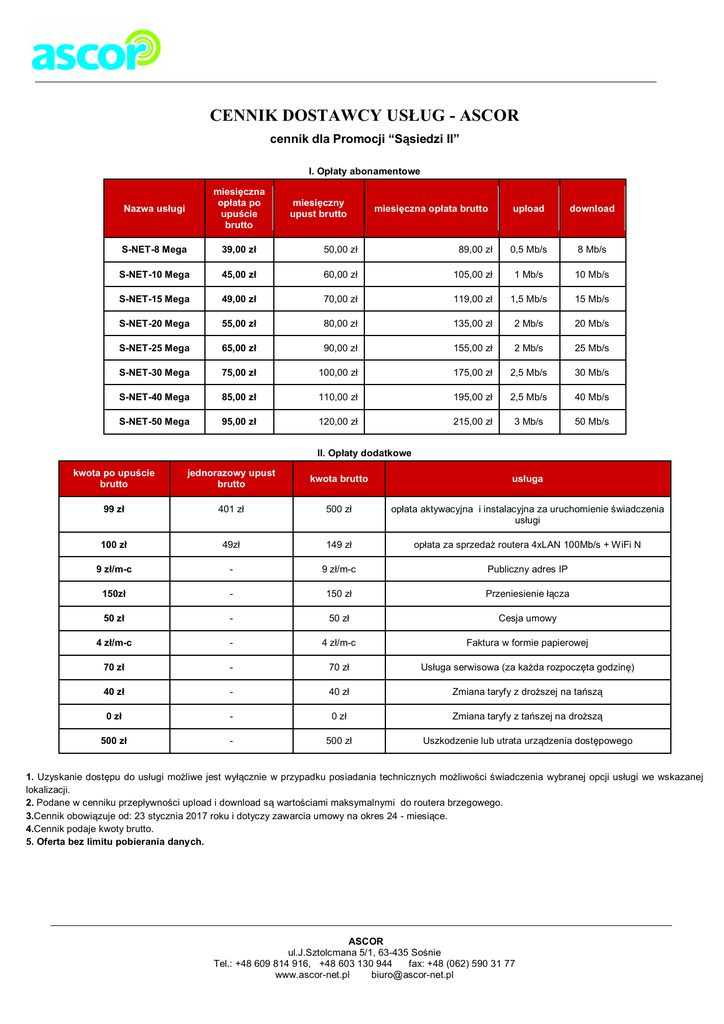 CENNIK DOSTAWCY USŁUG - ASCOR cennik dla Promocji “Sąsiedzi II” I. Opłaty abonamentowe Nazwa usługi miesięczna opłata po upuście brutto S-NET-8 Mega 39,00 zł 50,00 zł S-NET-10 Mega 45,00 zł S-NET-15 Mega miesięczny upust brutto miesięczna opłata brutto upload download 89,00 zł 0,5 Mb/s 8 Mb/s 60,00 zł 105,00 zł 1 Mb/s 10 Mb/s 49,00 zł 70,00 zł 119,00 zł 1,5 Mb/s 15 Mb/s S-NET-20 Mega 55,00 zł 80,00 zł 135,00 zł 2 Mb/s 20 Mb/s S-NET-25 Mega 65,00 zł 90,00 zł 155,00 zł 2 Mb/s 25 Mb/s S-NET-30 Mega 75,00 zł 100,00 zł 175,00 zł 2,5 Mb/s 30 Mb/s S-NET-40 Mega 85,00 zł 110,00 zł 195,00 zł 2,5 Mb/s 40 Mb/s S-NET-50 Mega 95,00 zł 120,00 zł 215,00 zł 3 Mb/s 50 Mb/s II. Opłaty dodatkowe kwota po upuście brutto jednorazowy upust brutto kwota brutto usługa 99 zł 401 zł 500 zł opłata aktywacyjna i instalacyjna za uruchomienie świadczenia usługi 100 zł 49zł 149 zł opłata za sprzedaż routera 4xLAN 100Mb/s + WiFi N 9 zł/m-c - 9 zł/m-c Publiczny adres IP 150zł - 150 zł Przeniesienie łącza 50 zł - 50 zł Cesja umowy 4 zł/m-c - 4 zł/m-c Faktura w formie papierowej 70 zł - 70 zł Usługa serwisowa (za każda rozpoczęta godzinę) 40 zł - 40 zł Zmiana taryfy z droższej na tańszą 0 zł - 0 zł Zmiana taryfy z tańszej na droższą 500 zł - 500 zł Uszkodzenie lub utrata urządzenia dostępowego 1. Uzyskanie dostępu do usługi możliwe jest wyłącznie w przypadku posiadania technicznych możliwości świadczenia wybranej opcji usługi we wskazanej lokalizacji. 2. Podane w cenniku przepływności upload i download są wartościami maksymalnymi do routera brzegowego. 3.Cennik obowiązuje od: 23 stycznia 2017 roku i dotyczy zawarcia umowy na okres 24 - miesiące. 4.Cennik podaje kwoty brutto. 5. Oferta bez limitu pobierania danych. ASCOR ul.J.Sztolcmana 5/1, 63-435 Sośnie Tel.: +48 609 814 916, +48 603 130 944 fax: +48 (062) 590 31 77 www.ascor-net.pl [email protected]