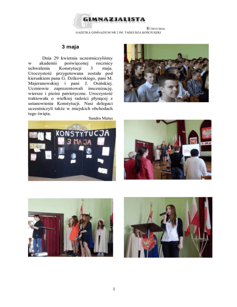 8//2015/2016 GAZETKA GIMNAZJUM NR 2 IM. TADEUSZA KOŚCIUSZKI 3 maja Dnia 29 kwietnia uczestniczyliśmy w akademii poświęconej rocznicy uchwalenia Konstytucji 3 maja. Uroczystość przygotowana została pod kierunkiem pana G. Dzikowskiego, pani M. Majeranowskiej i pani J. Osińskiej. Uczniowie zaprezentowali inscenizację, wiersze i pieśni patriotyczne. Uroczystość traktowała o wielkiej radości płynącej z ustanowienia Konstytucji. Nasi delegaci uczestniczyli także w miejskich obchodach tego święta. Sandra Matus 1 8//2015/2016 GAZETKA GIMNAZJUM NR 2 IM. TADEUSZA KOŚCIUSZKI Czy Polacy dbają o język narodowy? Językiem polskim mówi około 44 milionów ludzi na świecie, łącznie z Polakami za granicą. Nasza mowa odróżnia nas od innych narodów, posługiwanie się językiem ojczystym jest postrzegane jako patriotyzm. Idąc ulicą, słyszę jednak wiele zniekształceń i rażących błędów, które ludzie popełniają w myśl zasady: przecież i tak wszyscy wiedzą, o co chodzi. Jedni postrzegają to zjawisko pozytywnie, bo język jest przecież żywy i zmienia się z upływem lat; przecież nikt nie zrozumiałby rozmowy ze średniowiecznym mnichem. Z drugiej strony język polski ulegający zbyt wielu zniekształceniom przestaje być rzeczywiście polski. Czy Polacy dbają i czy powinni dbać o poprawna polszczyznę? Ludzie z zagranicy określają język polski jako „miękki, pełen uroczej melodyki, rytmu, różnych intonacji” - cytat pochodzi z wywiadu z czeską aktorką, Anną Geislerovą. U Polaków panuje przekonanie, że język polski jest jednym z najtrudniejszych języków, że ktoś, kto nie wychował się w Polsce, nigdy nie będzie nim mówił stuprocentowo poprawnie. Wynika to m. in. z tego, że Polacy mają skłonność do poprawiania innych i przykładania wagi ido wypowiedzi innych. Na pewno nieraz spotkaliśmy się z (czasem bardzo dobitnym) krytykowaniem formy „pisze” zamiast „jest napisane”. W jednym ze swoich programów telewizyjnych prof. Miodek powiedział, że obie formy są poprawne, mimo to dalej piętnuje się osoby używające tej pierwszej. Sprawa ma się podobnie w takich parach wyrazów jak „otworzyłem” i „otwarłem” czy „rękami” i „rękoma”, jednak zawsze znajdzie się ktoś mówiący hiperpoprawnie, namiętnie używający bardzo oficjalnej mowy oraz wykręcający twarz na głosce „ę”. 2 8//2015/2016 GAZETKA GIMNAZJUM NR 2 IM. TADEUSZA KOŚCIUSZKI Dużo mówi się także o wyrazach obcego pochodzenia, które naród polski chłonie niczym gąbka. „Polacy nie gęsi, swój język mają” - mówił Mikołaj Rej. Okazuje się, że „swój język” staje się coraz bardziej „nieswój”. Dawniejszy „salon samochodowy” staje się teraz „auto salonem”, a „plan biznesowy” staje się „biznesplanem”. Idąc w tym kierunku, możemy zacząć mówić „zdrowie - ośrodek” czy „pomidor - zupa”. Kiedyś mawiano: „ach!”, „och!”, „ojej!” - wszystkie te zwroty zastąpiono skrótem „wow”. Zawężamy też zakres znaczeń wyrazów wieloznacznych: od niedawna wyraz „dieta” nie jest już planem jadłospisu, ale w powszechnym przekonaniu oznacza tylko plan odchudzania. Temat zastępowania wyrazu „kocham” wyrazem „lovciam”, który jakoby nie jest wyrazem, tylko błędnie zapisanym wyrazem „love” wolę przemilczeć. Czy to rzeczywiście źle? Kiedyś próbowano z tym walczyć, jednak zrezygnowano po jakimś czasie. Przecież kto chciałby zamiast z „parasolem” chodzić z „deszczochronem” lub zamiast układać przed domem „kostkę” układać „płytki chodnikowe”? Bardzo razi w oczy także skracanie nawet krótkich wyrażeń. Dawniej mówiono z szacunkiem do „Ciebie”, wkrótce zaczęto pisać „cię”, a niedawno rozpowszechniło się pisanie „cb”. Co to znaczy „cb”? CB radio? Moim zdaniem, zwracanie się do drugiej osoby w ten sposób jest oznaką braku szacunku. Dzisiejsza technologia pozwala dyktować telefonowi, co ma wpisać, dlaczego więc ludzie nagminnie skracają wszystkie napisane wyrazy do nieistniejących skrótów? Dawniej, żeby napisać literę „c”, należało w telefonie nacisnąć klawisz „2” aż cztery razy, a ludzie pisali poprawniej niż dziś. Przecież każdy wolałby otrzymać wiadomość „Kocham Cię, do zobaczenia później” niż „kc dzp”. Jest to bardzo wygodne, ale przy dzisiejszej technologii napisanie całego 3 wyrazu, nie mówiąc już o polskich znakach, nie powinno sprawiać problemu. Esej ucznia klasy II b Gimnazjum nr 1 w Szubinie zamieszczony w czasopiśmie Victor Gimnazjalista Drzwi otwarte Dnia 6 maja gościliśmy w naszym gimnazjum szóstoklasistów ze Szkoły Podstawowej nr 4 w Chełmnie. Chcieliśmy pokazać im szkołę i gimnazjalne życie. Wszystko po to, aby od września stali się uczniami naszego gimnazjum. W programie spotkania były: prezentacja multimedialna, śpiewy, recytacje, pokazy gimnastyczne, zabawy sportowe i przedstawienie Laleczka z porcelany w wykonaniu szkolnego koła teatralnego. 8//2015/2016 GAZETKA GIMNAZJUM NR 2 IM. TADEUSZA KOŚCIUSZKI 4 8//2015/2016 GAZETKA GIMNAZJUM NR 2 IM. TADEUSZA KOŚCIUSZKI Dziady W dniu 4 maja 2016 r. gościliśmy aktorów Teatru Młodego Pokolenia z Białegostoku, którzy przedstawili nam spektakl Dziady część II będący inscenizacją dramatu Adama Mickiewicza. Sztuka osadzona jest w realiach XIX wiecznej Litwy i jest przede wszystkim obrazem niezwykłego obrzędu, tajemniczego rytuału, w którym żywi nawiązują kontakt z umarłymi, świat realny przenika się i zespala z nadzmysłowym, przebogatym w emocje i znaczenia. Trójka utalentowanych aktorów zmierzyła się z trudnym tekstem i przystosowała go w sposób ciekawy dla współczesnego widza. Wizyta aktorów okazała się dla nas pożyteczną lekcją i ciekawym doświadczeniem. Sztuka dała uczniom możliwość podpatrzenia aktorskiego rzemiosła, stanowiła okazję do przypomnien