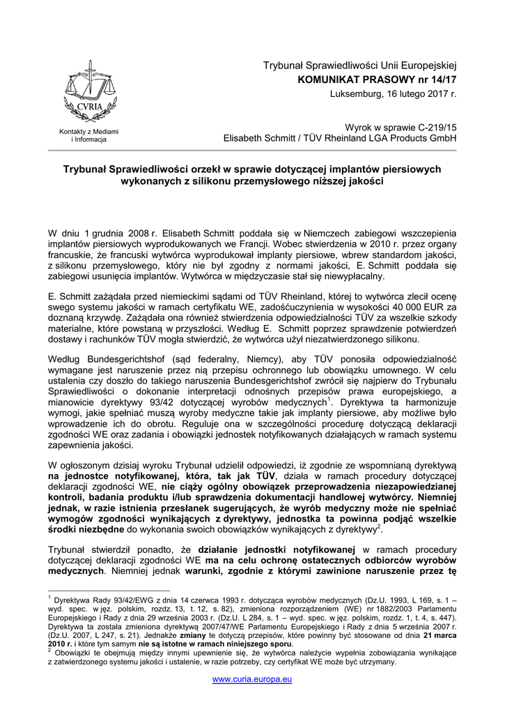 Trybunał Sprawiedliwości Unii Europejskiej KOMUNIKAT PRASOWY nr 14/17 Luksemburg, 16 lutego 2017 r. Kontakty z Mediami i Informacja Wyrok w sprawie C-219/15 Elisabeth Schmitt / TÜV Rheinland LGA Products GmbH Trybunał Sprawiedliwości orzekł w sprawie dotyczącej implantów piersiowych wykonanych z silikonu przemysłowego niższej jakości W dniu 1 grudnia 2008 r. Elisabeth Schmitt poddała się w Niemczech zabiegowi wszczepienia implantów piersiowych wyprodukowanych we Francji. Wobec stwierdzenia w 2010 r. przez organy francuskie, że francuski wytwórca wyprodukował implanty piersiowe, wbrew standardom jakości, z silikonu przemysłowego, który nie był zgodny z normami jakości, E. Schmitt poddała się zabiegowi usunięcia implantów. Wytwórca w międzyczasie stał się niewypłacalny. E. Schmitt zażądała przed niemieckimi sądami od TÜV Rheinland, której to wytwórca zlecił ocenę swego systemu jakości w ramach certyfikatu WE, zadośćuczynienia w wysokości 40 000 EUR za doznaną krzywdę. Zażądała ona również stwierdzenia odpowiedzialności TÜV za wszelkie szkody materialne, które powstaną w przyszłości. Według E. Schmitt poprzez sprawdzenie potwierdzeń dostawy i rachunków TÜV mogła stwierdzić, że wytwórca użył niezatwierdzonego silikonu. Według Bundesgerichtshof (sąd federalny, Niemcy), aby TÜV ponosiła odpowiedzialność wymagane jest naruszenie przez nią przepisu ochronnego lub obowiązku umownego. W celu ustalenia czy doszło do takiego naruszenia Bundesgerichtshof zwrócił się najpierw do Trybunału Sprawiedliwości o dokonanie interpretacji odnośnych przepisów prawa europejskiego, a mianowicie dyrektywy 93/42 dotyczącej wyrobów medycznych1. Dyrektywa ta harmonizuje wymogi, jakie spełniać muszą wyroby medyczne takie jak implanty piersiowe, aby możliwe było wprowadzenie ich do obrotu. Reguluje ona w szczególności procedurę dotyczącą deklaracji zgodności WE oraz zadania i obowiązki jednostek notyfikowanych działających w ramach systemu zapewnienia jakości. W ogłoszonym dzisiaj wyroku Trybunał udzielił odpowiedzi, iż zgodnie ze wspomnianą dyrektywą na jednostce notyfikowanej, która, tak jak TÜV, działa w ramach procedury dotyczącej deklaracji zgodności WE, nie ciąży ogólny obowiązek przeprowadzenia niezapowiedzianej kontroli, badania produktu i/lub sprawdzenia dokumentacji handlowej wytwórcy. Niemniej jednak, w razie istnienia przesłanek sugerujących, że wyrób medyczny może nie spełniać wymogów zgodności wynikających z dyrektywy, jednostka ta powinna podjąć wszelkie środki niezbędne do wykonania swoich obowiązków wynikających z dyrektywy2. Trybunał stwierdził ponadto, że działanie jednostki notyfikowanej w ramach procedury dotyczącej deklaracji zgodności WE ma na celu ochronę ostatecznych odbiorców wyrobów medycznych. Niemniej jednak warunki, zgodnie z którymi zawinione naruszenie przez tę 1 Dyrektywa Rady 93/42/EWG z dnia 14 czerwca 1993 r. dotycząca wyrobów medycznych (Dz.U. 1993, L 169, s. 1 – wyd. spec. w jęz. polskim, rozdz. 13, t. 12, s. 82), zmieniona rozporządzeniem (WE) nr 1882/2003 Parlamentu Europejskiego i Rady z dnia 29 września 2003 r. (Dz.U. L 284, s. 1 – wyd. spec. w jęz. polskim, rozdz. 1, t. 4, s. 447). Dyrektywa ta została zmieniona dyrektywą 2007/47/WE Parlamentu Europejskiego i Rady z dnia 5 września 2007 r. (Dz.U. 2007, L 247, s. 21). Jednakże zmiany te dotyczą przepisów, które powinny być stosowane od dnia 21 marca 2010 r. i które tym samym nie są istotne w ramach niniejszego sporu. 2 Obowiązki te obejmują między innymi upewnienie się, że wytwórca należycie wypełnia zobowiązania wynikające z zatwierdzonego systemu jakości i ustalenie, w razie potrzeby, czy certyfikat WE może być utrzymany. www.curia.europa.eu jednostkę obowiązków ciążących na niej na mocy tej dyrektywy, w ramach tej procedury może czynić ją odpowiedzialną wobec tych odbiorców, są objęte prawem krajowym, z zastrzeżeniem zasad równoważności i skuteczności. UWAGA: Odesłanie prejudycjalne pozwala sądom państw członkowskich, w ramach rozpatrywanego przez nie sporu, zwrócić się do Trybunału z pytaniem o wykładnię prawa Unii lub o ocenę ważności aktu Unii. Trybunał nie rozpoznaje sporu krajowego. Do sądu krajowego należy rozstrzygnięcie sprawy zgodnie z orzeczeniem Trybunału. Orzeczenie to wiąże w ten sam sposób inne sądy krajowe, które spotkają się z podobnym problemem. Dokument nieoficjalny, sporządzony na użytek mediów, który nie wiąże Trybunału Sprawiedliwości. Pełny tekst wyroku znajduje się na stronie internetowej CURIA w dniu ogłoszenia. Osoba odpowiedzialna za kontakty z mediami: Ireneusz Kolowca (+352) 4303 2793 Nagranie wideo z ogłoszenia wyroku jest dostępne przez „Europe by Satellite” (+32) 22964106 www.curia.europa.eu
